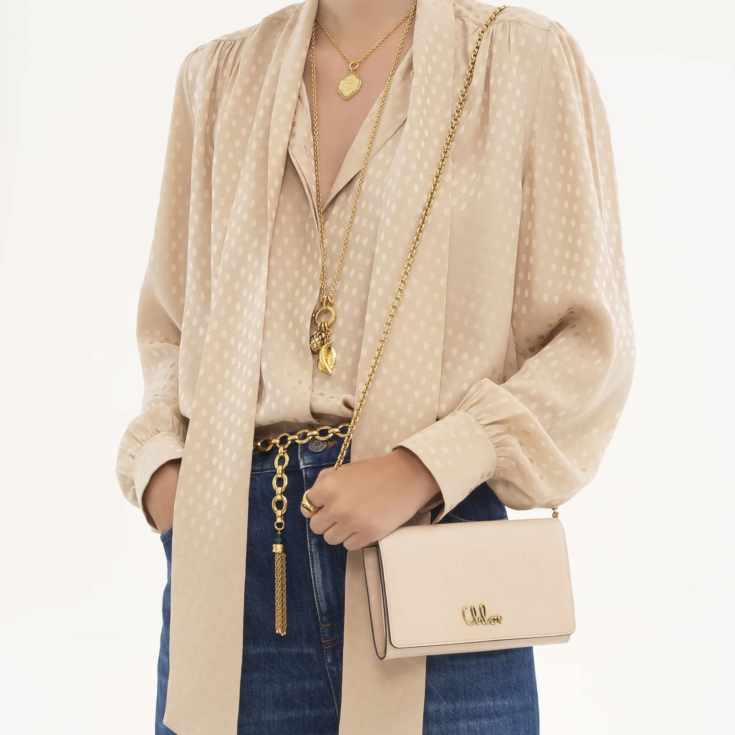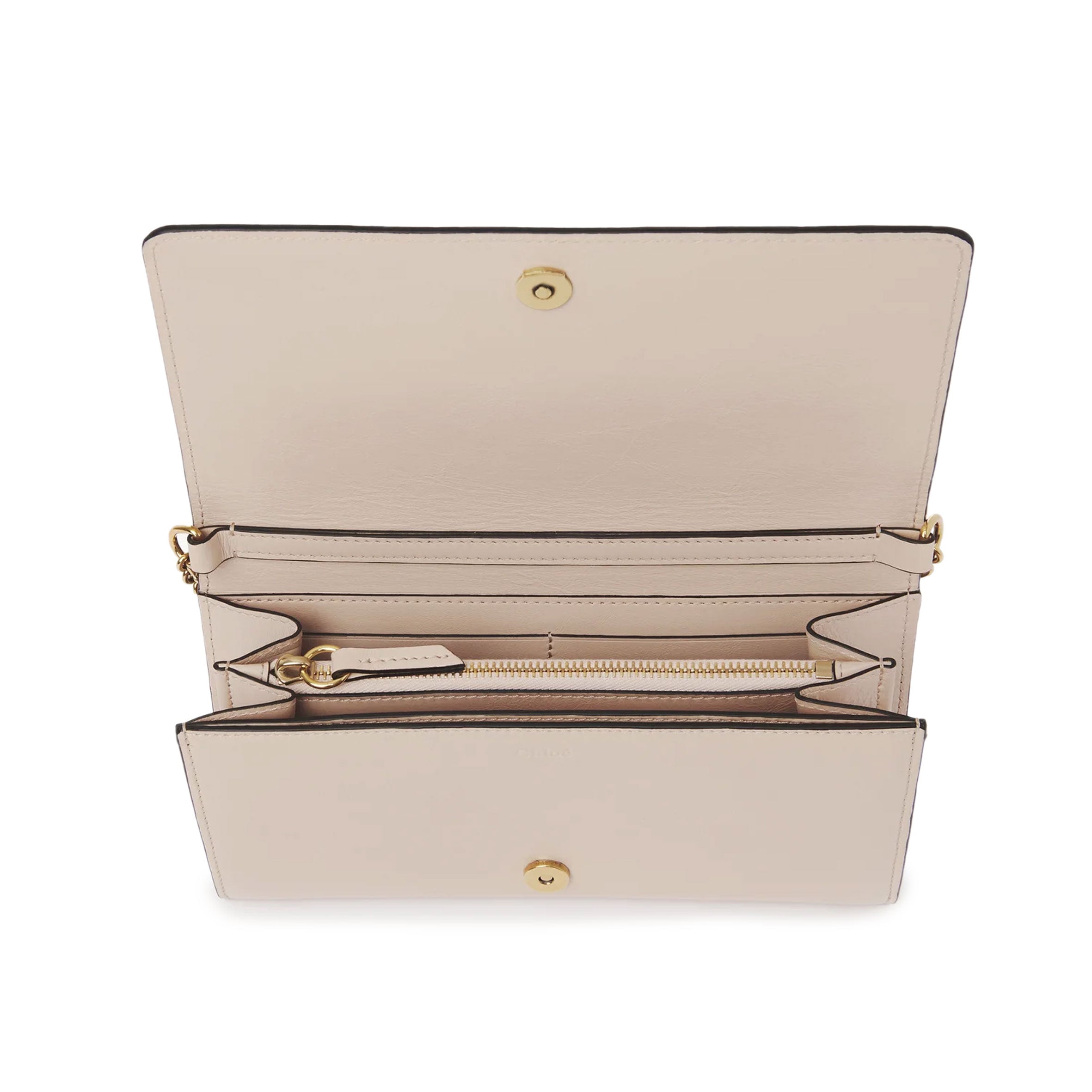 Crafted from shiny calfskin, the Chloé Iconic flap wallet on chain combines a minimalist silhouette with a metallic signature from the Maison's archives.
