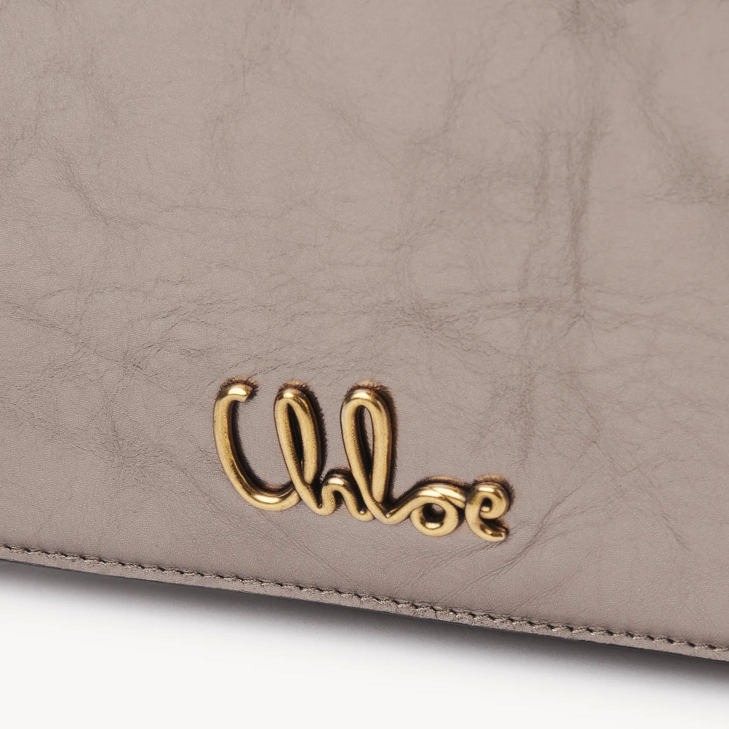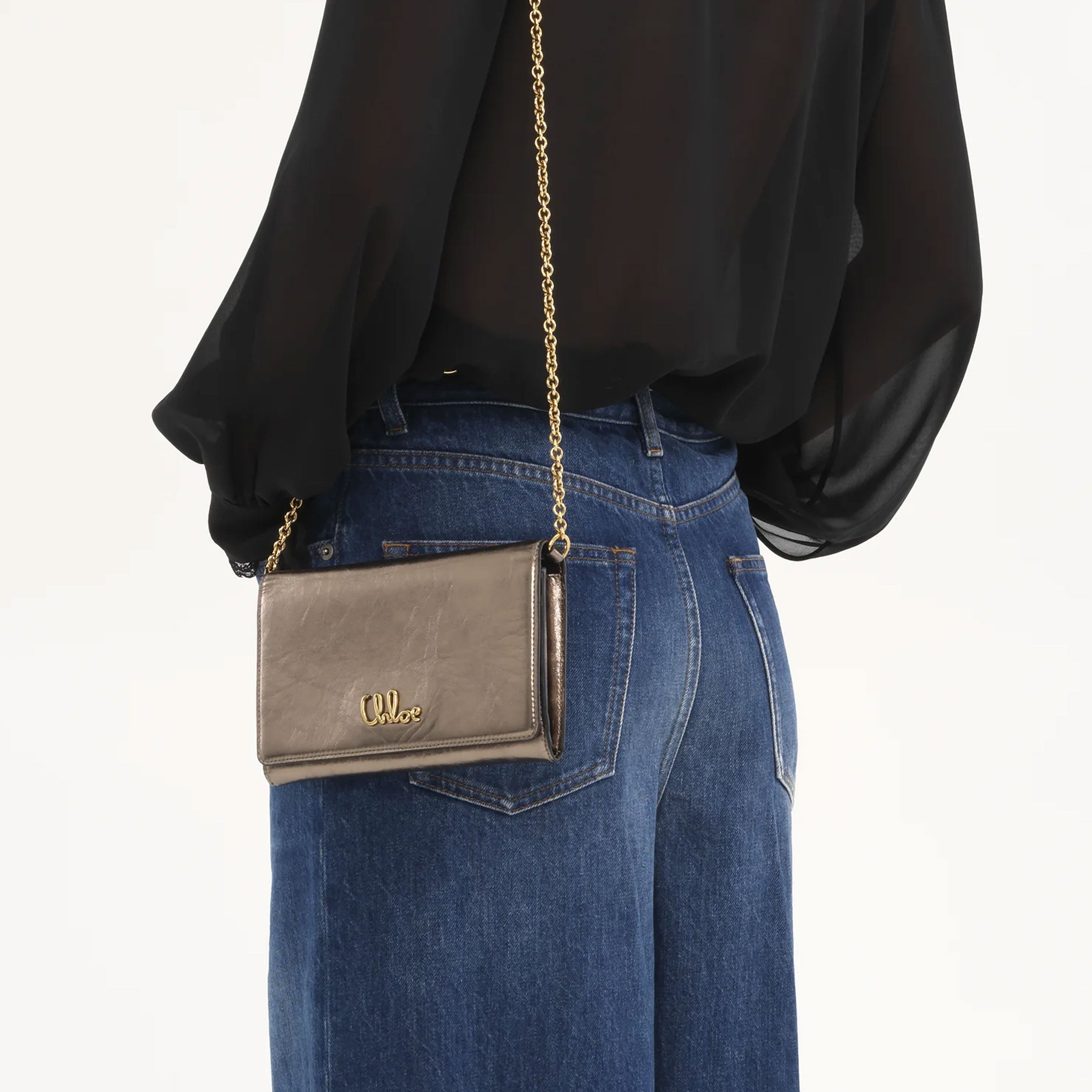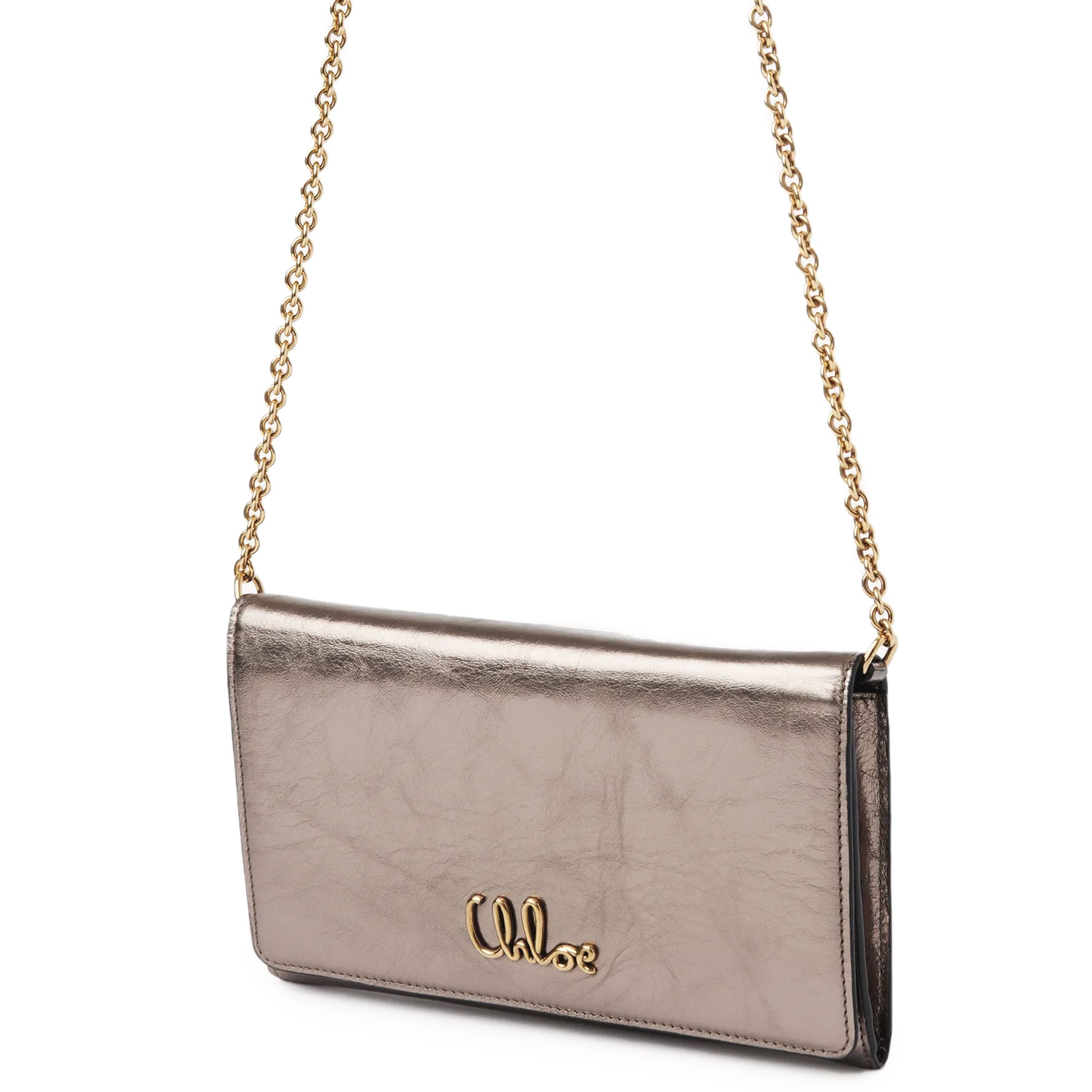 Crafted from metallized calfskin, the Chloé Iconic flap wallet on chain combines a minimalist silhouette with a metallic signature from the Maison's archives.