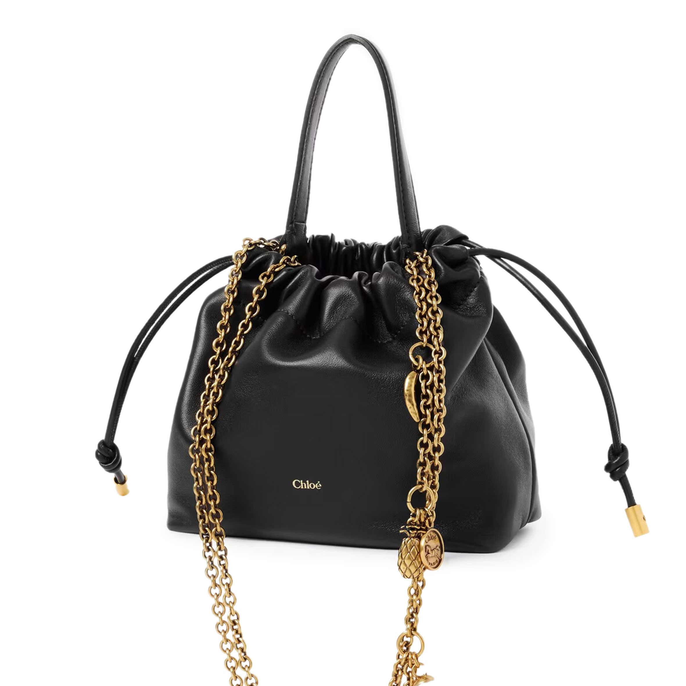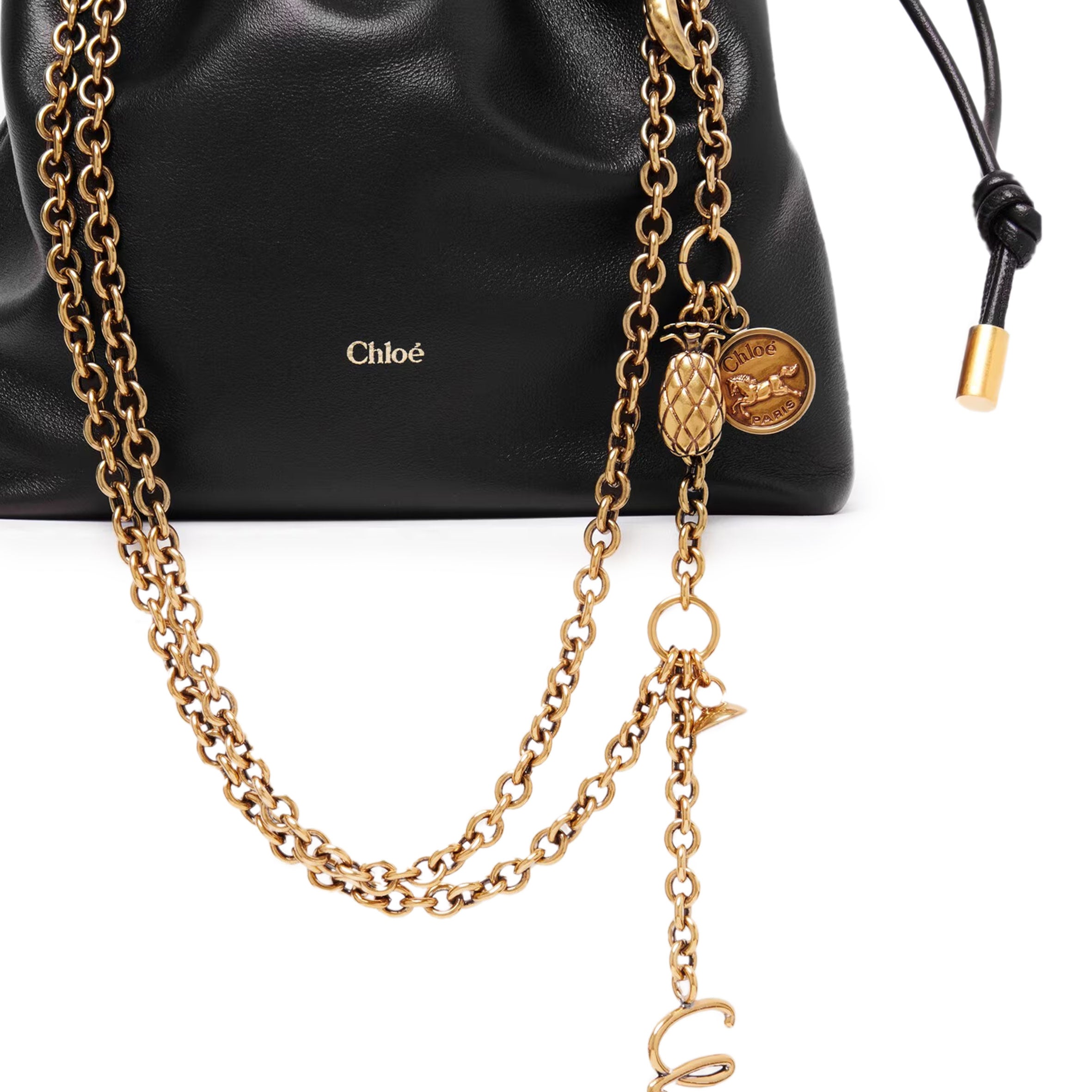 This mini Chloé Icons shoulder bag with chain is crafted from smooth nappa lambskin with a drawstring closure. In a nod to the Maison's DNA, the gold-tone chain is embellished with a Horse Medal, miniature charms and the Chloé signature.
