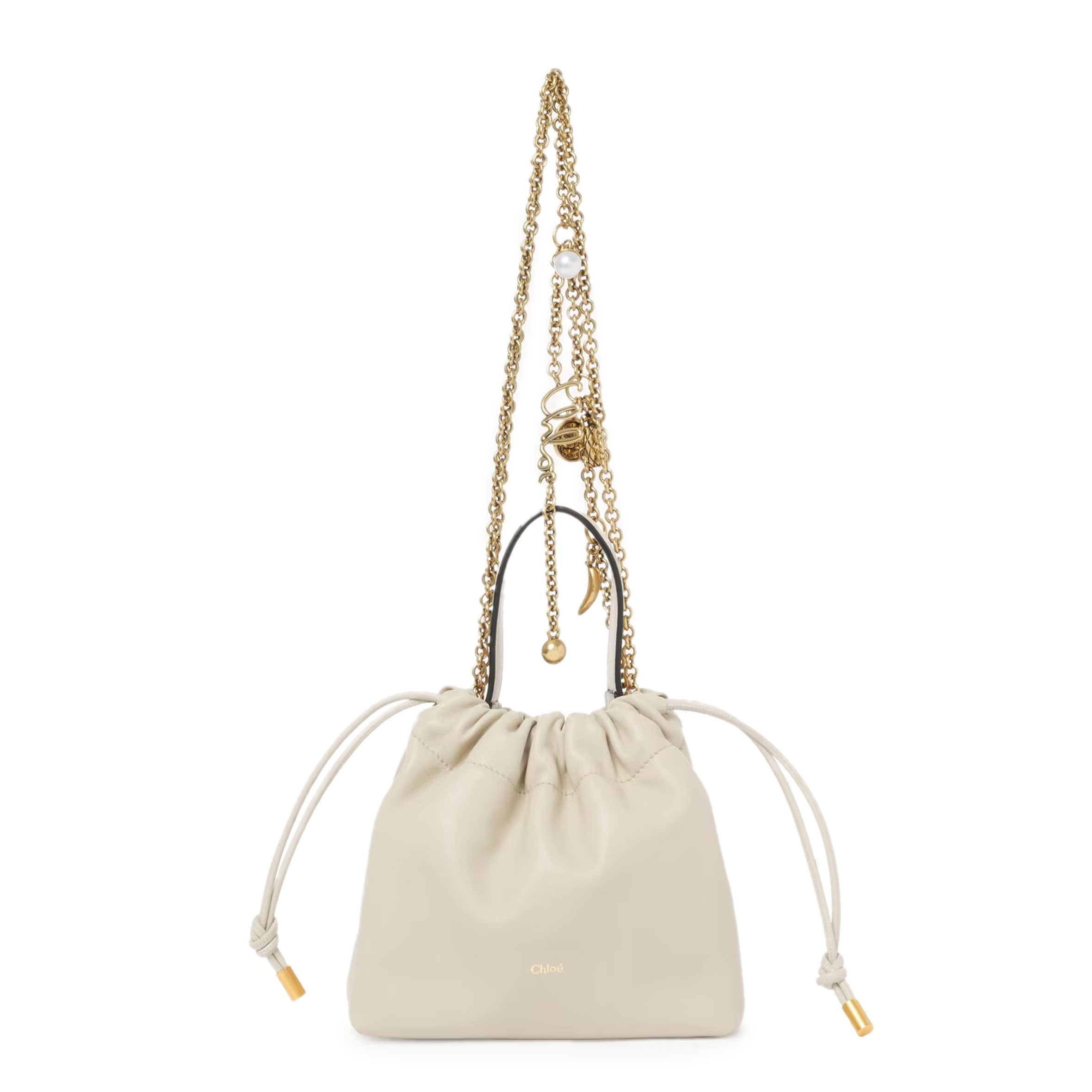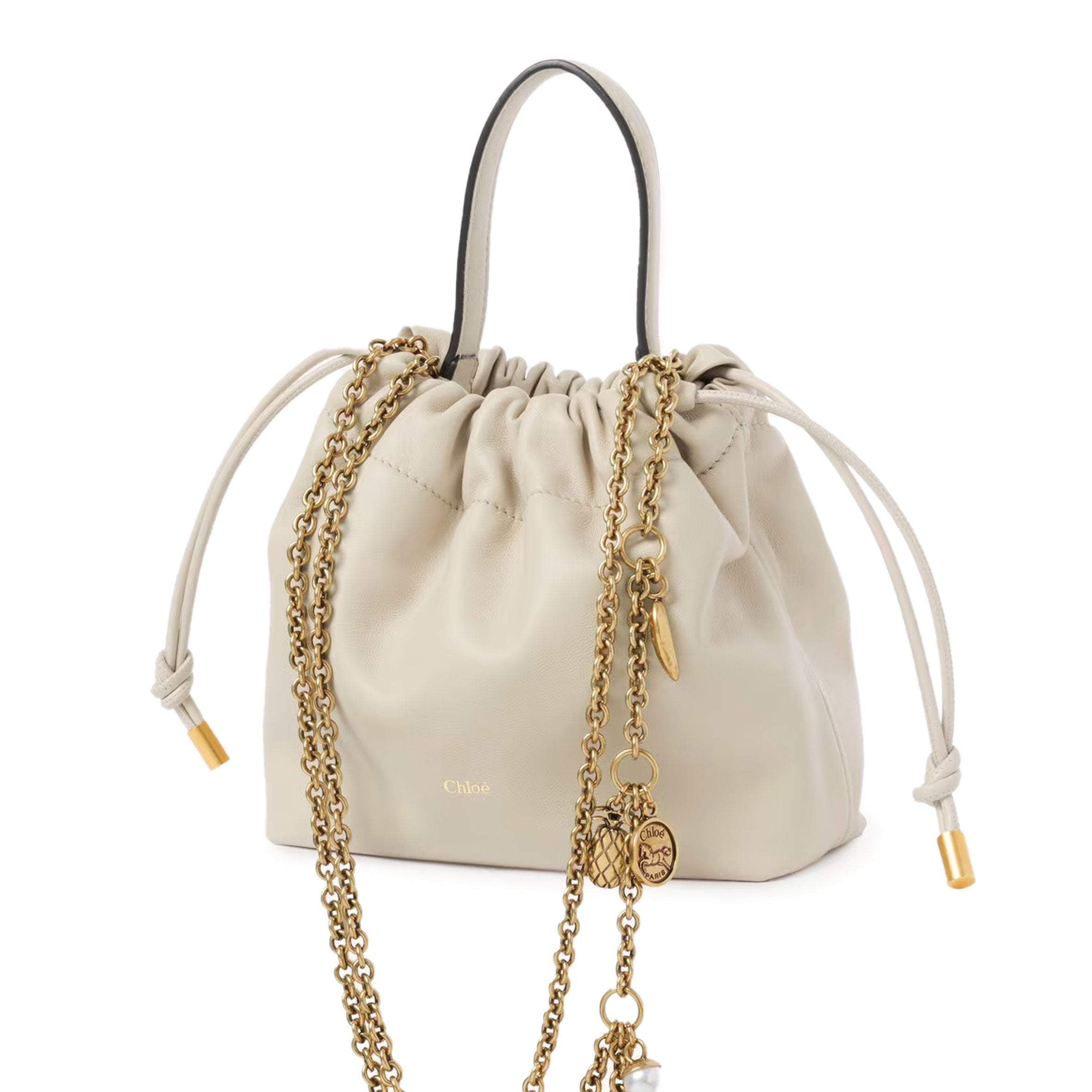 This mini Chloé Icons shoulder bag with chain is crafted from smooth nappa lambskin with a drawstring closure. In a nod to the Maison's DNA, the gold-tone chain is embellished with a Horse Medal, miniature charms and the Chloé signature.