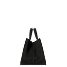 Wide handled tote bag in softly textured cotton twill canvas with two interior patch pockets, leather top handles, and palladium-plated center snap closure.