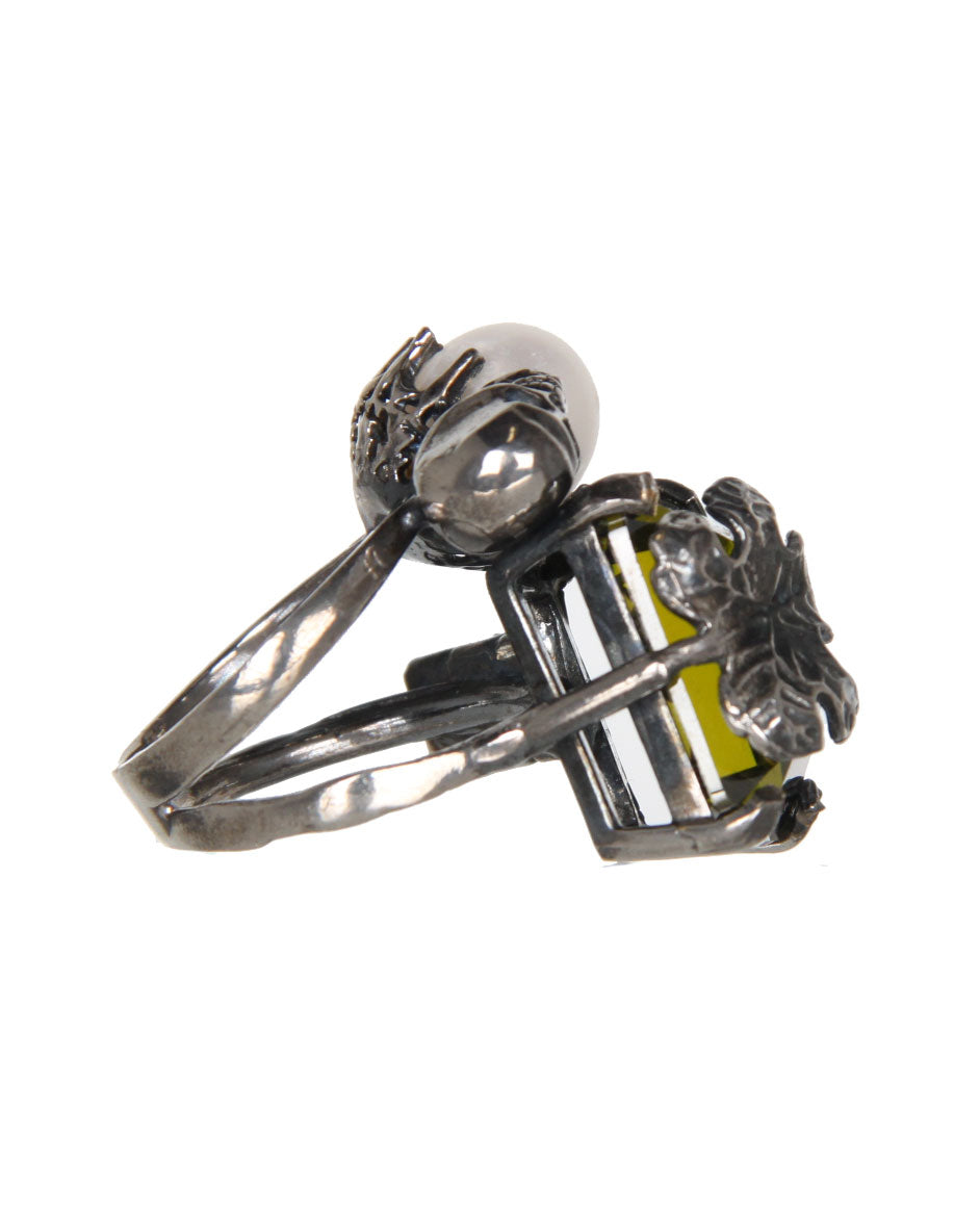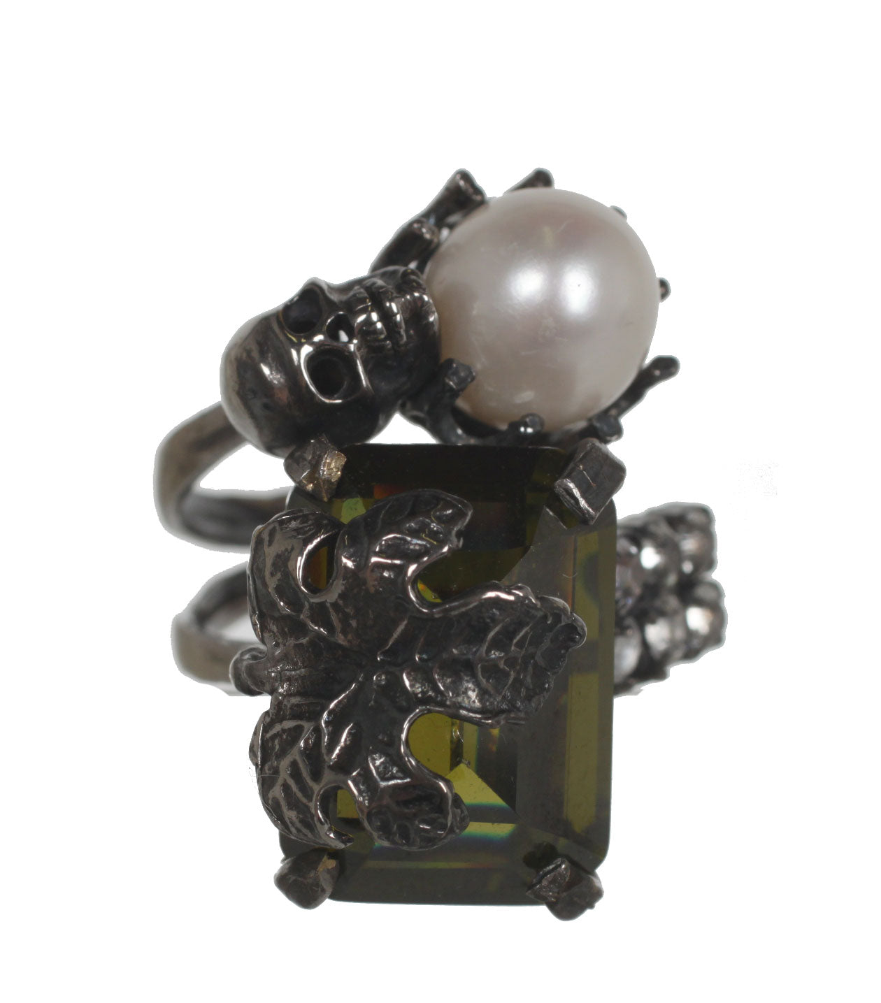 Silver ring with skull and leaf details and zircons and cultured pearl.