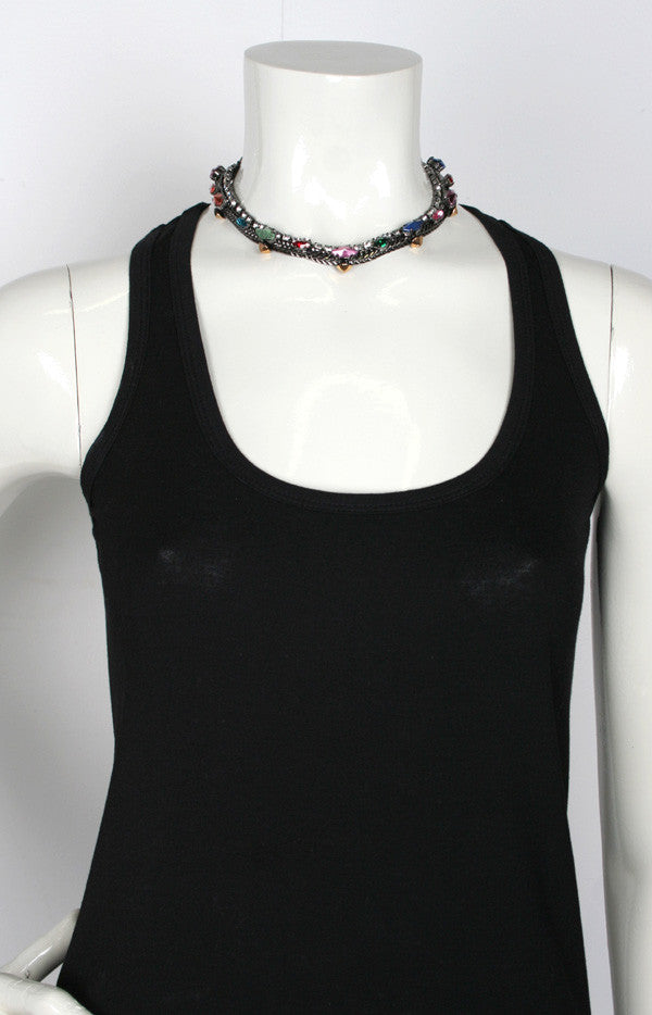 Antique brass necklace. Multi-shaped and colored crystal accents. Lobster clasp closure.