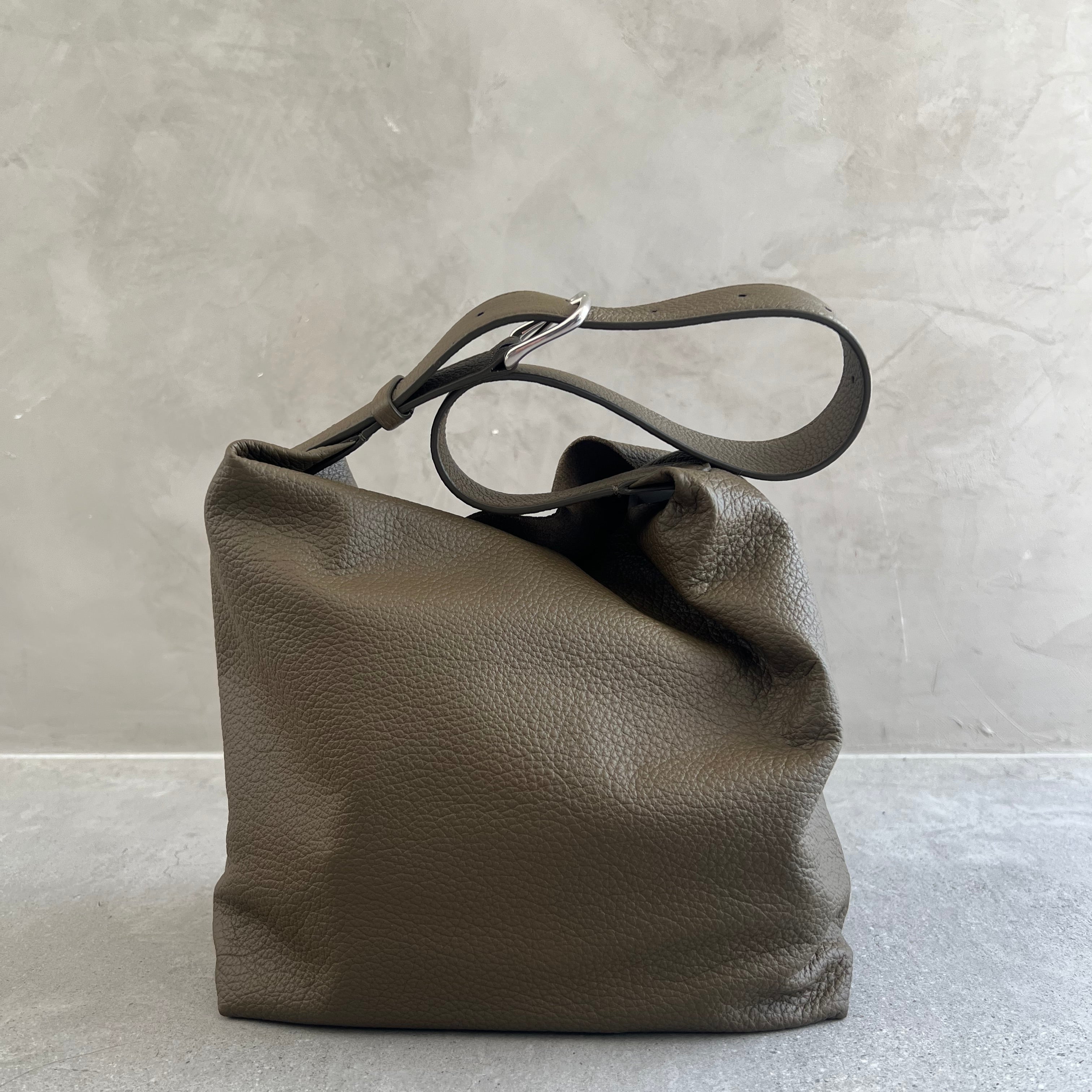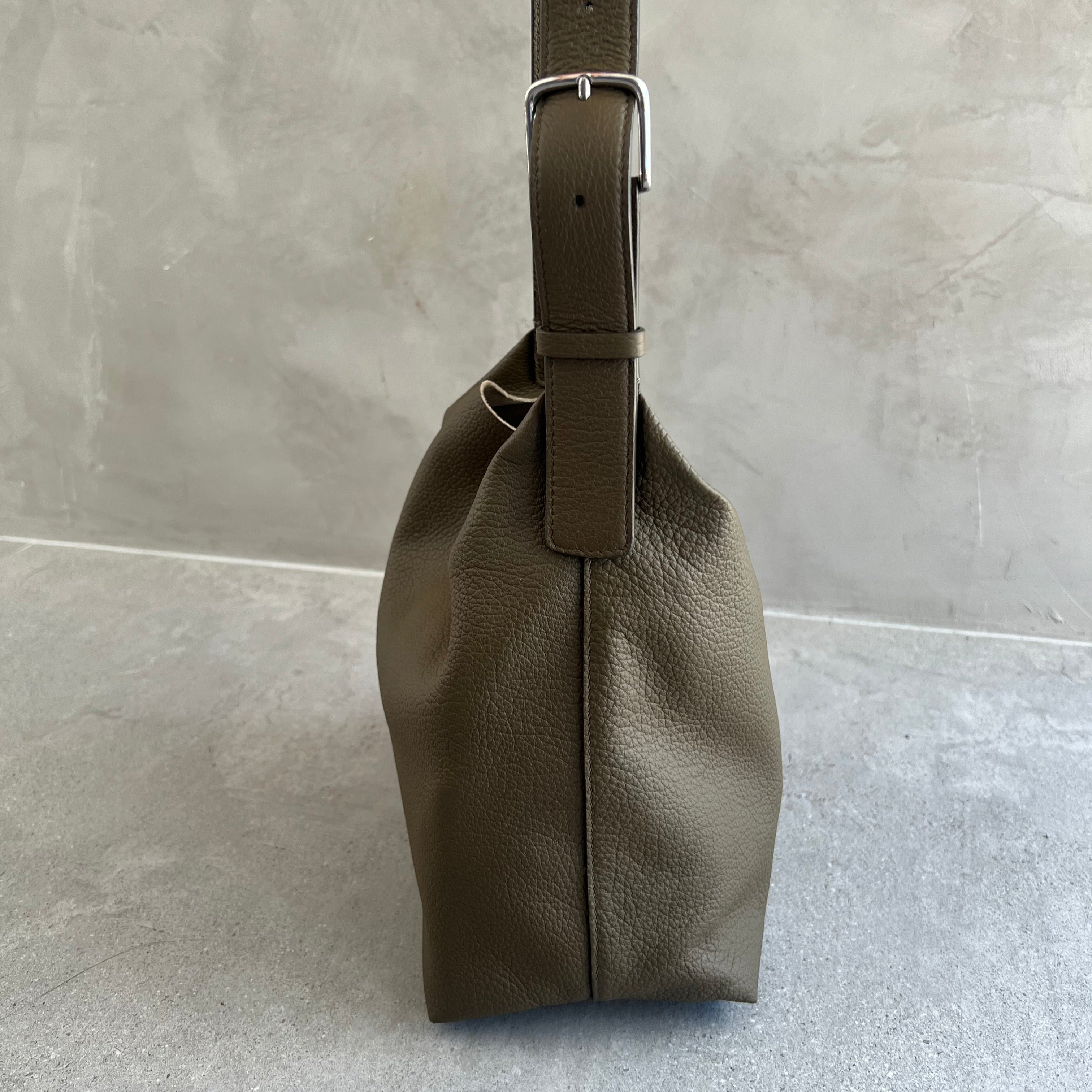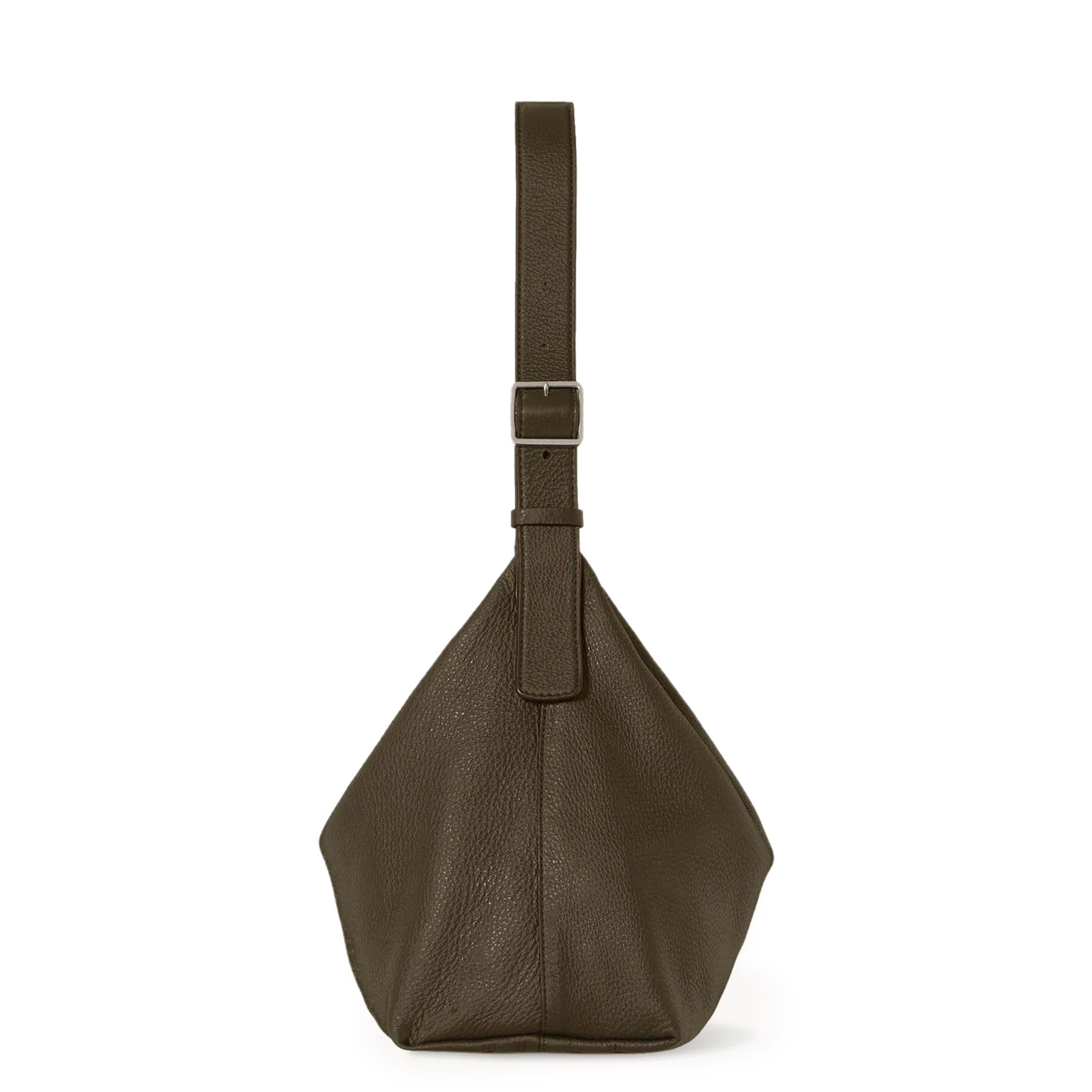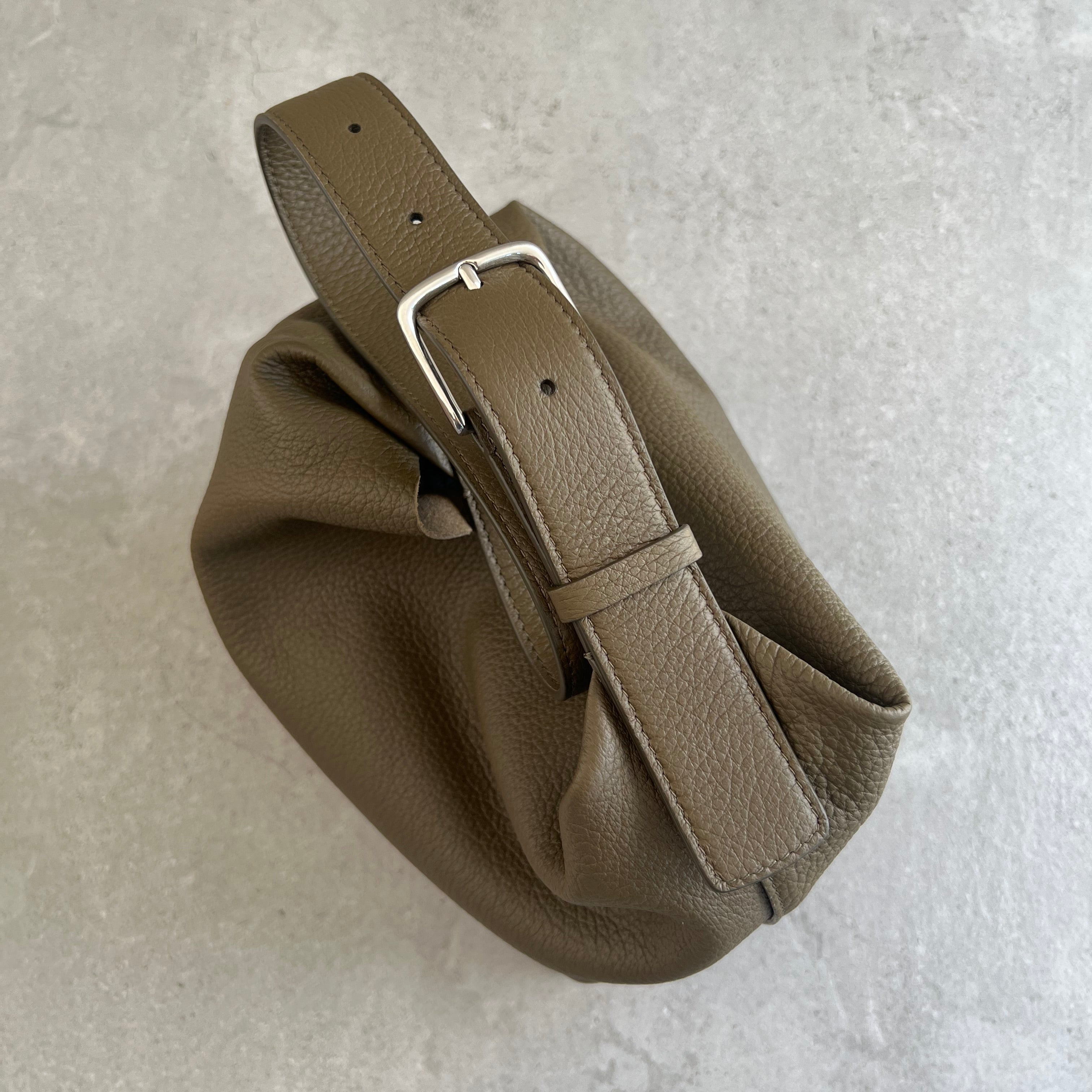 Draped, compact shoulder bag in durable deerskin leather with flat base and adjustable strap with metal buckle.