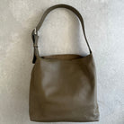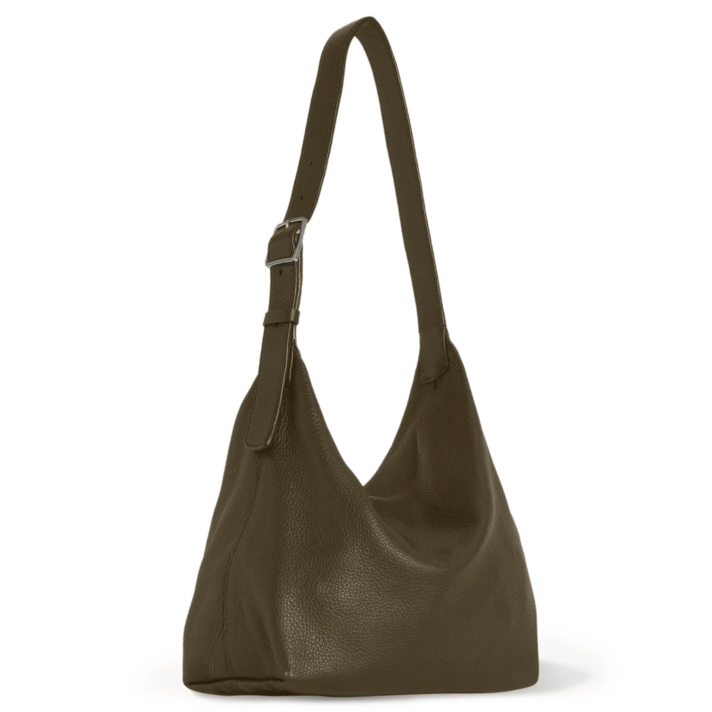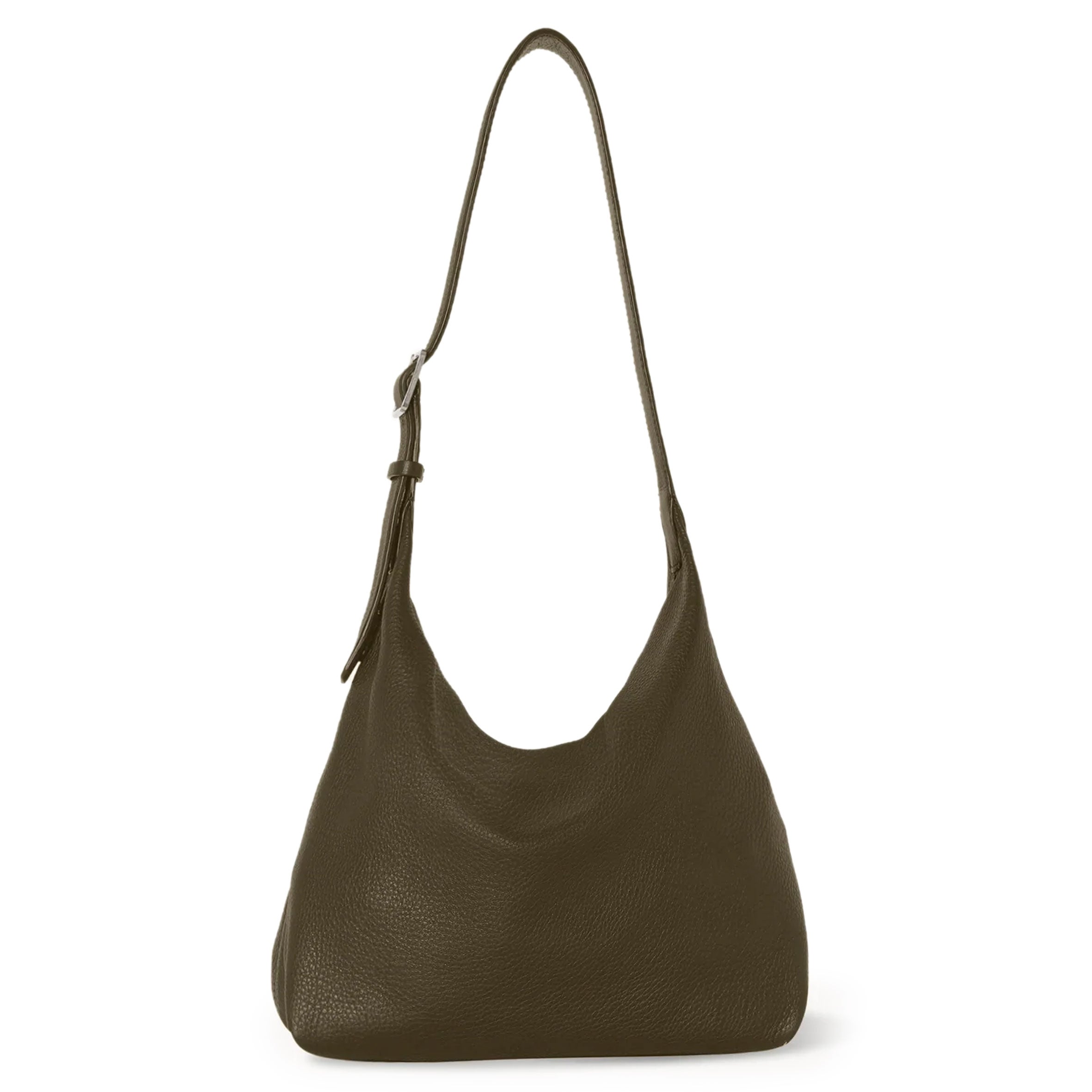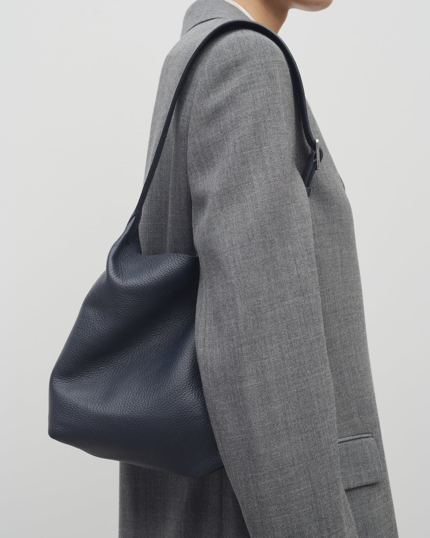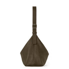 Draped, compact shoulder bag in durable deerskin leather with flat base and adjustable strap with metal buckle.