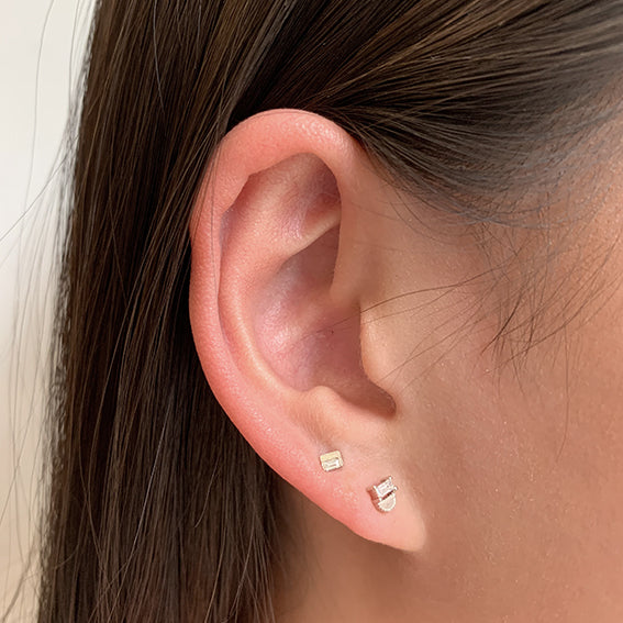 A baguette diamond and the block of gold meld seamlessly next to one another. Featuring subtle milgrain detail on this stud.