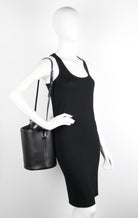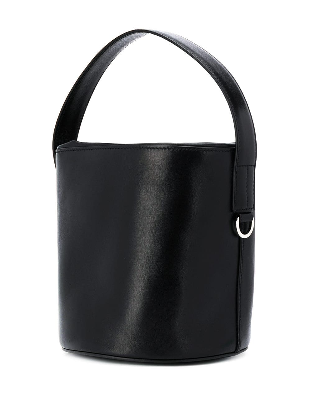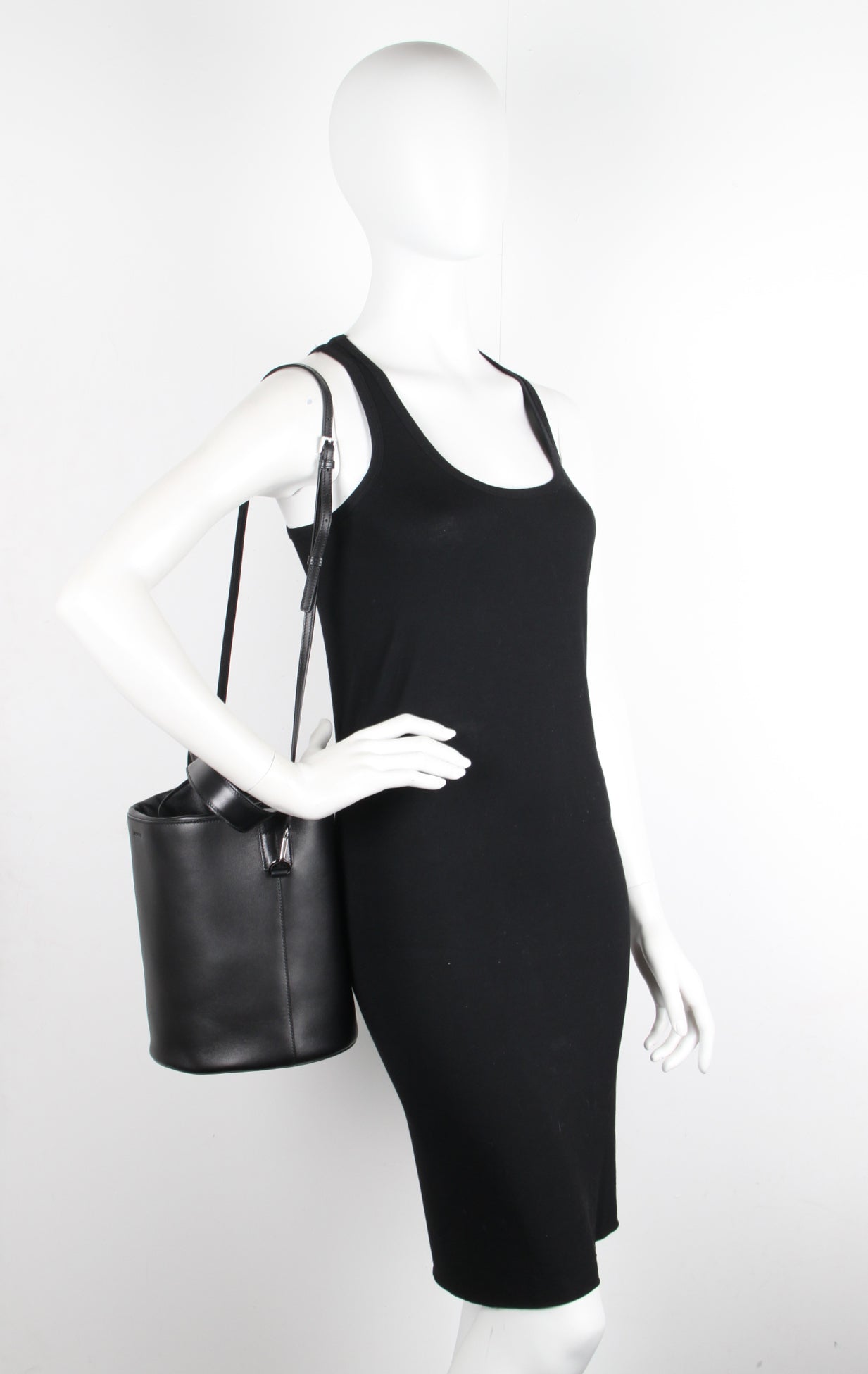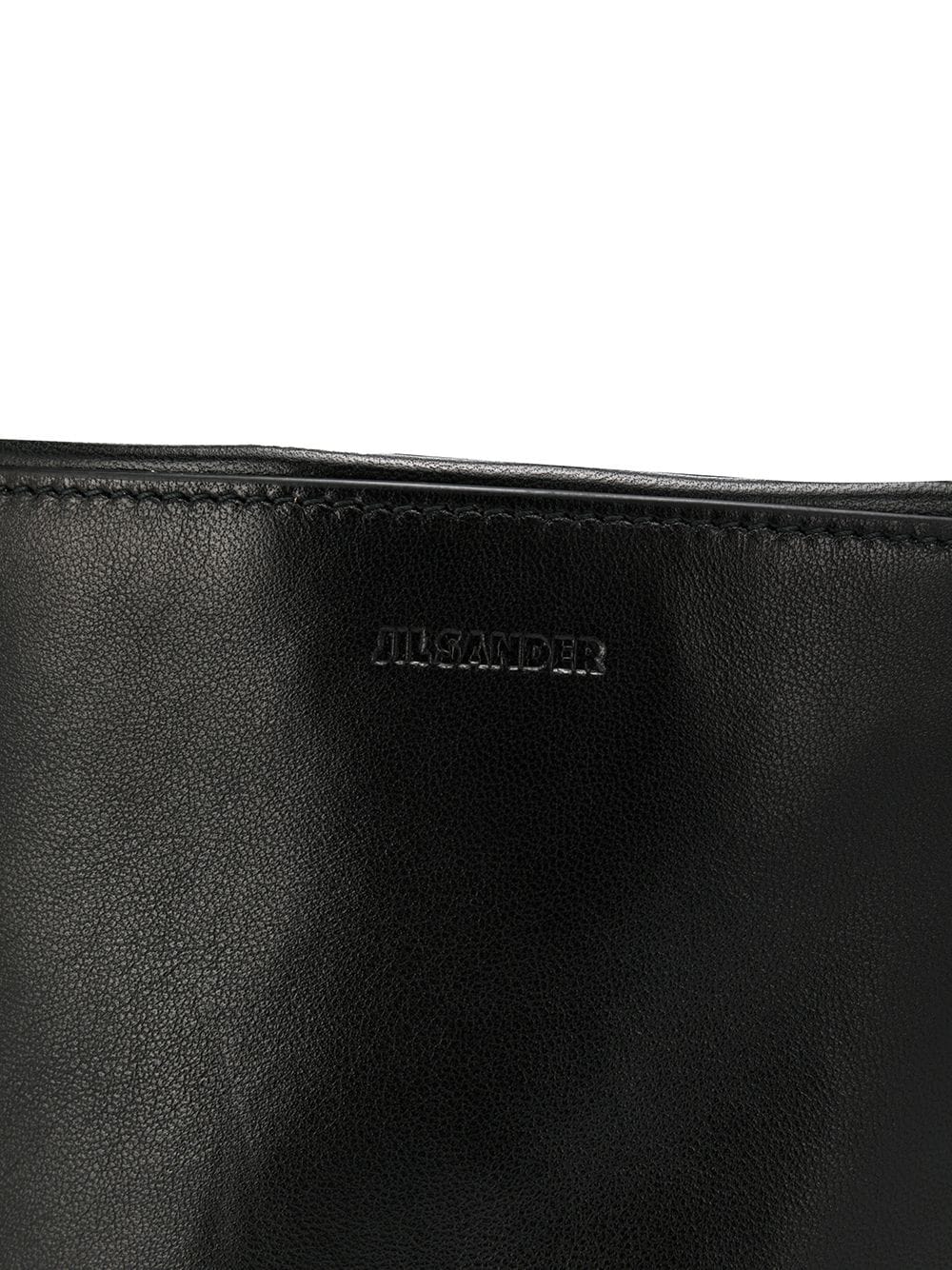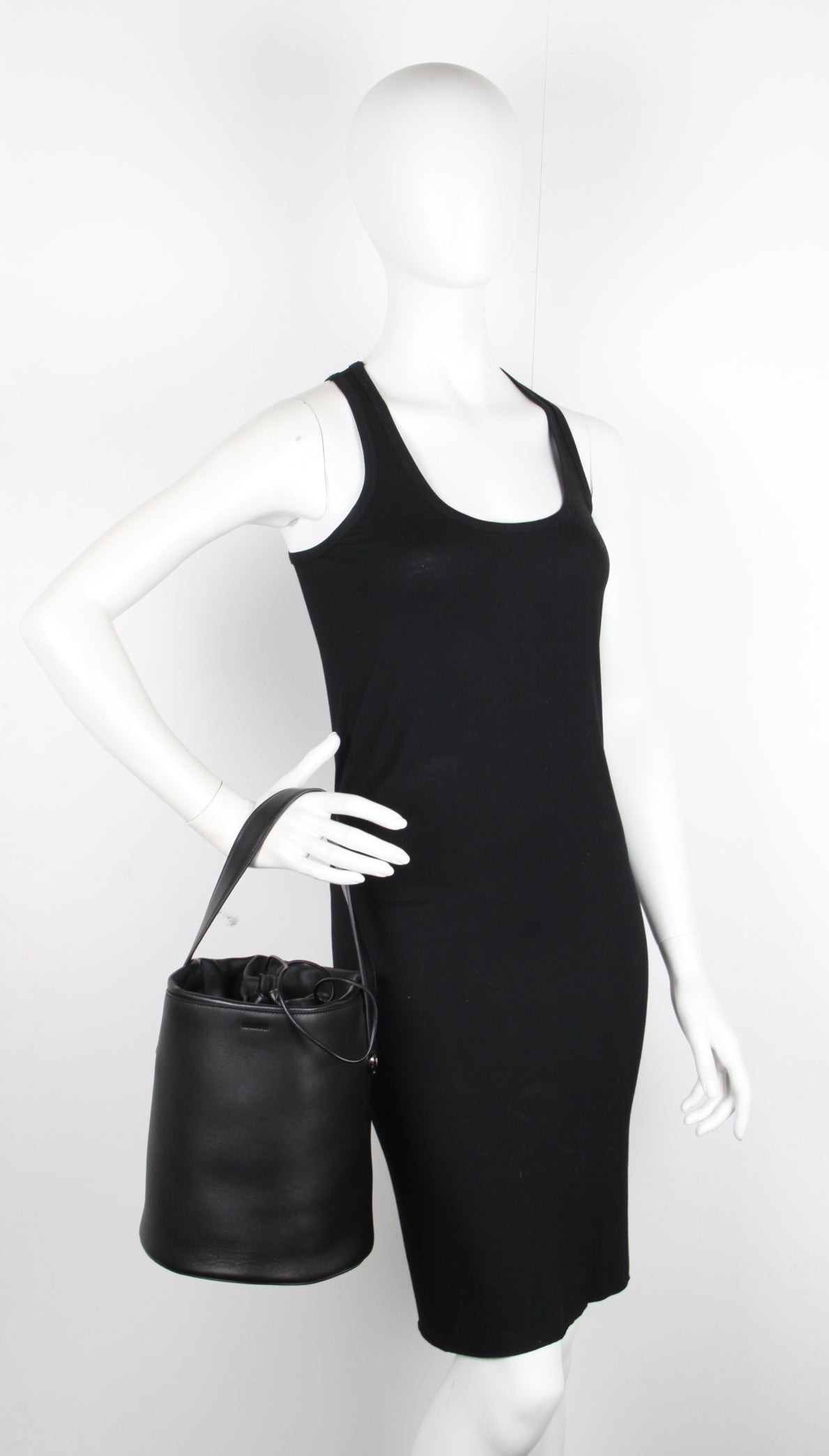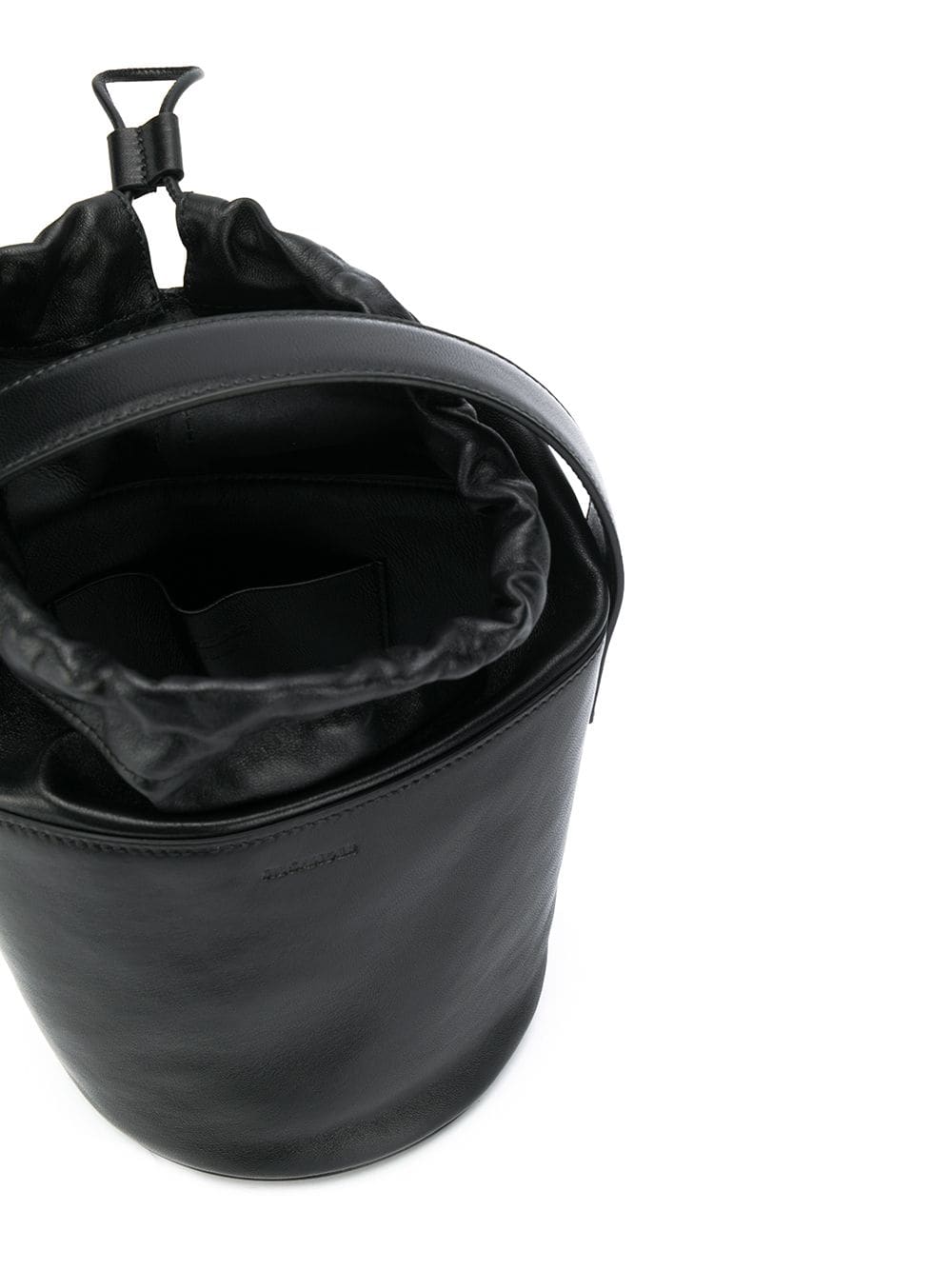 Soft leather bucket bag featuring a single leather handle, detachable leather strap, drawstring closure, nappa lining and blind embossed Jil Sander logo.