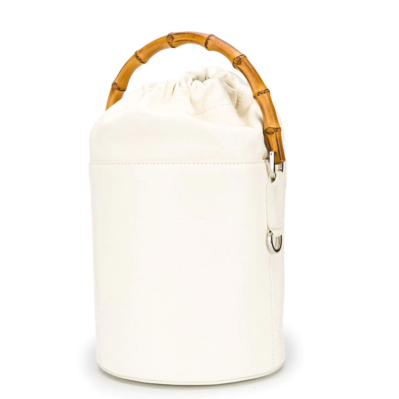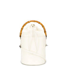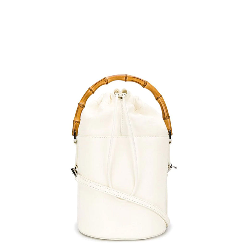 Soft leather bucket bag featuring a bamboo leather handle, detachable leather strap, drawstring closure, nappa lining and blind embossed Jil Sander logo.