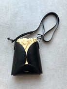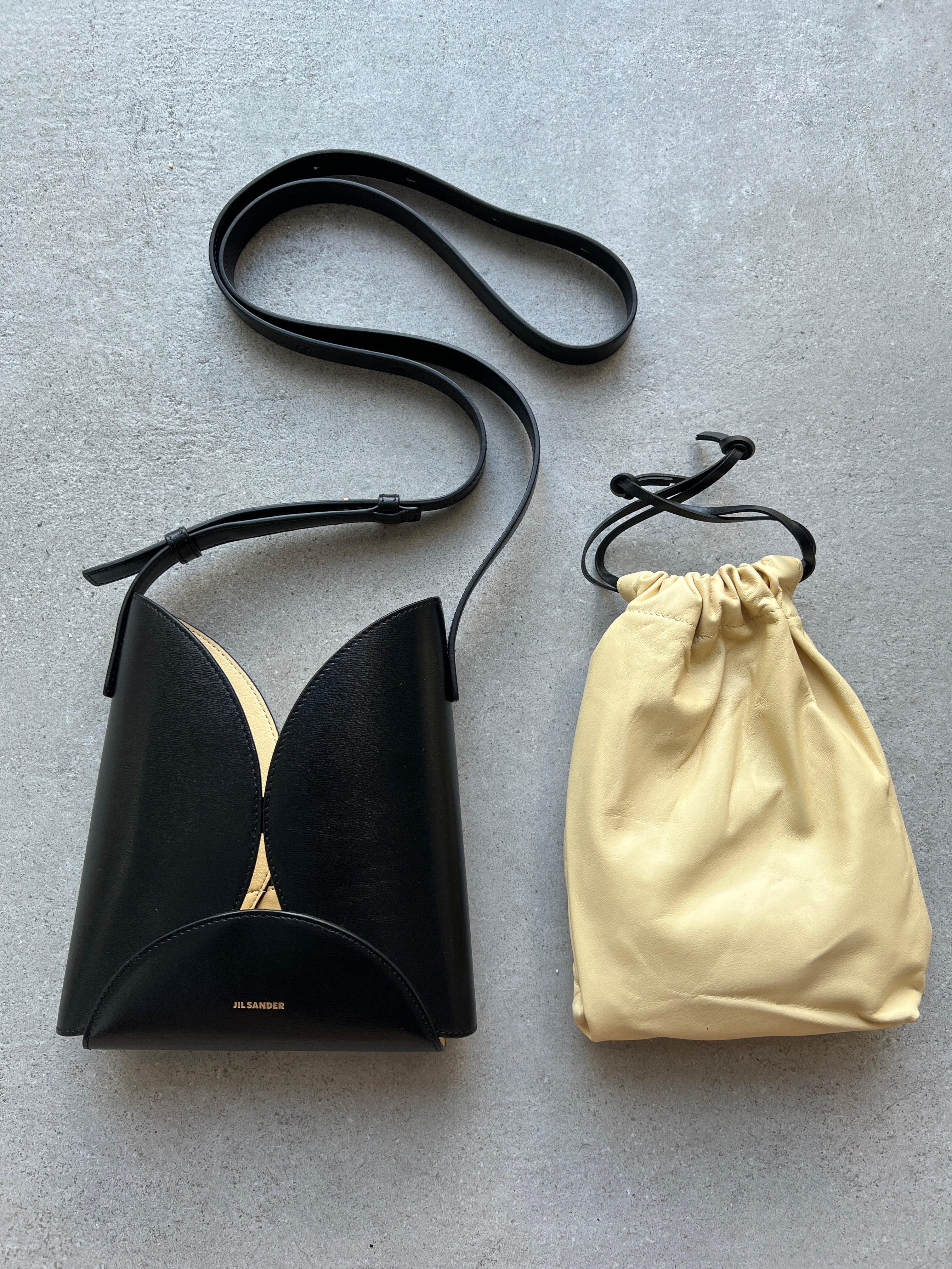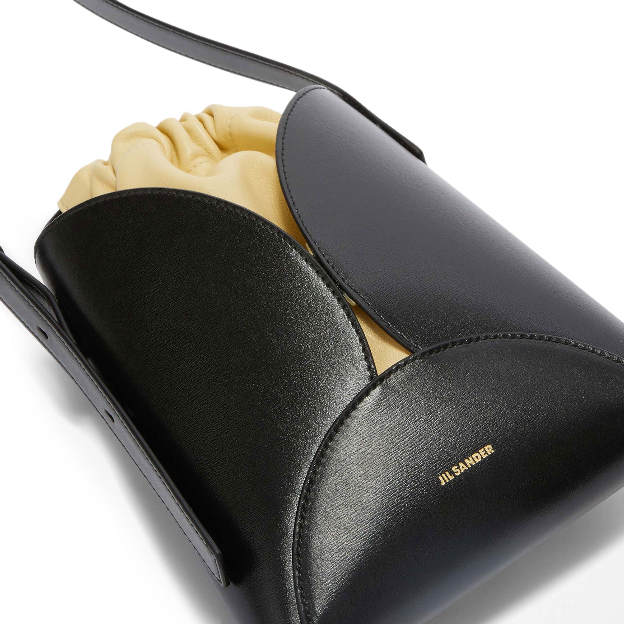 Small-sized leather crossbody bag with embossed Jil Sander logo . Detachable leather inner pouch in contrasting colour with drawstring closure and adjustable strap.