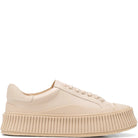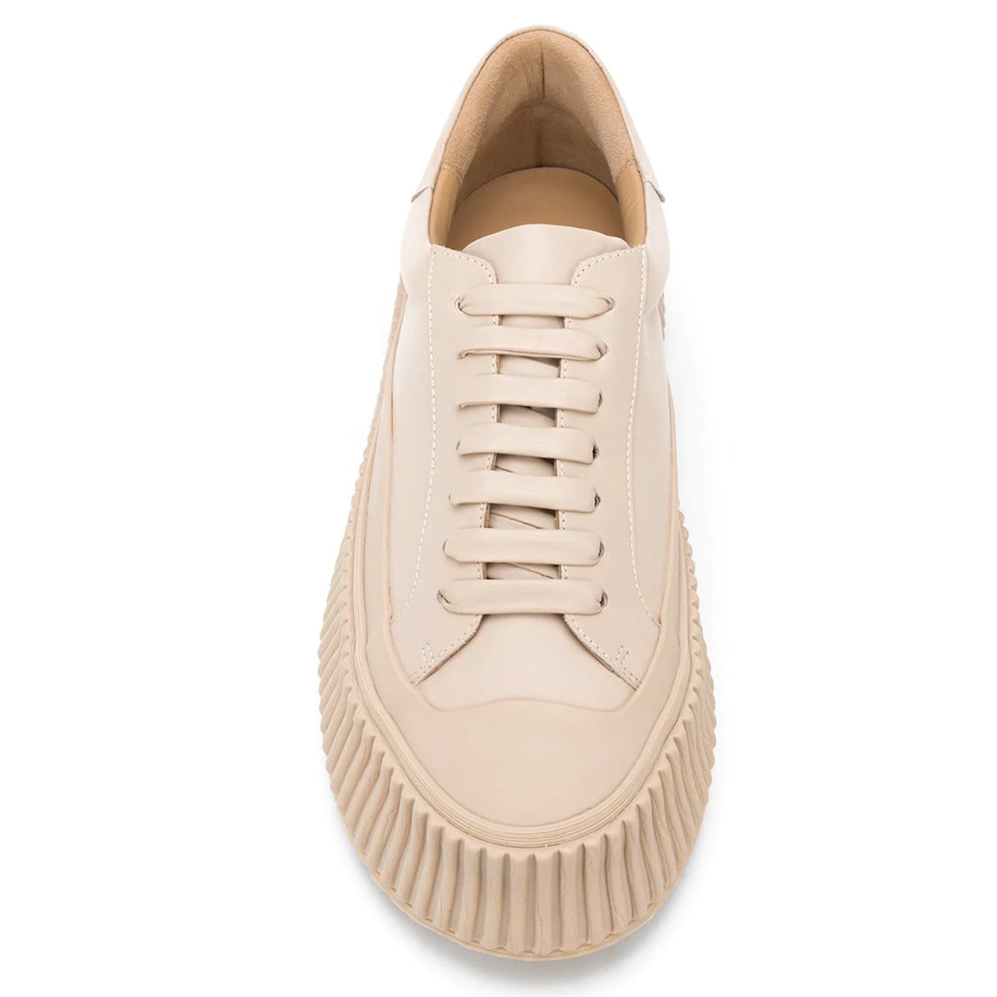 Round toe leather sneakers featuring leather insole and vulcanized rubber sole.