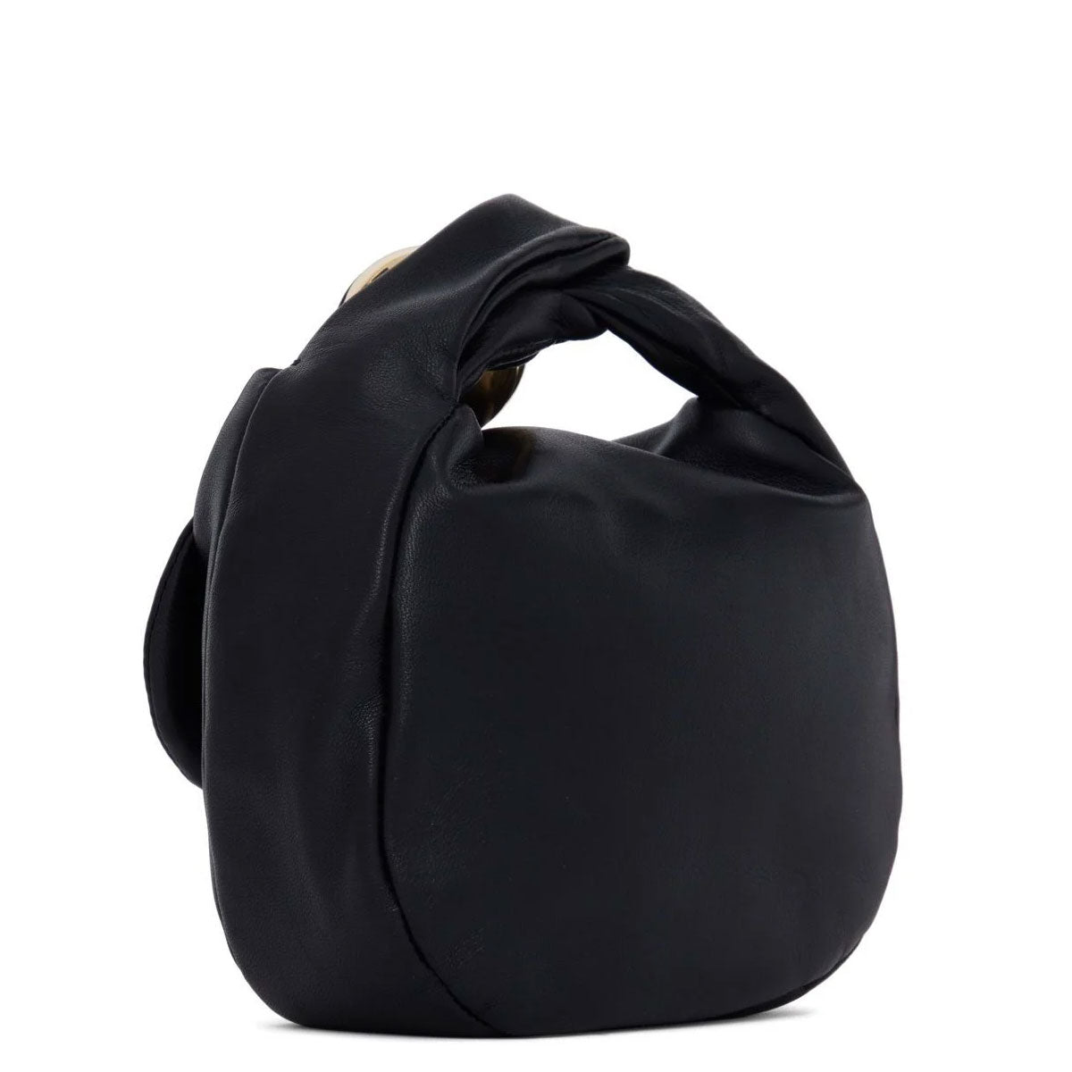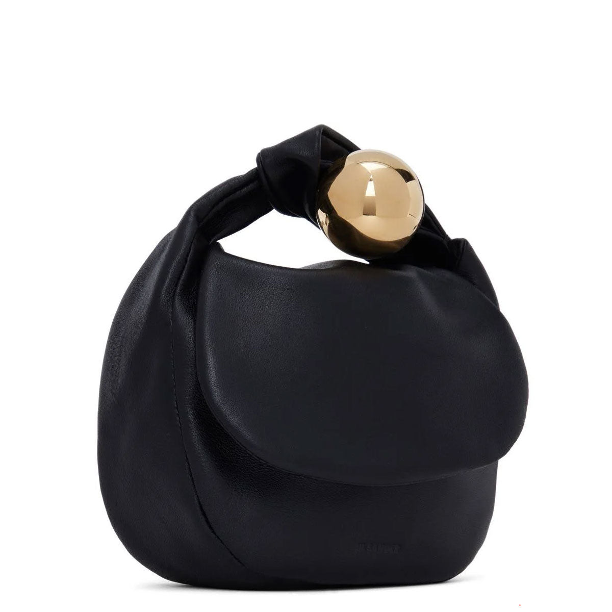 Leather pouch with metal sphere closure and handle detail. Soft body, featuring inner zipped pockets and nappa lining.