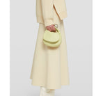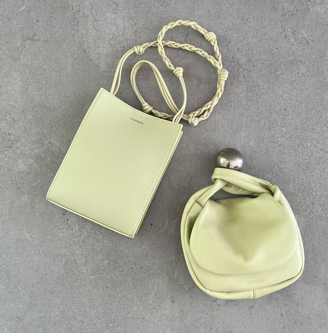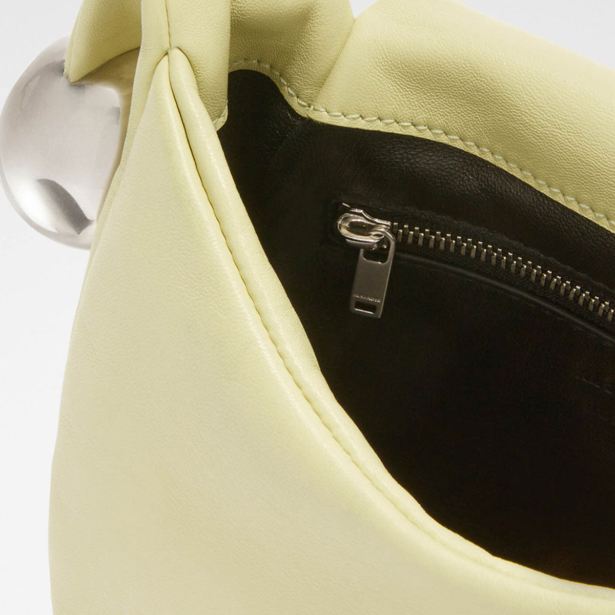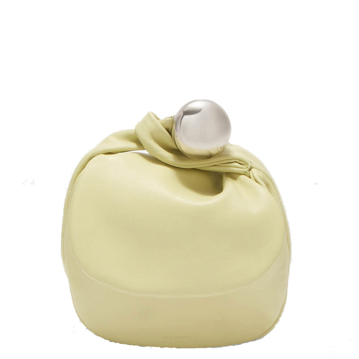 Leather pouch with metal sphere closure and handle detail. Soft body, featuring inner zipped pockets and nappa lining.