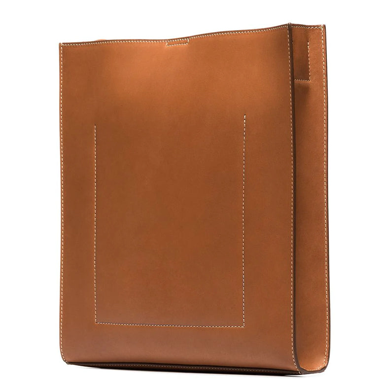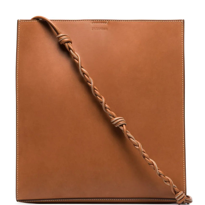 Large shoulder, crossbody rectangular bag featuring a hand-knotted leather strap and a foil embossed Jil Sander logo. Also features an internal flat pocket, two internal card slots and magnetic button closure.