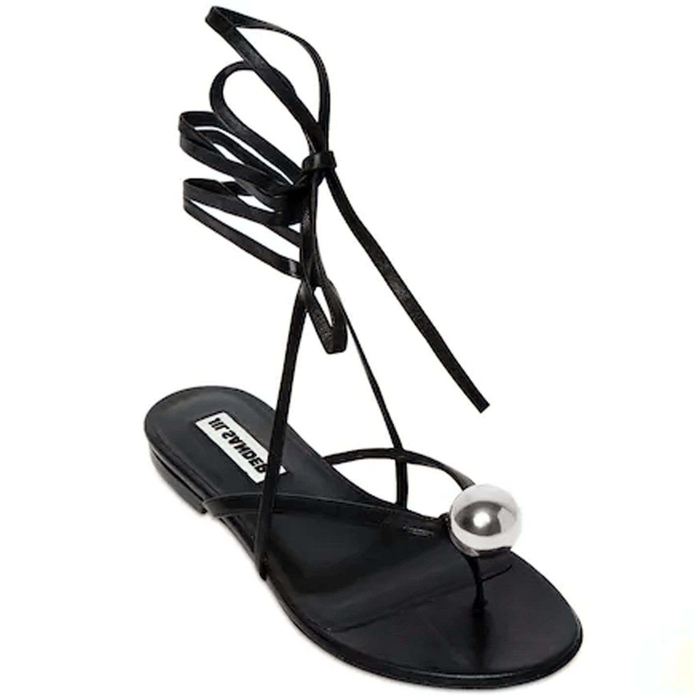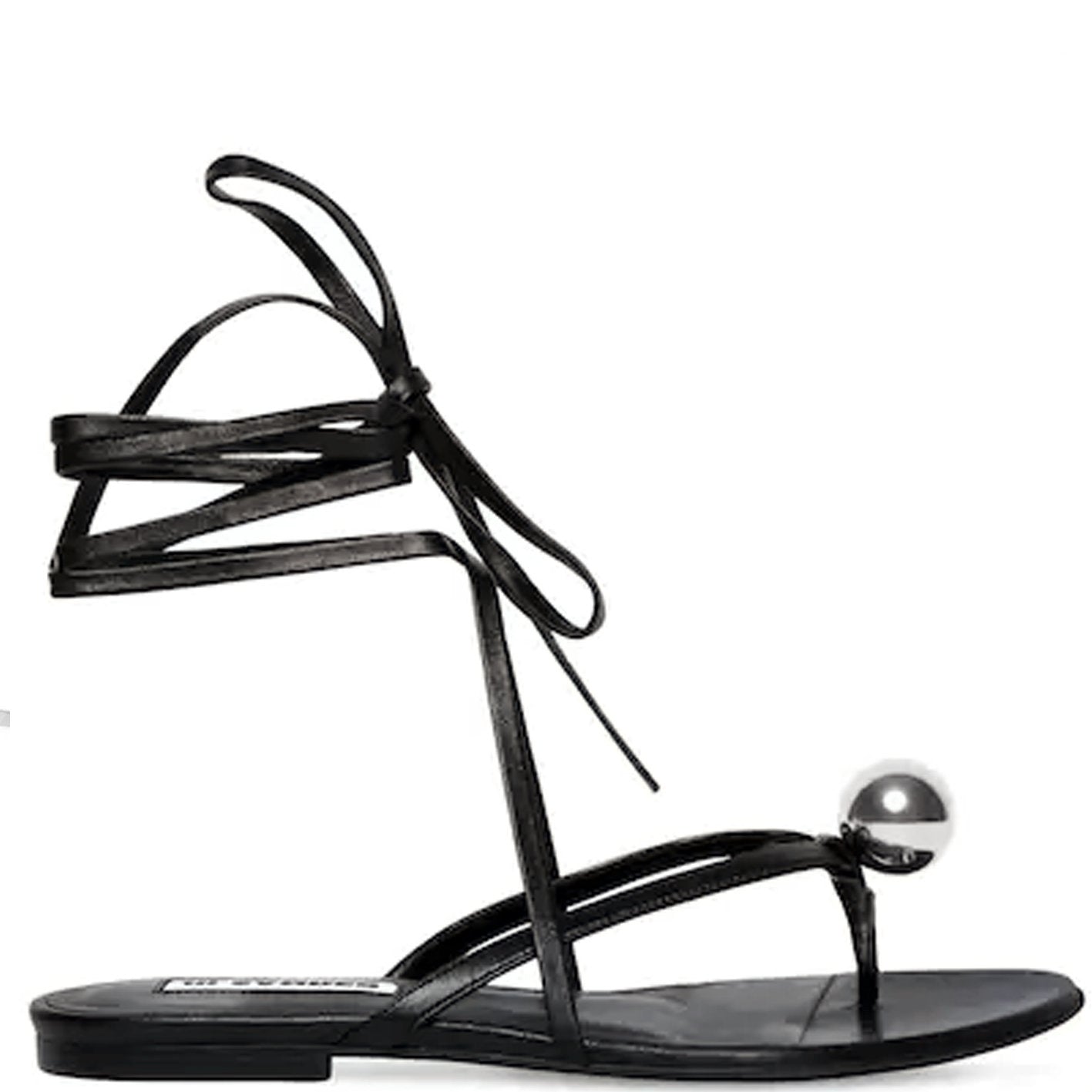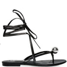 Ankle-tie sandals featuring a silver tone ball detail at the toe. Featuring calf leather adjustable ankle tie straps and a leather sole.