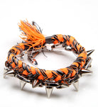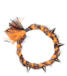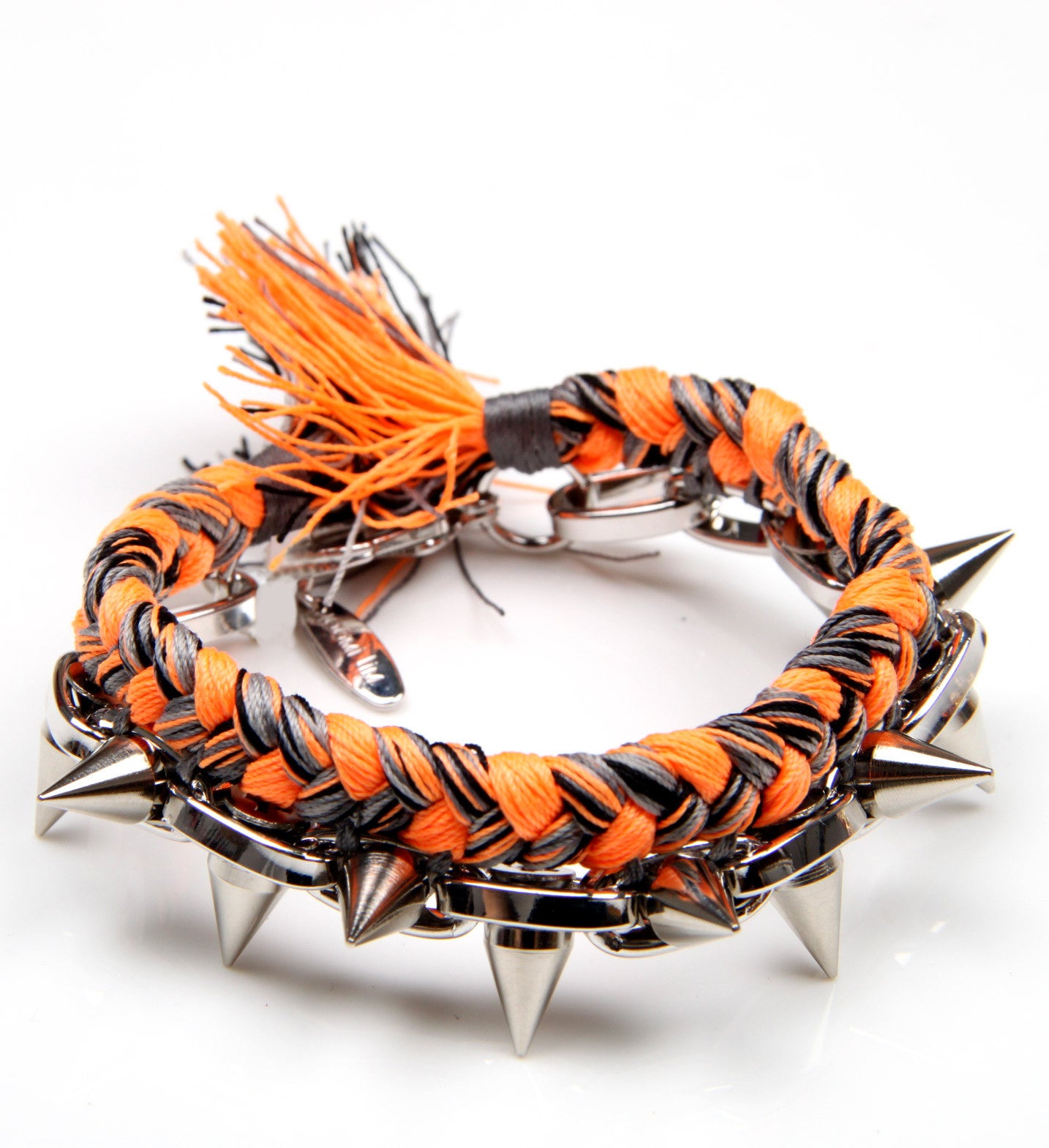 Joomi Lim bracelet with braided cotton colorful threads with brass bracelet and spikes dipped in Rhodium. Weighty chain. Lobster-claw clasp.
