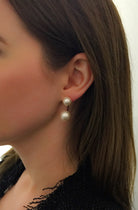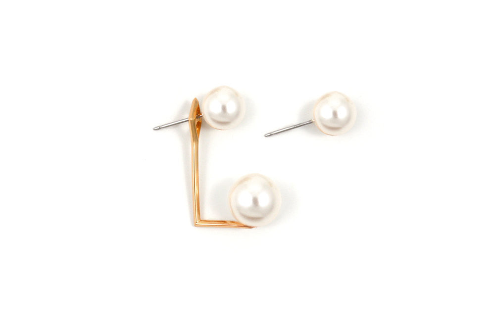 Beautiful Joomi Lim Swarovski faux pearl earrings. Two 10mm pearl studs & hanging 12mm pearls. Brass hanging earring dipped in rose gold. Made in NYC