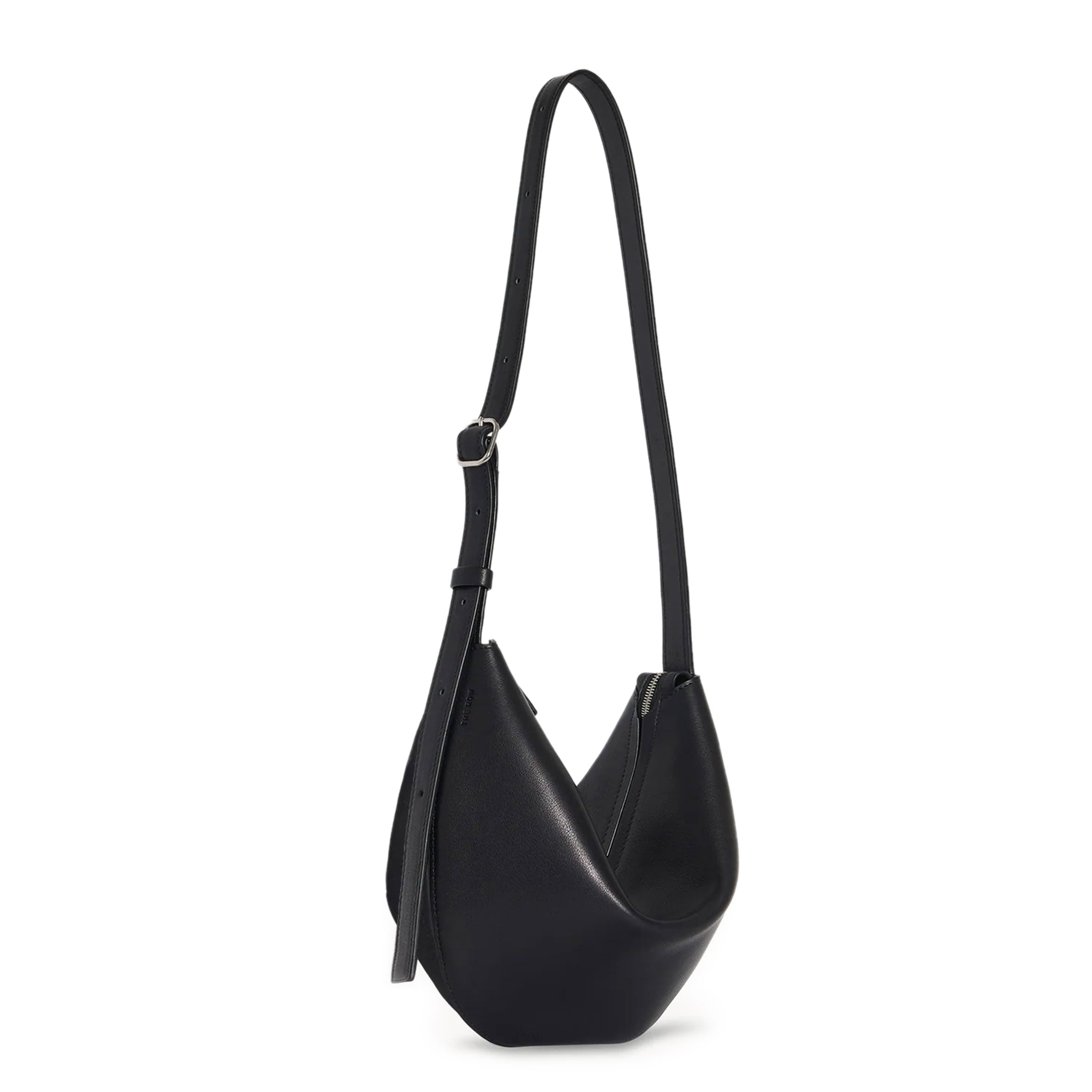 Crescent-shaped crossbody bag in finely grained calfskin leather with zipper closure and adjustable strap with metal buckle.