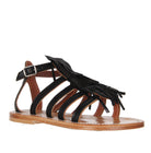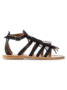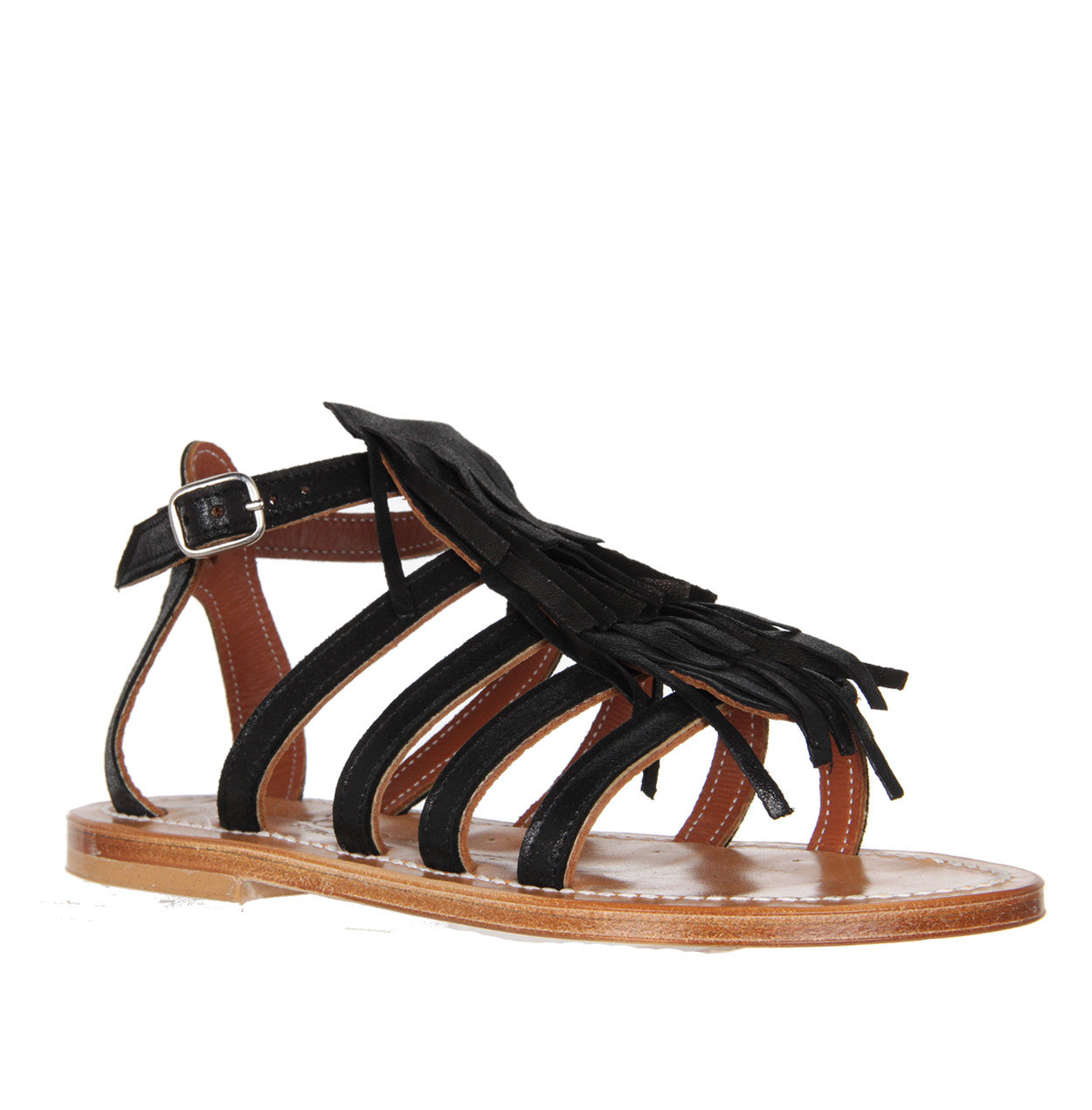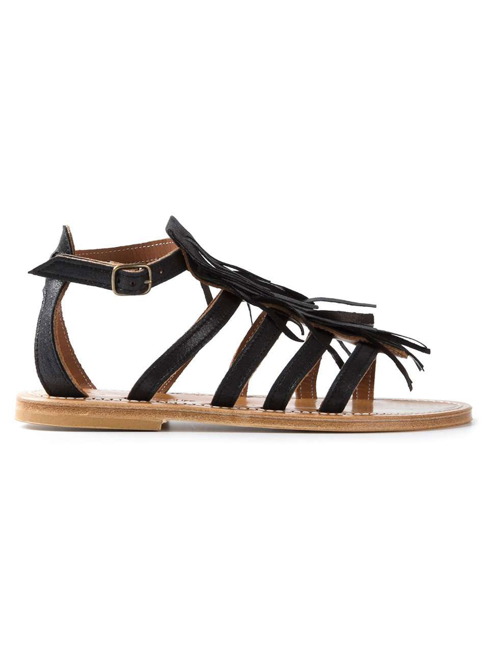 Versatile leather K. Jacques tribal-inspired Fregate sandals are made with a soft leather (in very subtle metallic sheen) . Straps ensure a comfortable fit, while the fringed front panel gives them a bohemian feel. Buckle closure. Leather sole.
