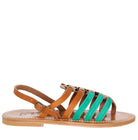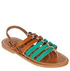 Hand-made leather gladiator style sandal with adjustable strap at back. Five straps across instep for support, in contrasting Pink and orange Suede.