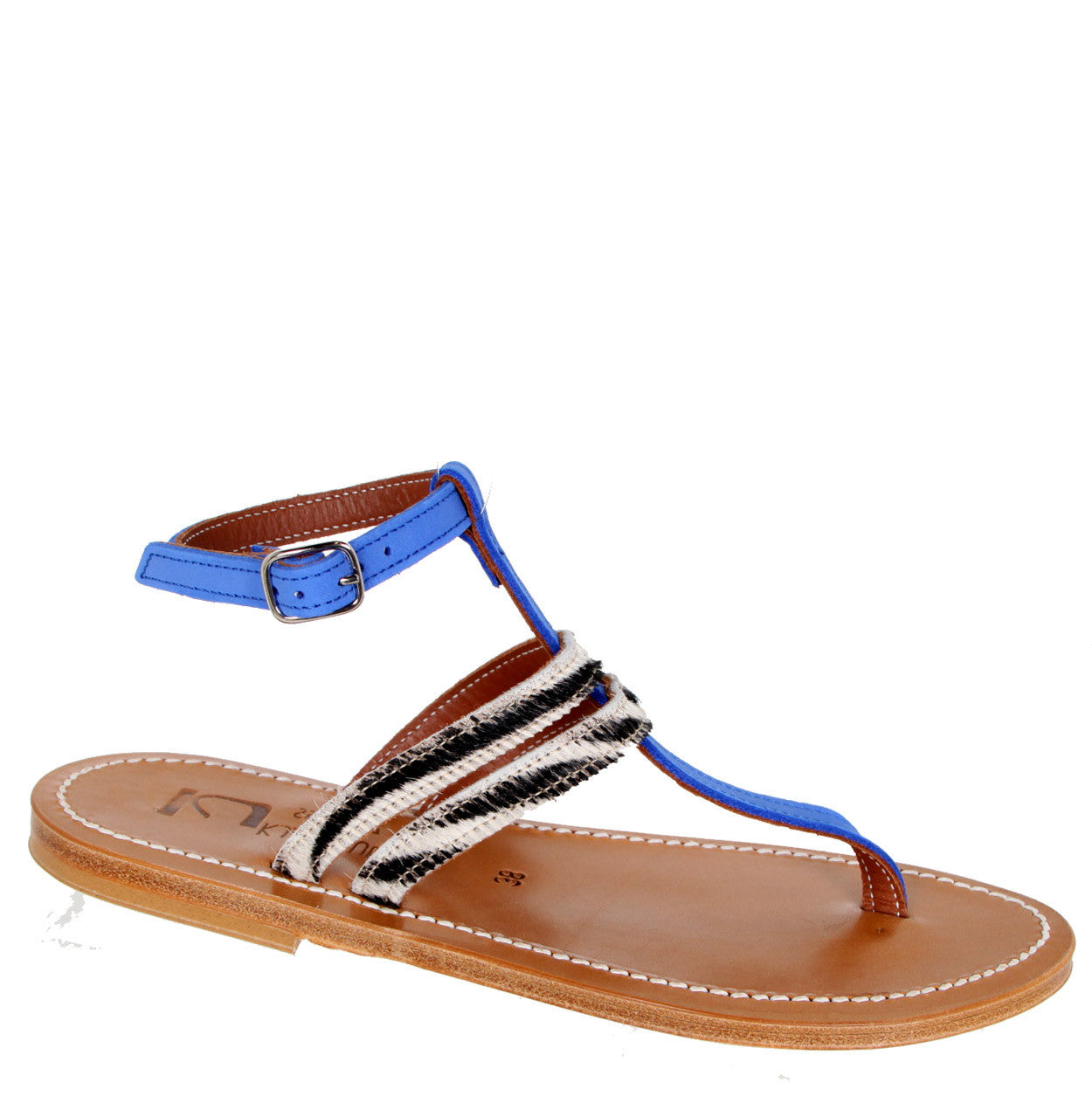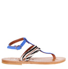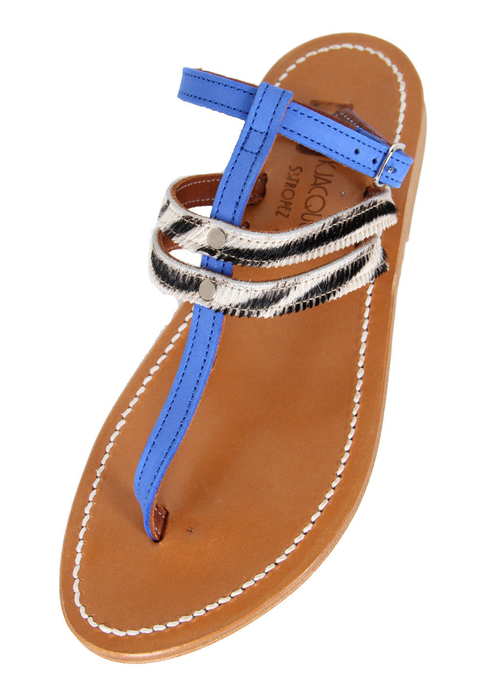 Hand-made leather gladiator style sandal with a buckle closure at the ankle strap. Two Calf Hair straps with Zebra Print at the middle of the shoe creates support. Contrasting ocean blue Nubuck leather on the "T-Bar". Leather sole. Stacked heel measures 10 mm.