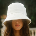 The Wave Bucket hat made from beige terrycloth is an updated easy to wear style for a sun-safe street look. This brimmed bucket hat design features a small side pocket.