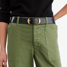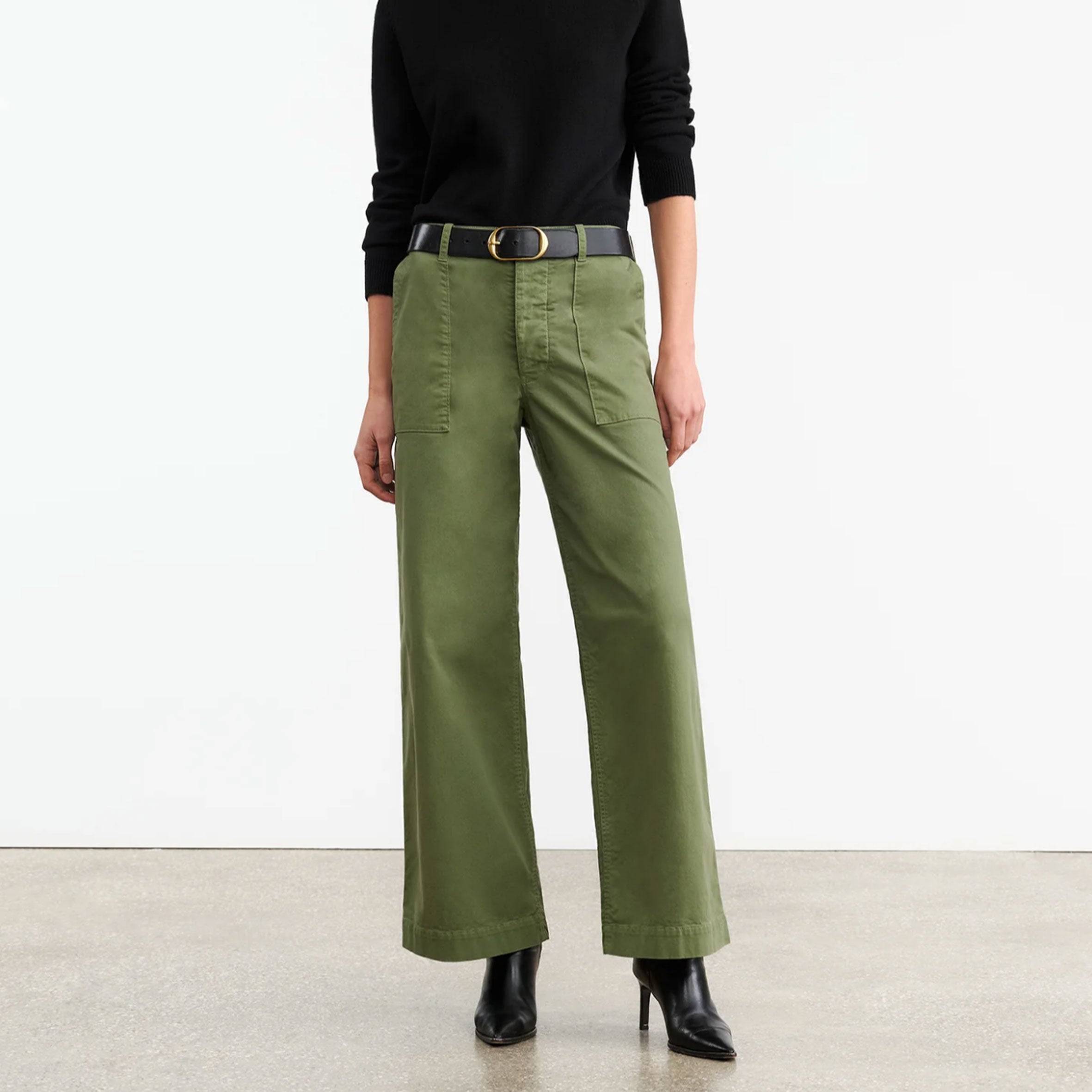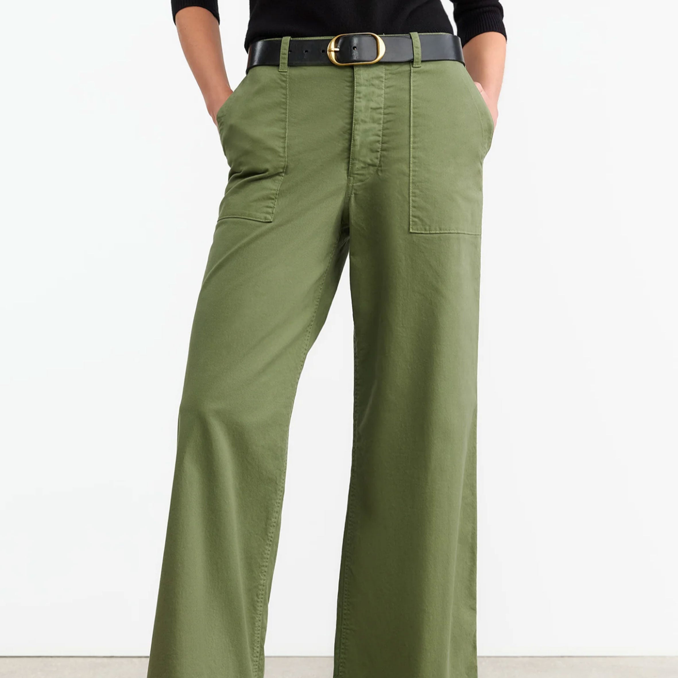 Flat front, mid-rise relaxed straight leg pant in brushed stretch twill cotton. Front patch pockets. Back patch pockets with flaps. Back darts. Zip fly. Button closure. Belt loops.