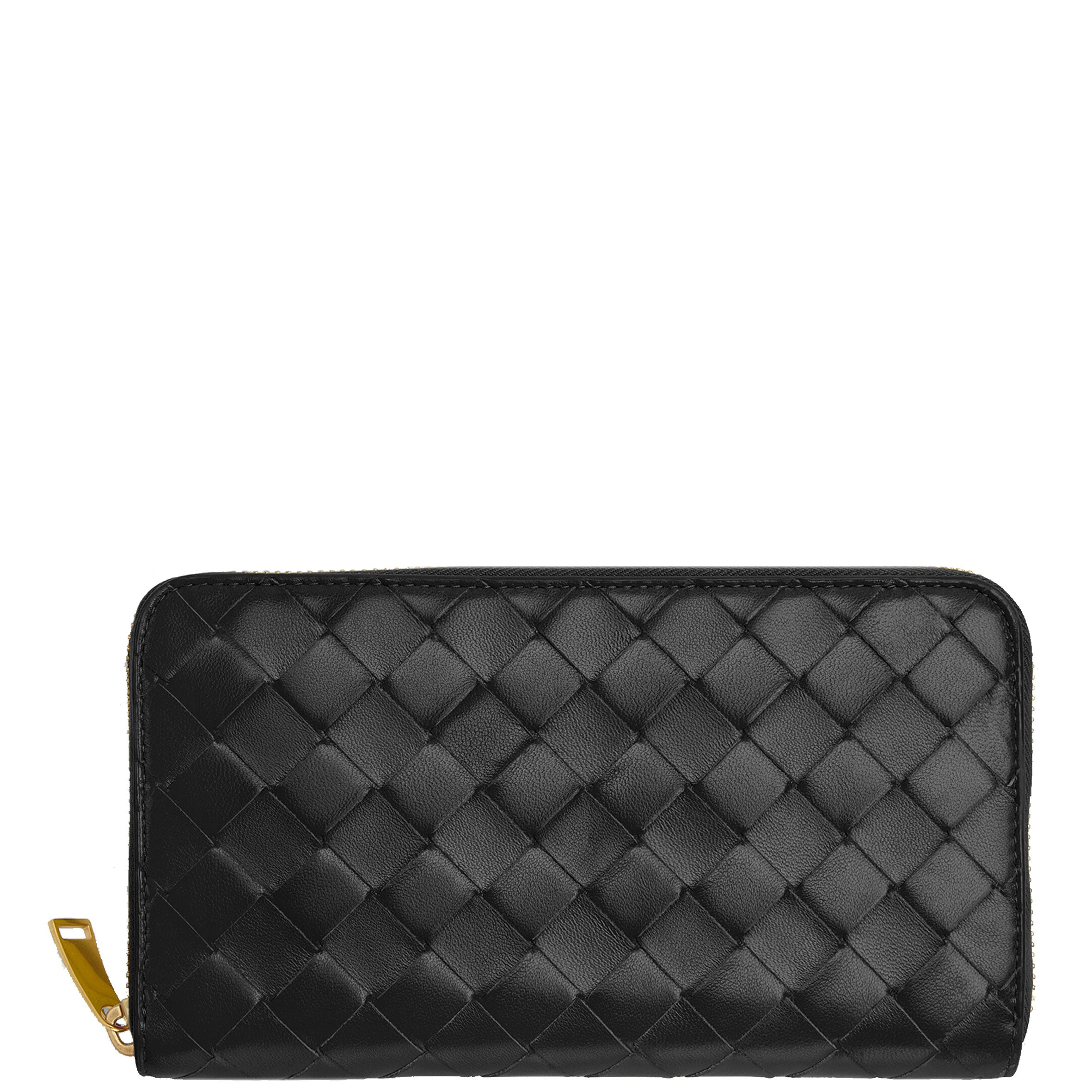 Long Zip wallet with gold tone hardware. Intrecciato leather wallet. Eight card slots, two note compartments, two additional pockets, one zipped coin purse. Zip closure