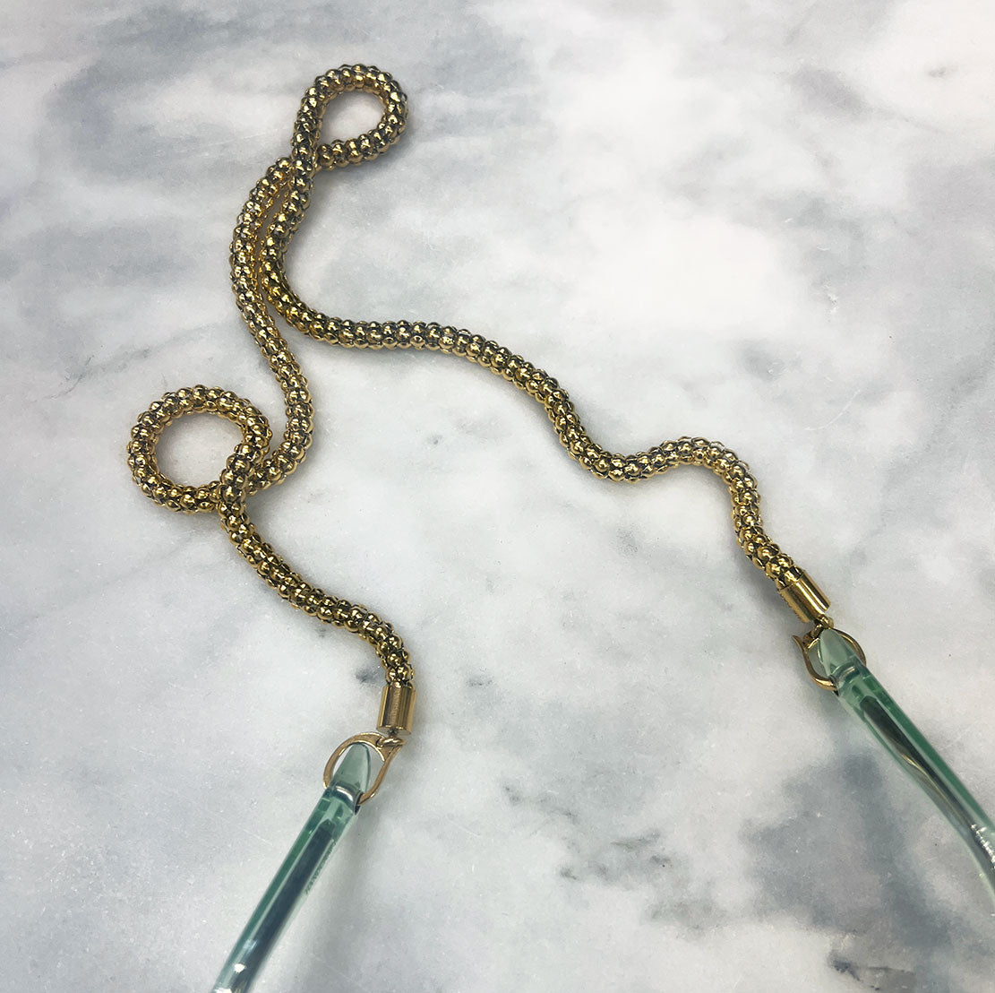Eyewear Chain in powder coated steel with gold plated with clip that attachs to your Lucy Folk eyewear or any frame which has a cut out.