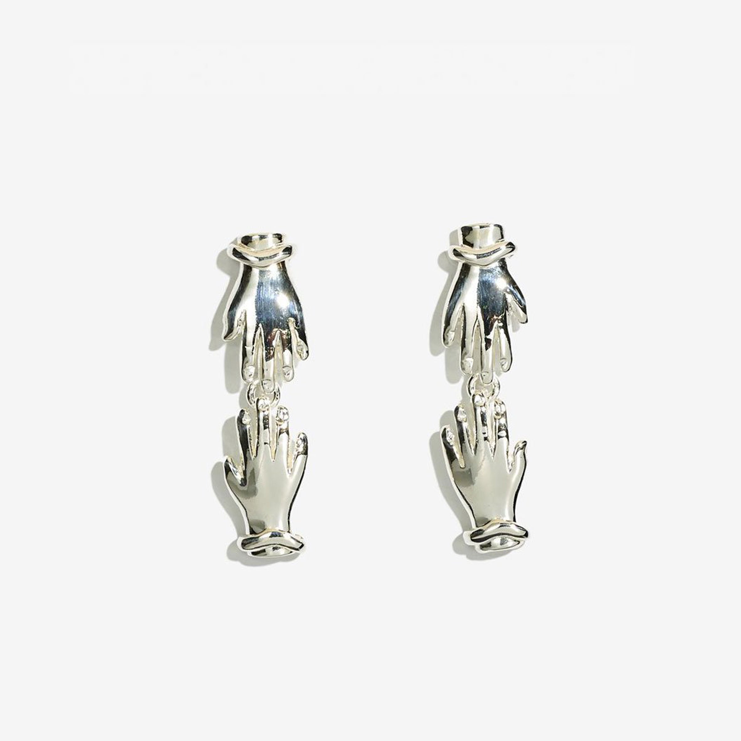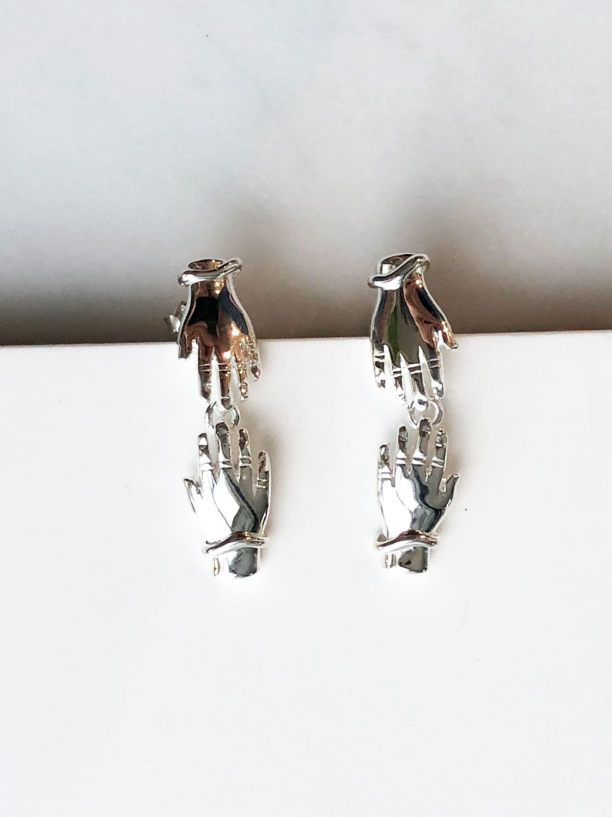 The Palm earring are handmade and feature two hand pendants with fingers touching.
