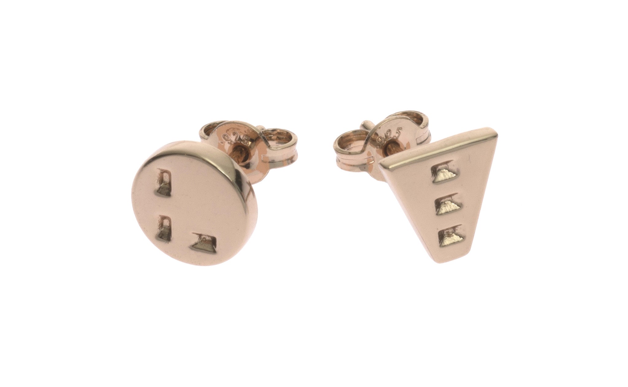 Asymmetrical rose gold studs with signature Lucy Folk detailing.
