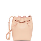 Italian calf leather light pink bucket bag with light pink interior matte patent. Detachable wallet and adjustable strap.