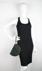 Italian suede leather moss mini moon clutch with moss suede leather interior with a wristlet function.