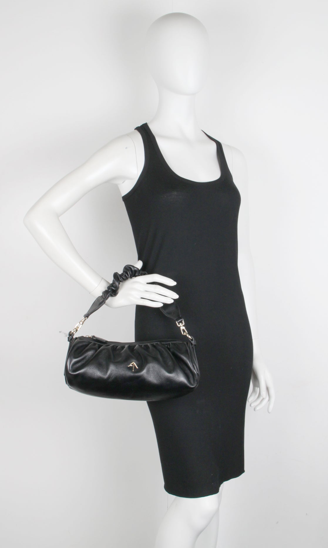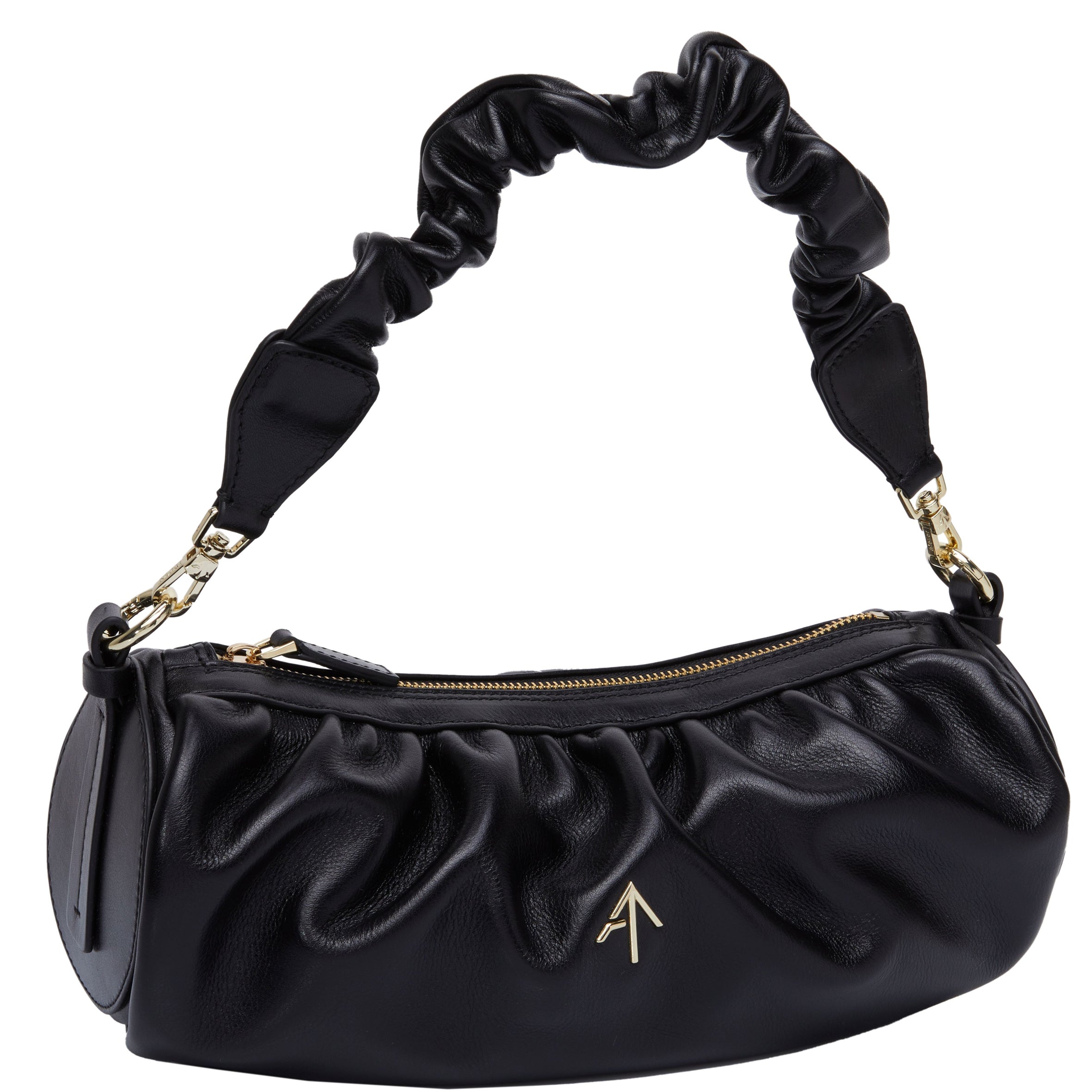 This Manu Atelier Cylinder bag features a top zip fastening, gold tone metal logo detailing at the front, a detachable additional ruched strap with gold tone hardware. Constructed from smooth leather.