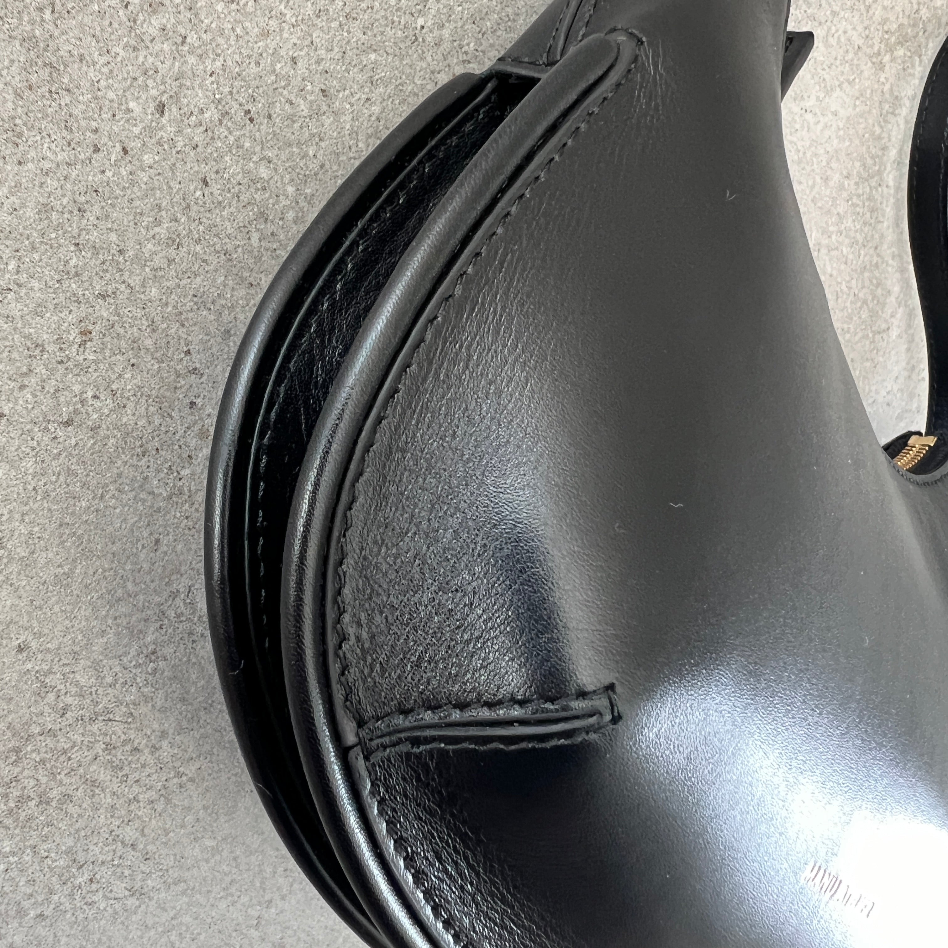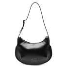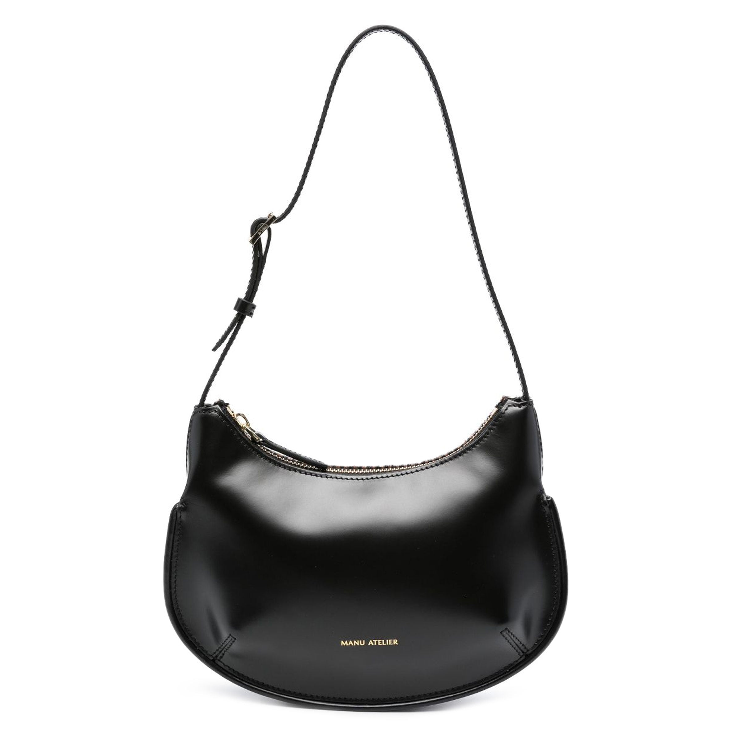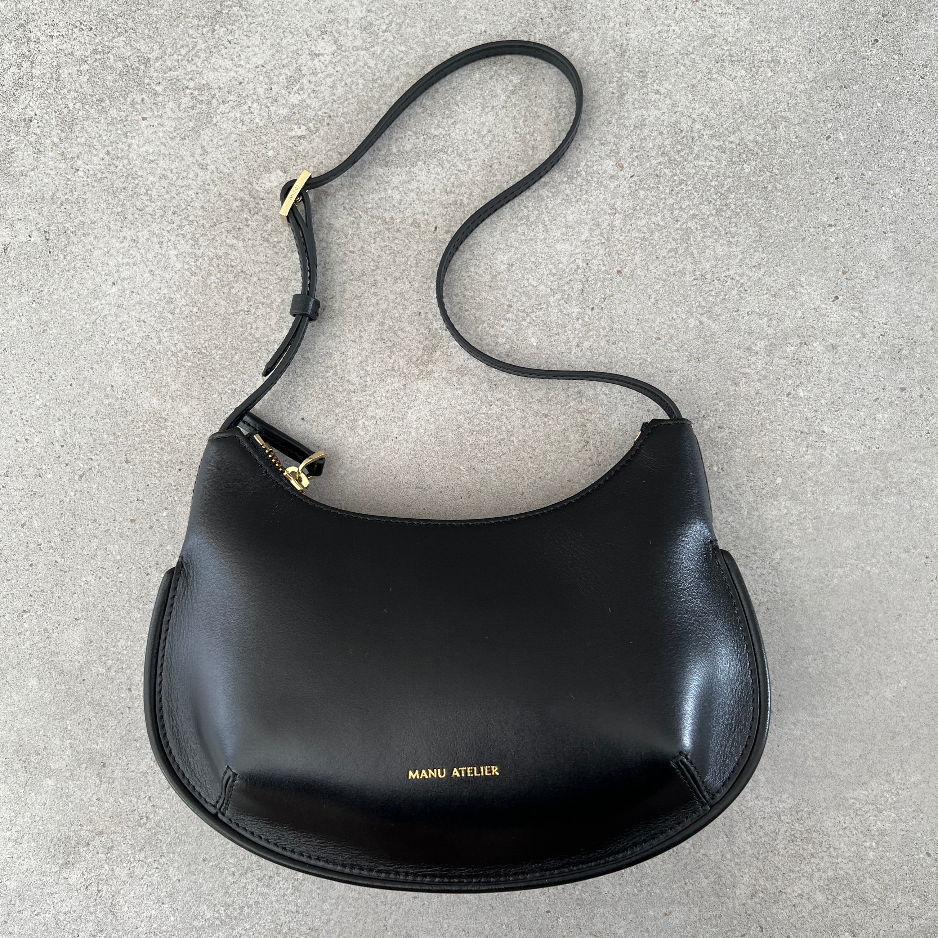 A shoulder bag featuring soft calfskin leather with a Manu Atelier embossed logo. It features an adjustable black leather strap and an interior zipped pocket.