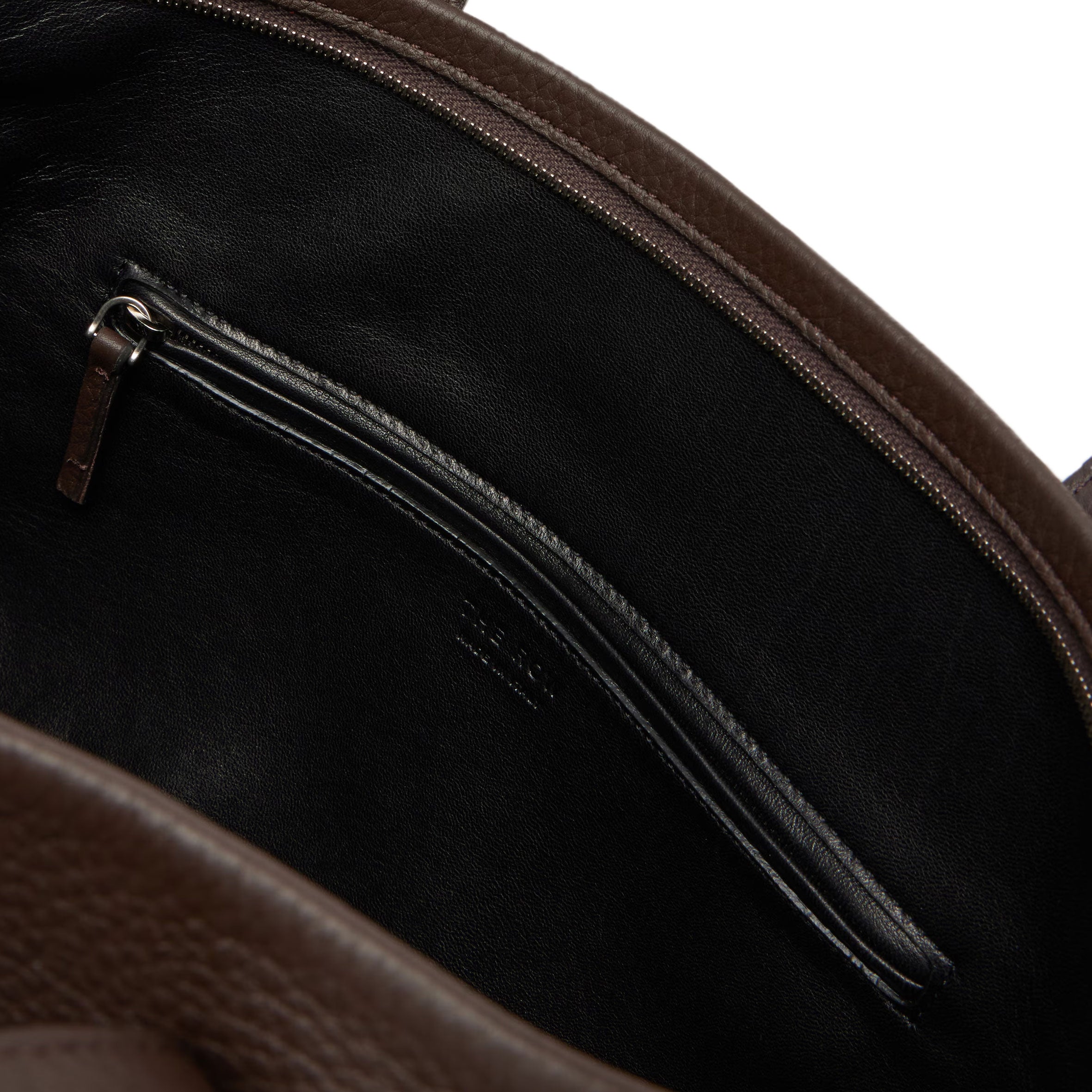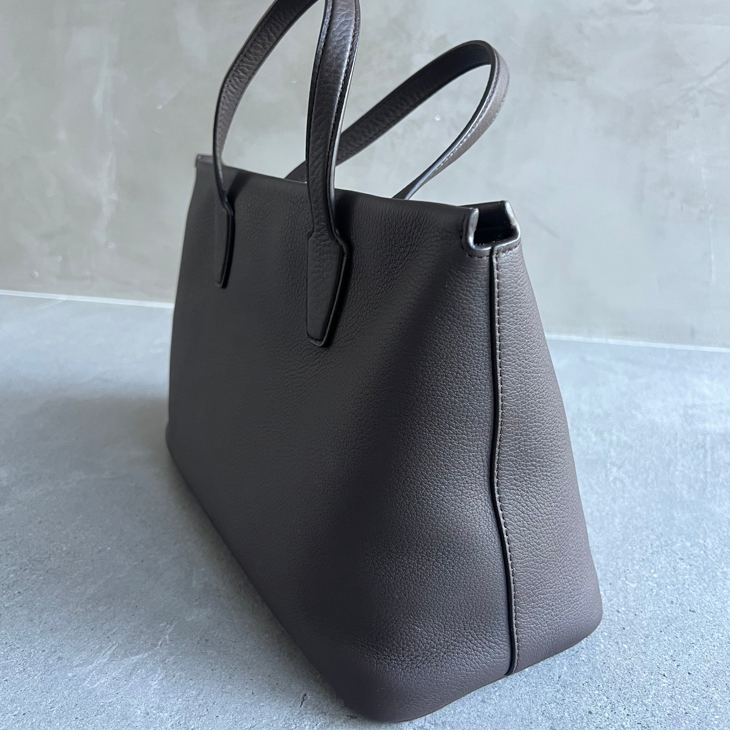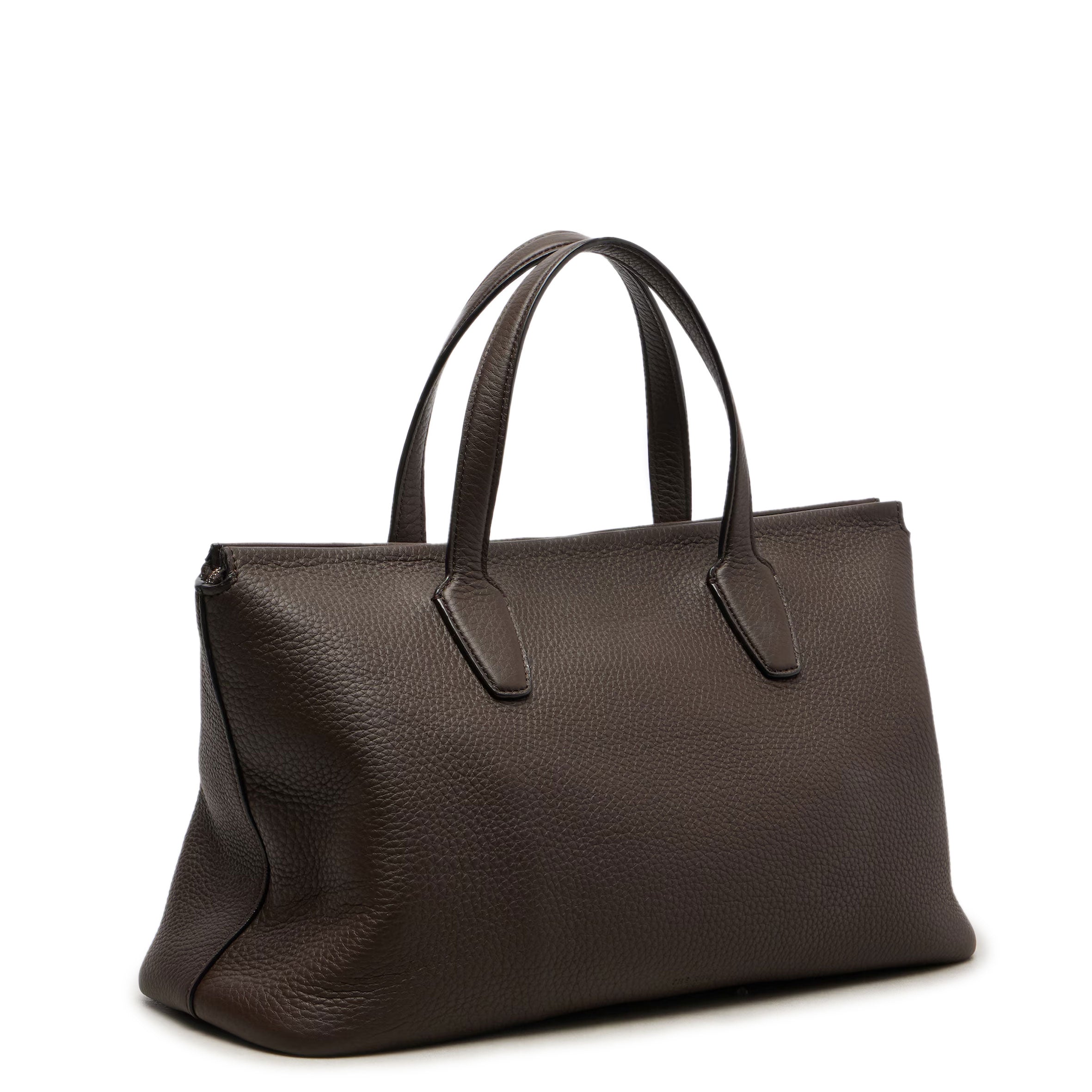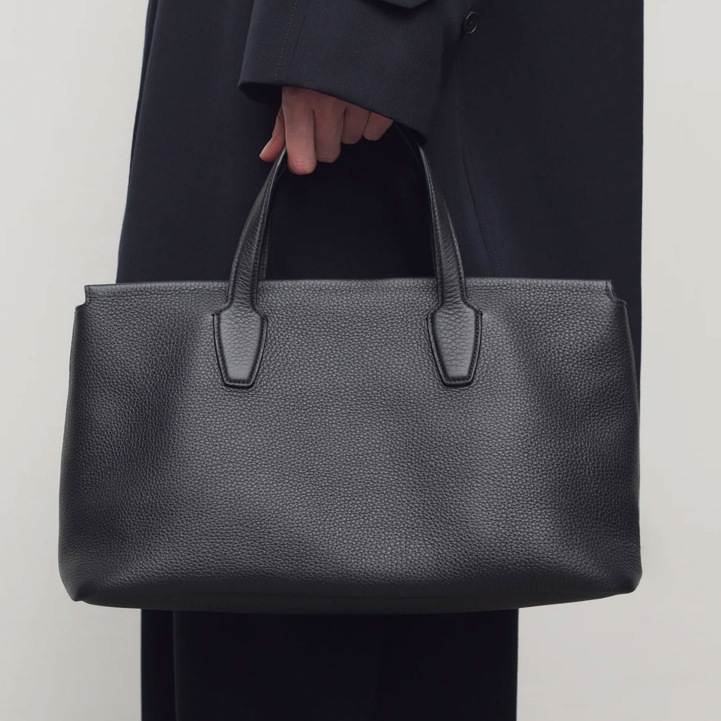 Top handle bag in textured calfskin leather with flat handles, overlap construction, and concealed top zipper closure. The softly structured silhouette is lined in smooth nappa with a folded top edge for a refined finish. Minimally finished, the natural grain surface is left intact, giving the leather a supple hand and refined texture that develops character over time.