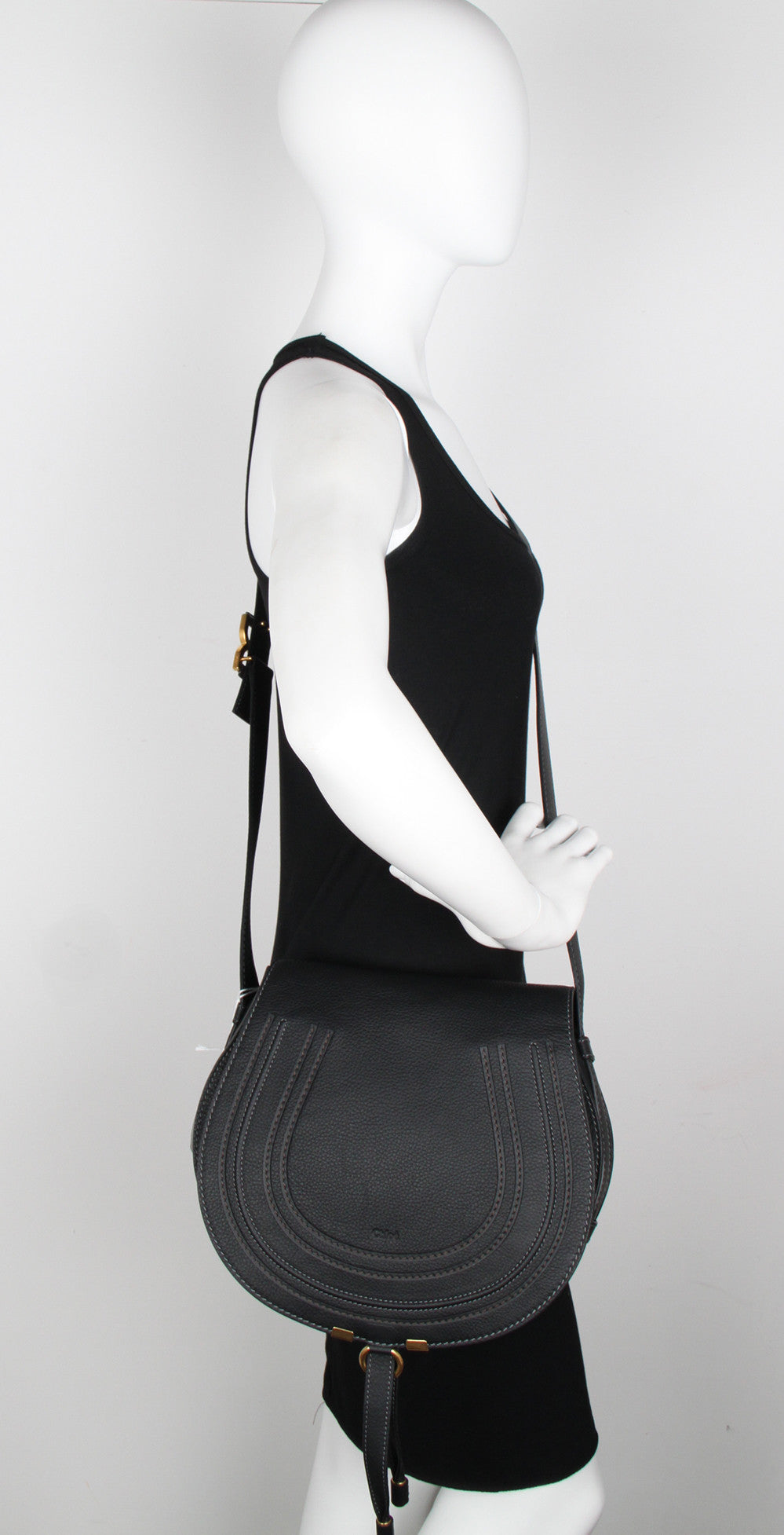 Genuine calfskin leather with canvas lining and gold-tone hardware. Comes with an adjustable shoulder strap and fold-over flap top with straps and buckle closure. Also comes with an interior pocket and front compartment. Made in Italy.