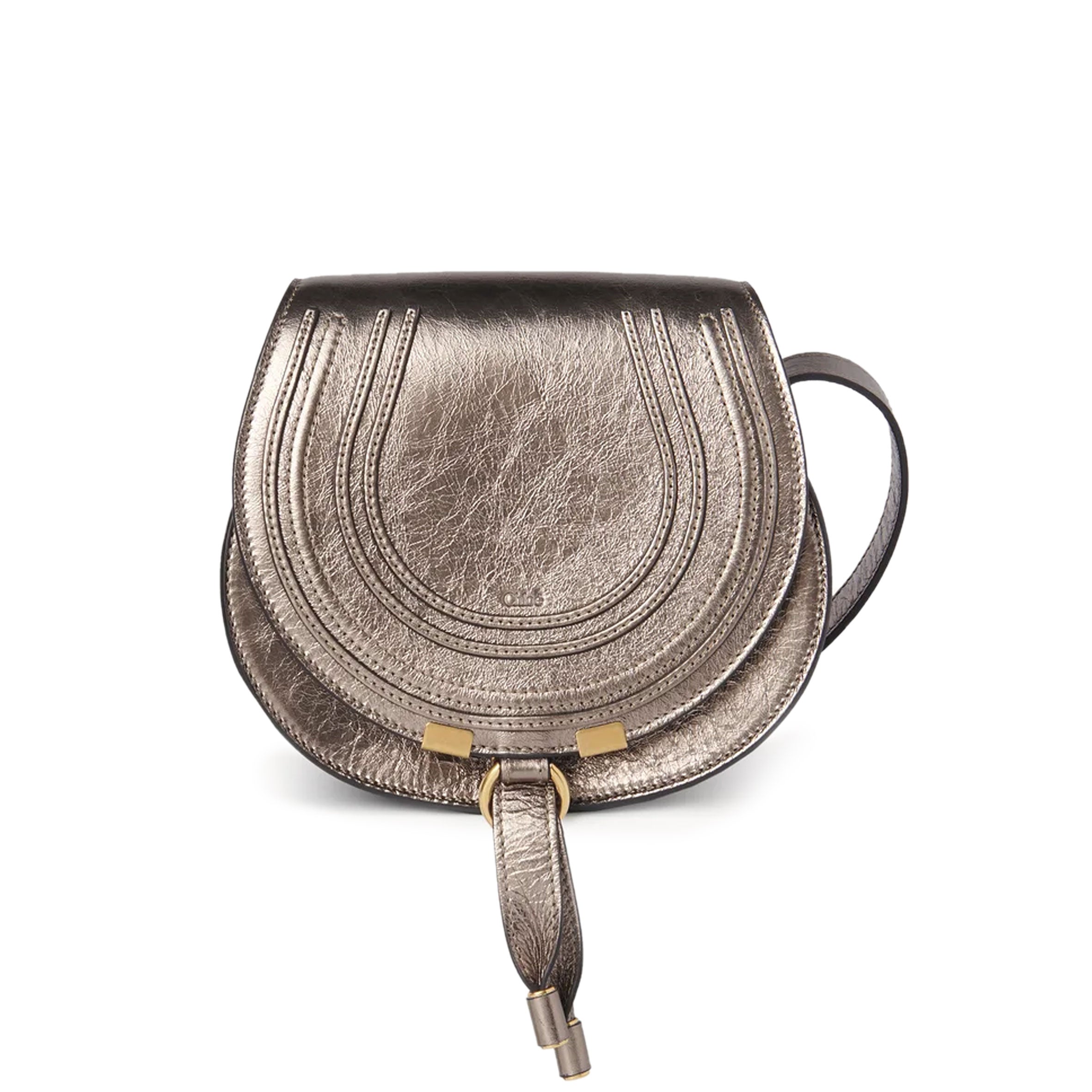 This version of Chloé’s iconic 'Marcie' shoulder bag has a metallic finish, perfect for casual evening events. Crafted from crinkled leather, it has a round shape and a front flap accented with signature horseshoe-inspired stitching.