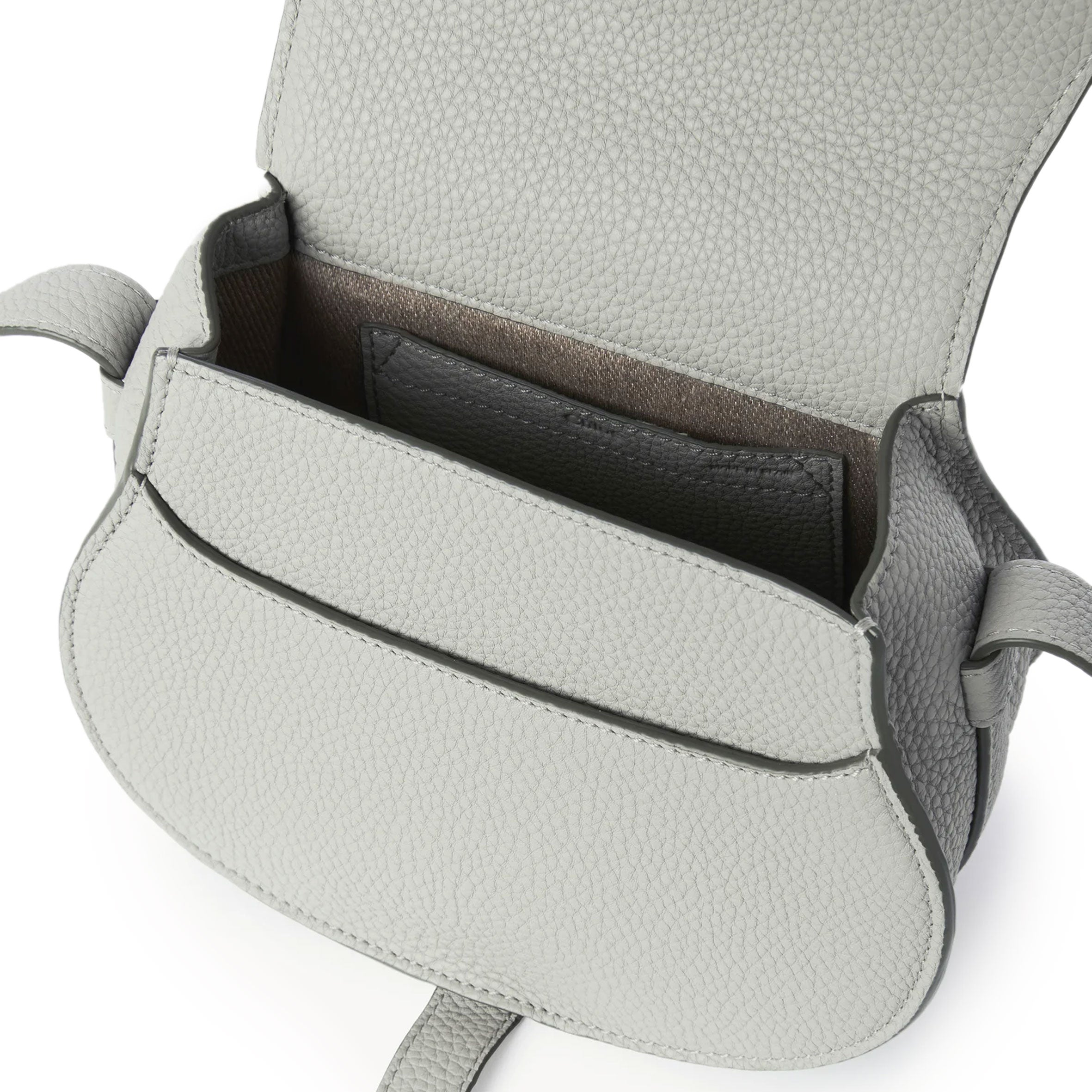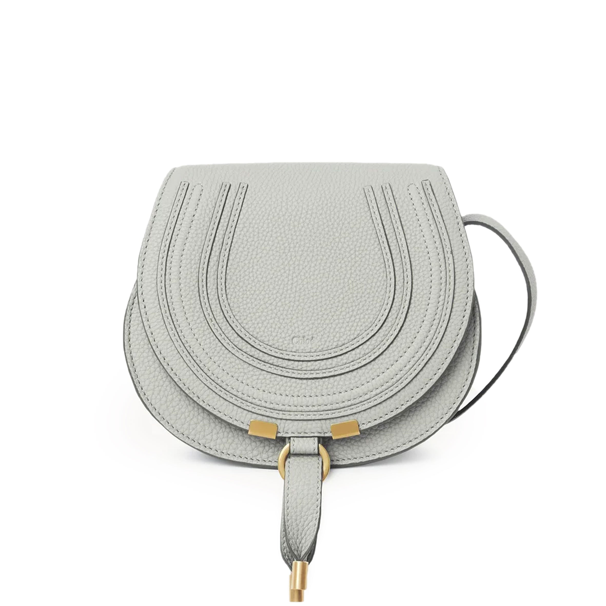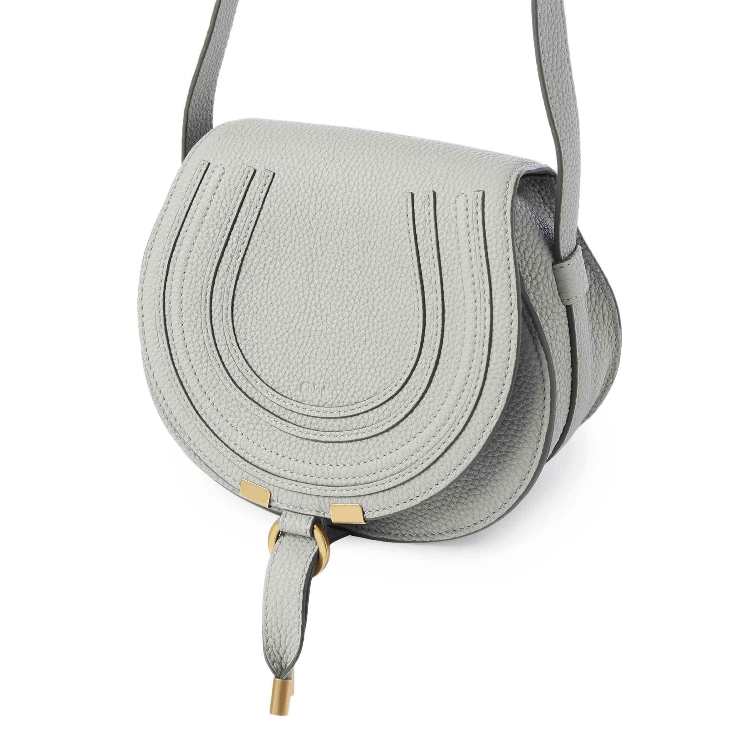 The Chloe mini 'Marcie' bag in robust grained leather comes with an adjustable leather strap. It closes with a petite loop through fastening in antique gold. This bag has one main compartment with and is lined with cotton. There is a slip front pocket and an internal flat card pocket. Finished with U shaped embellishments to reference Chloe's signature horse references.