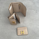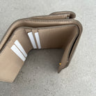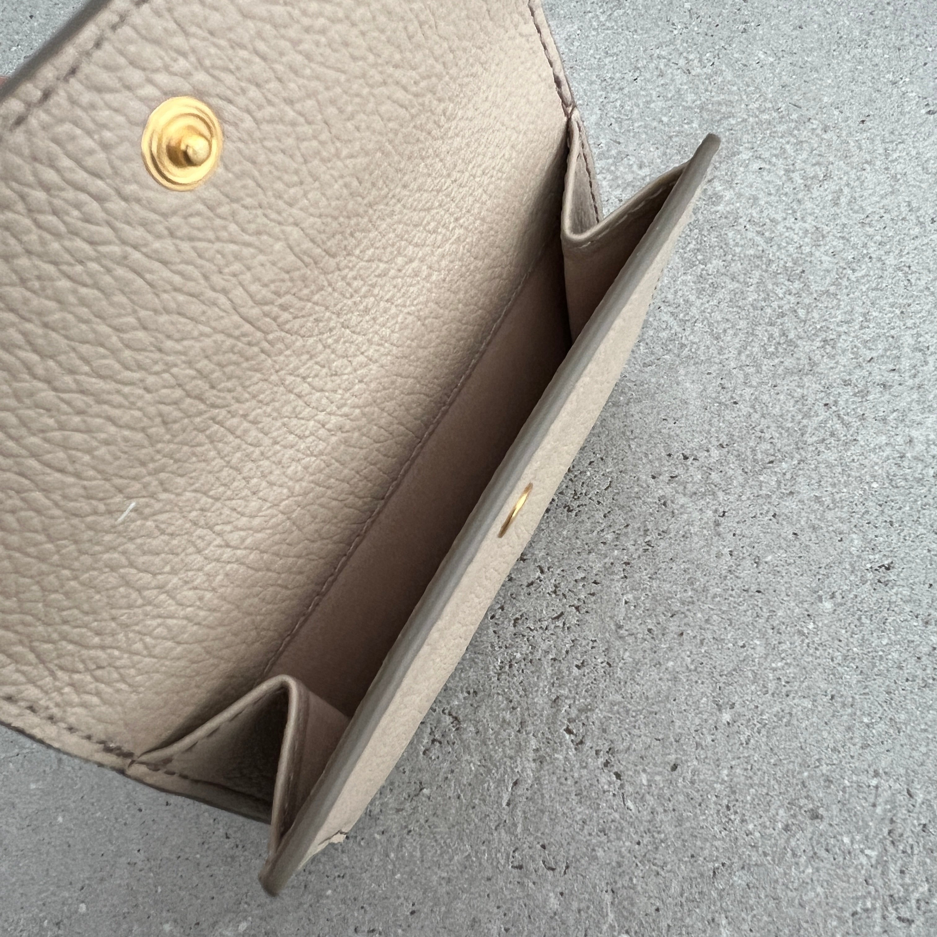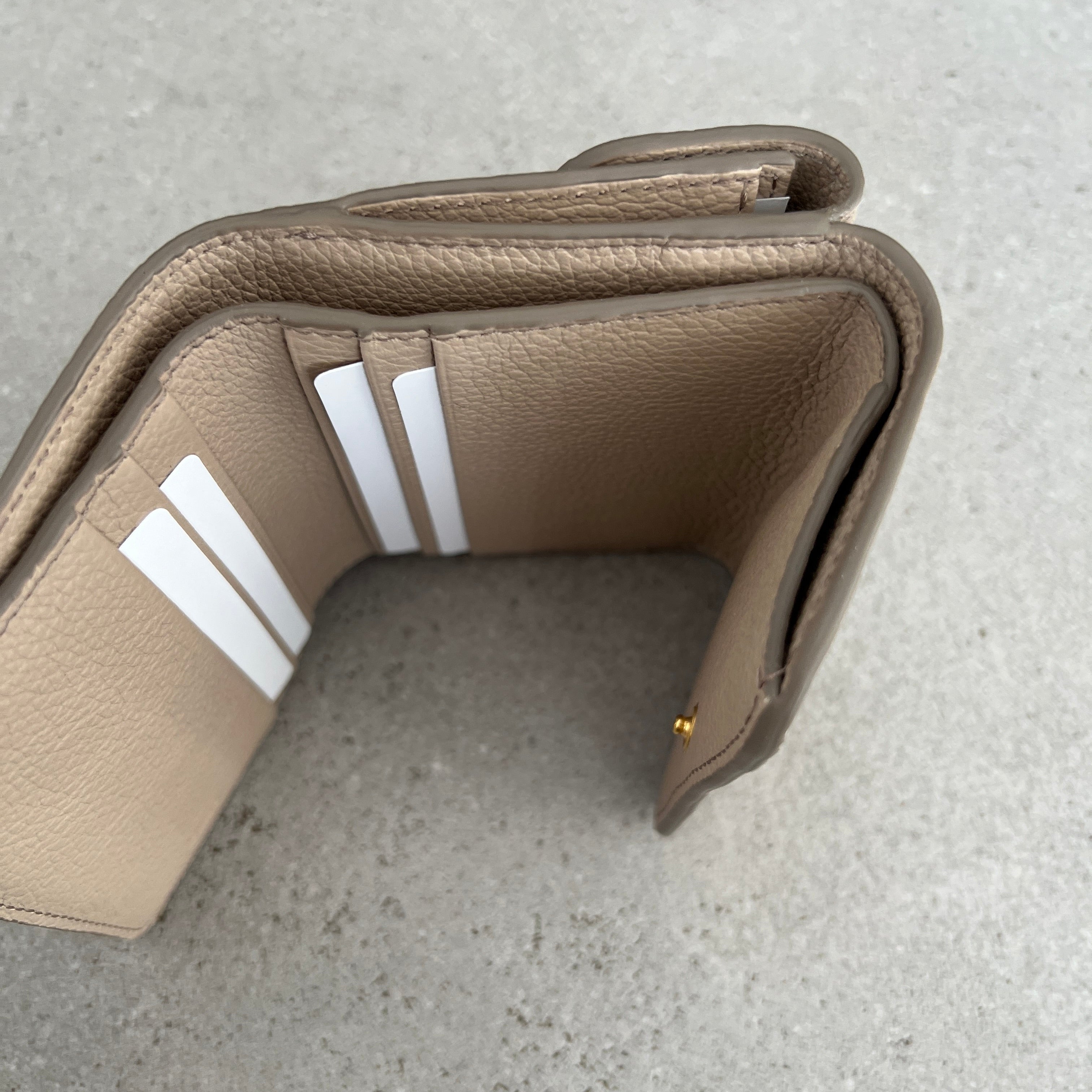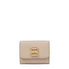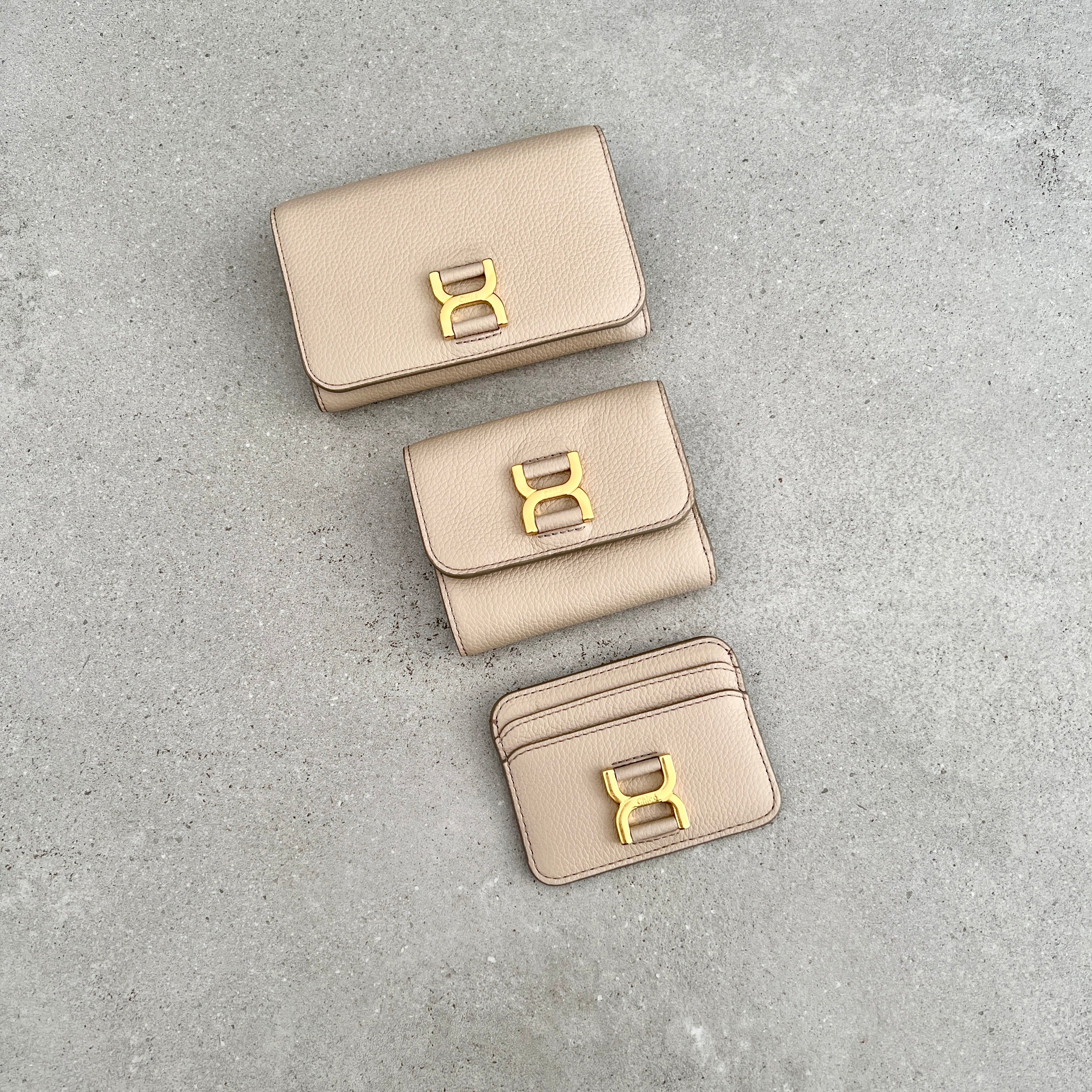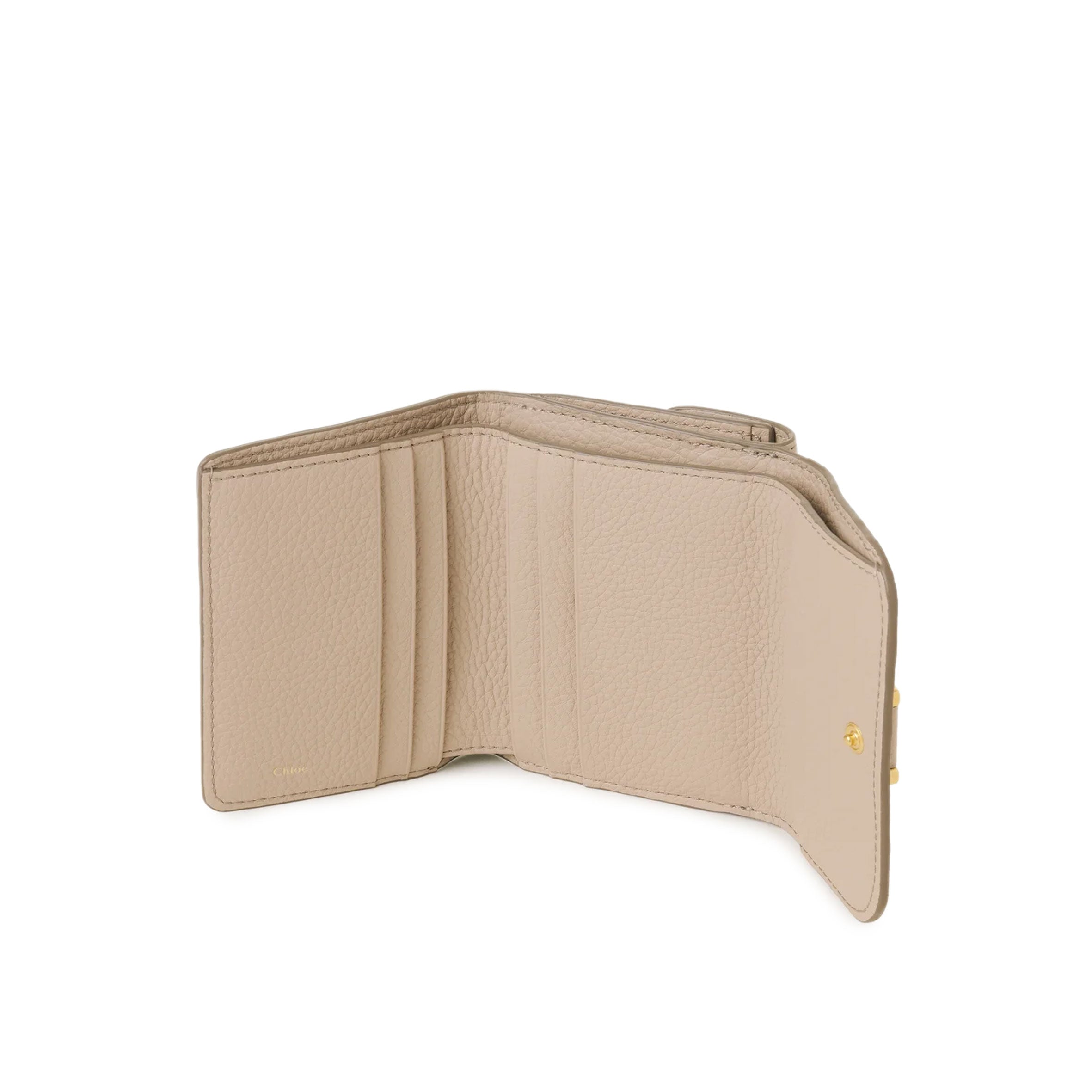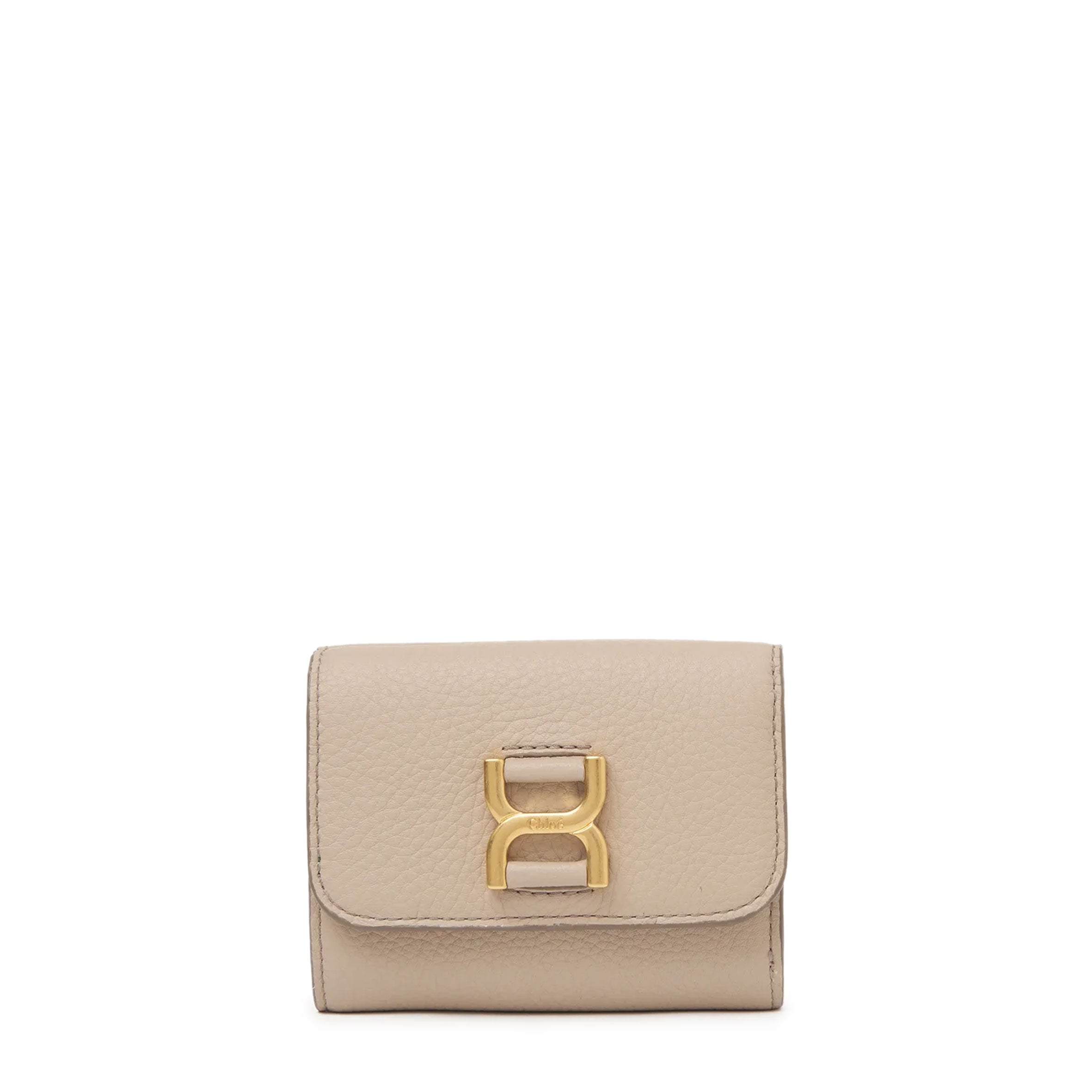 The Maison's iconic Marcie line is updated with this small tri-fold wallet, crafted from Chloé's signature soft, grained calfskin. Perfectly sized to hold the essentials, it has an elegant design that snaps open to reveal a compact yet organized interior. The front flap is embellished with a distinctive metallic piece linked to the 70s-inspired Marcie bag, while the subtle embossed Chloé logo adds a finishing touch.