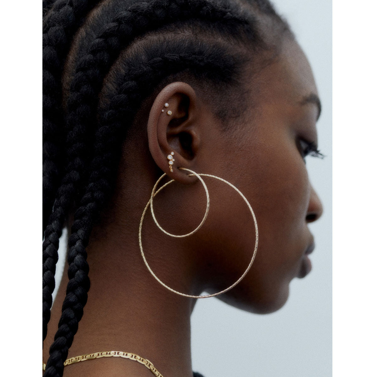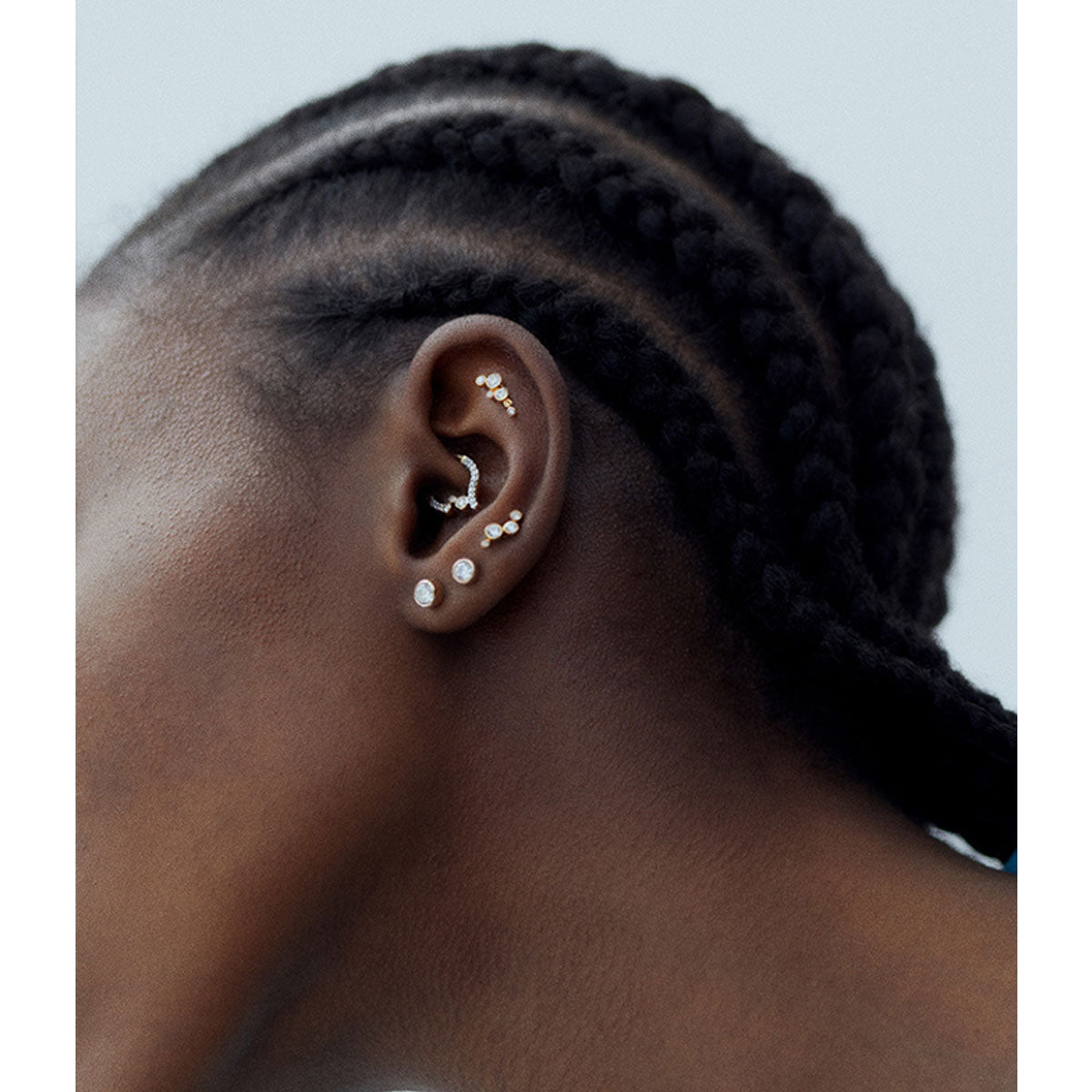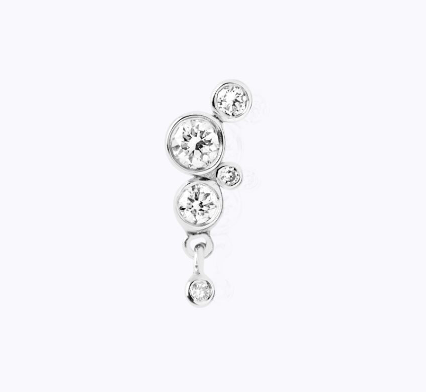 An elegant and organic wave-shaped earring in the company of seven shiny diamonds. Stands out as an upper lobe earring and would look especially nice as a stacked flat piercing with two next to each other.