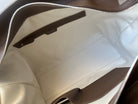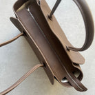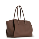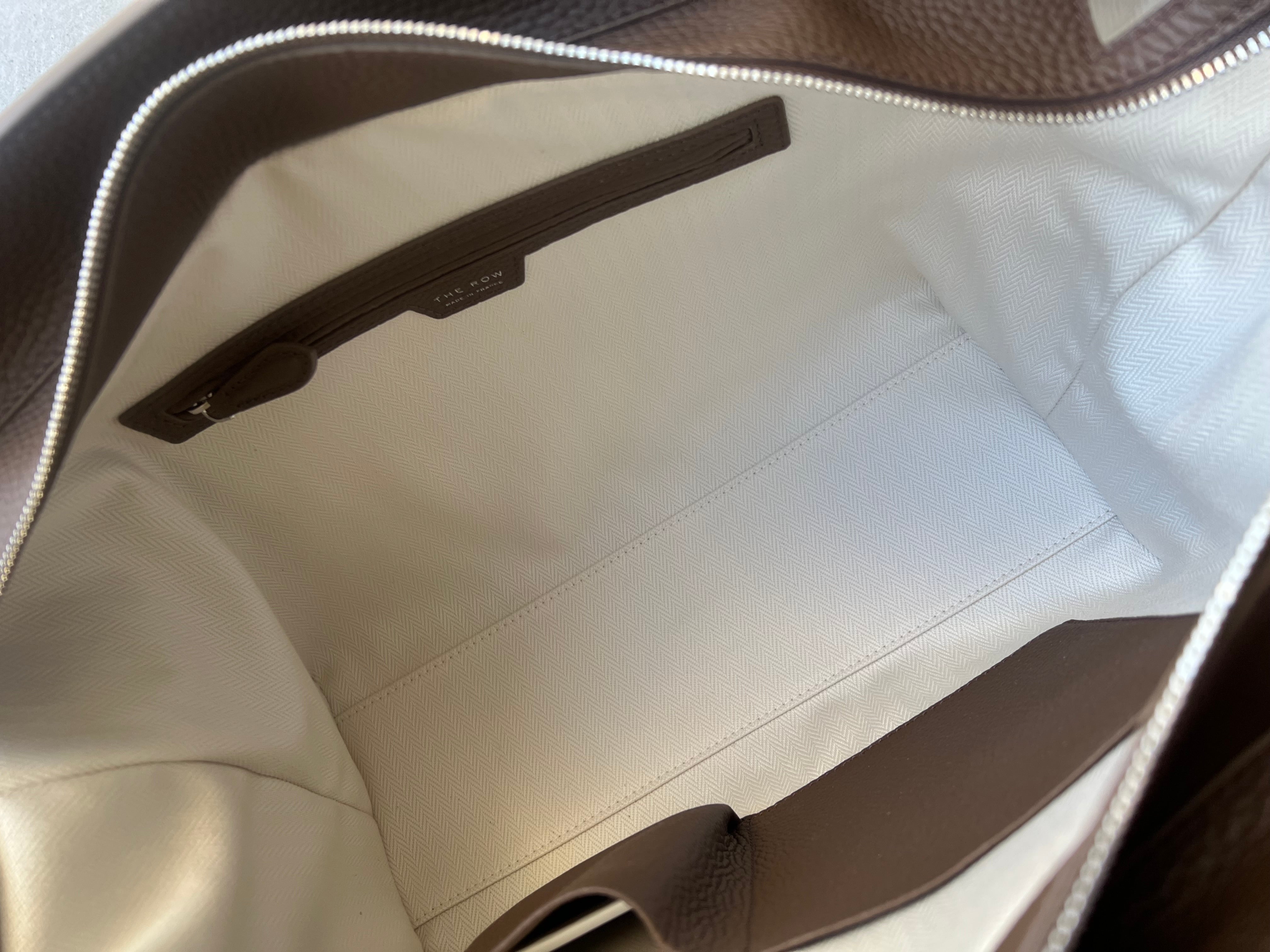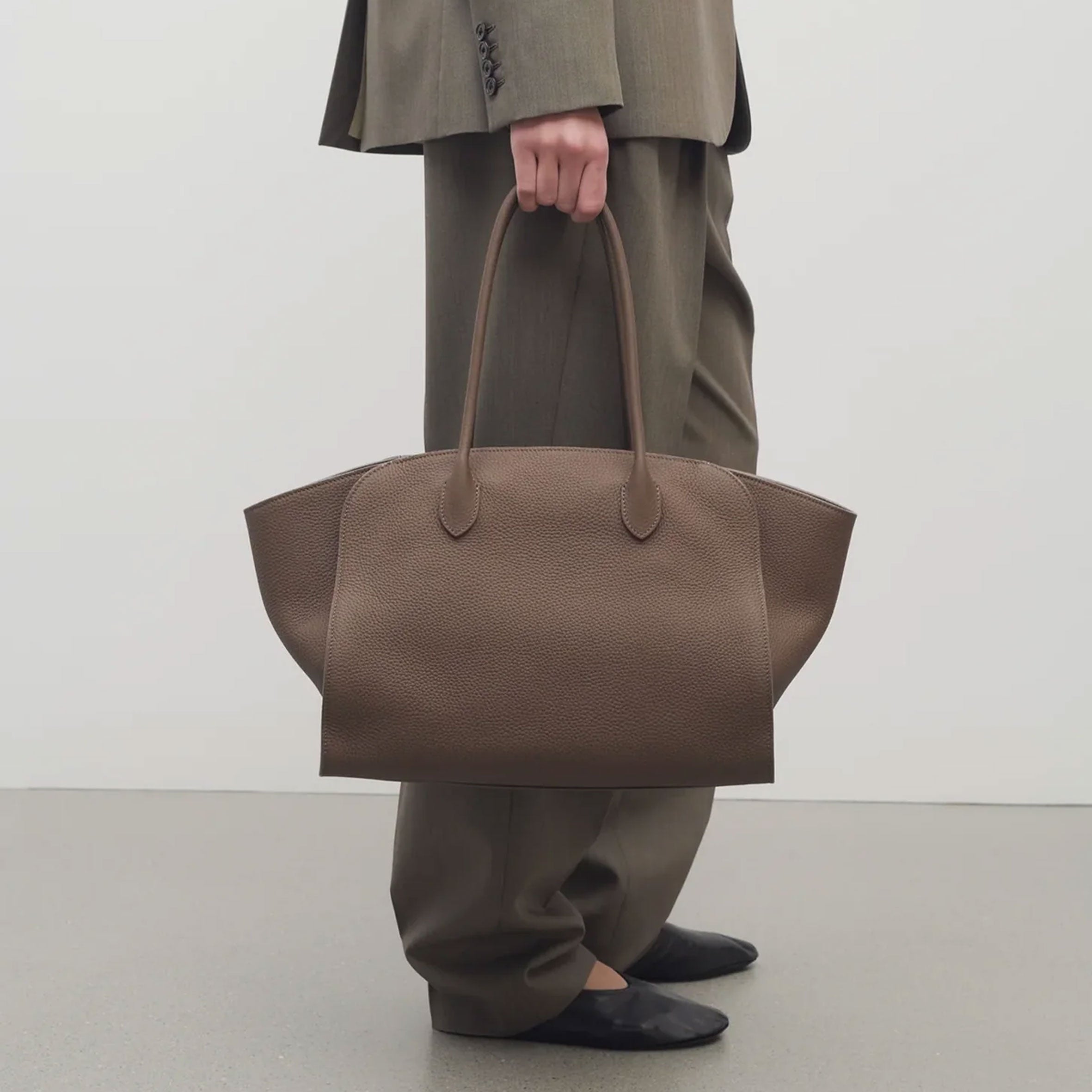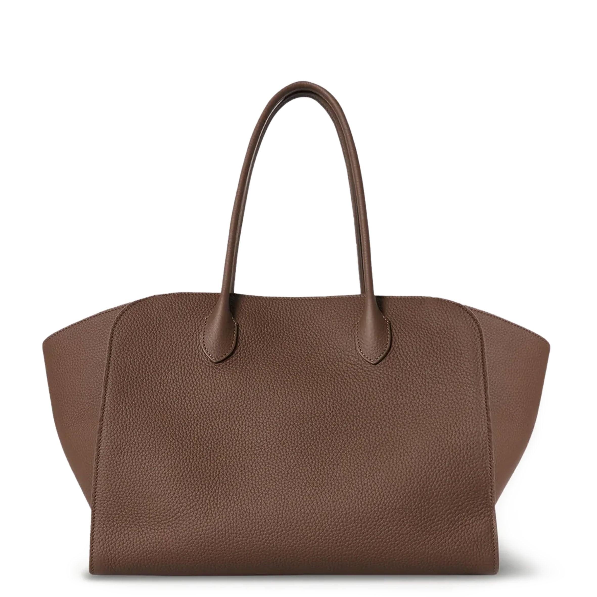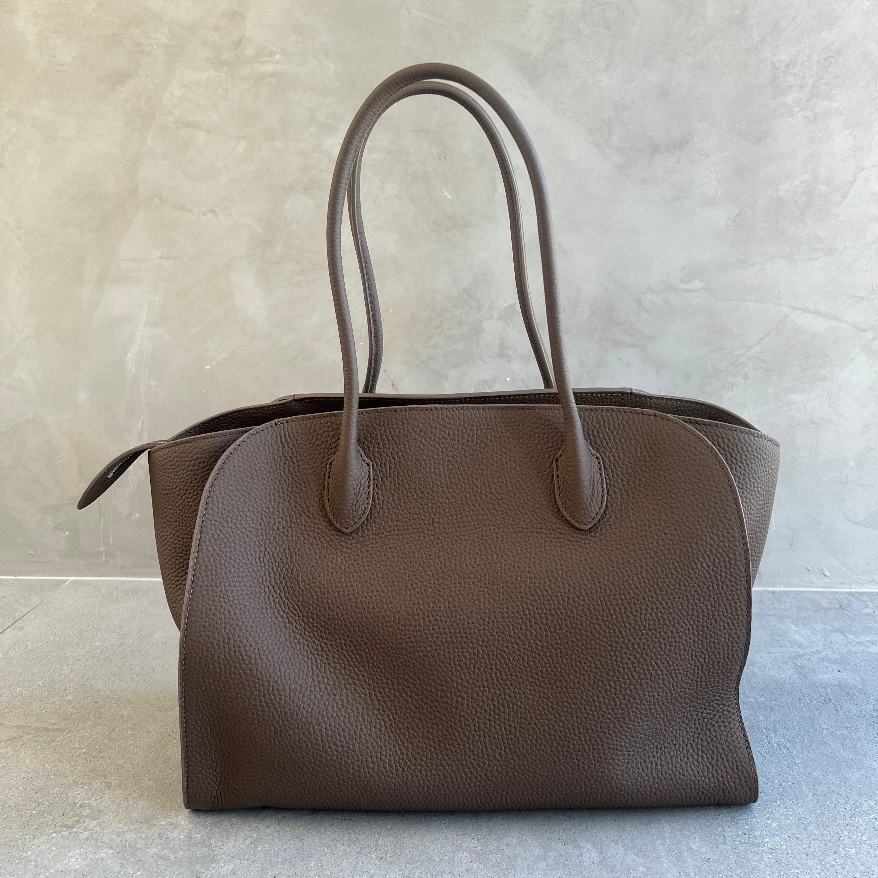 Softly structured tote bag in grained leather with tubular handles, gusseted side panels, and top zipper closure.