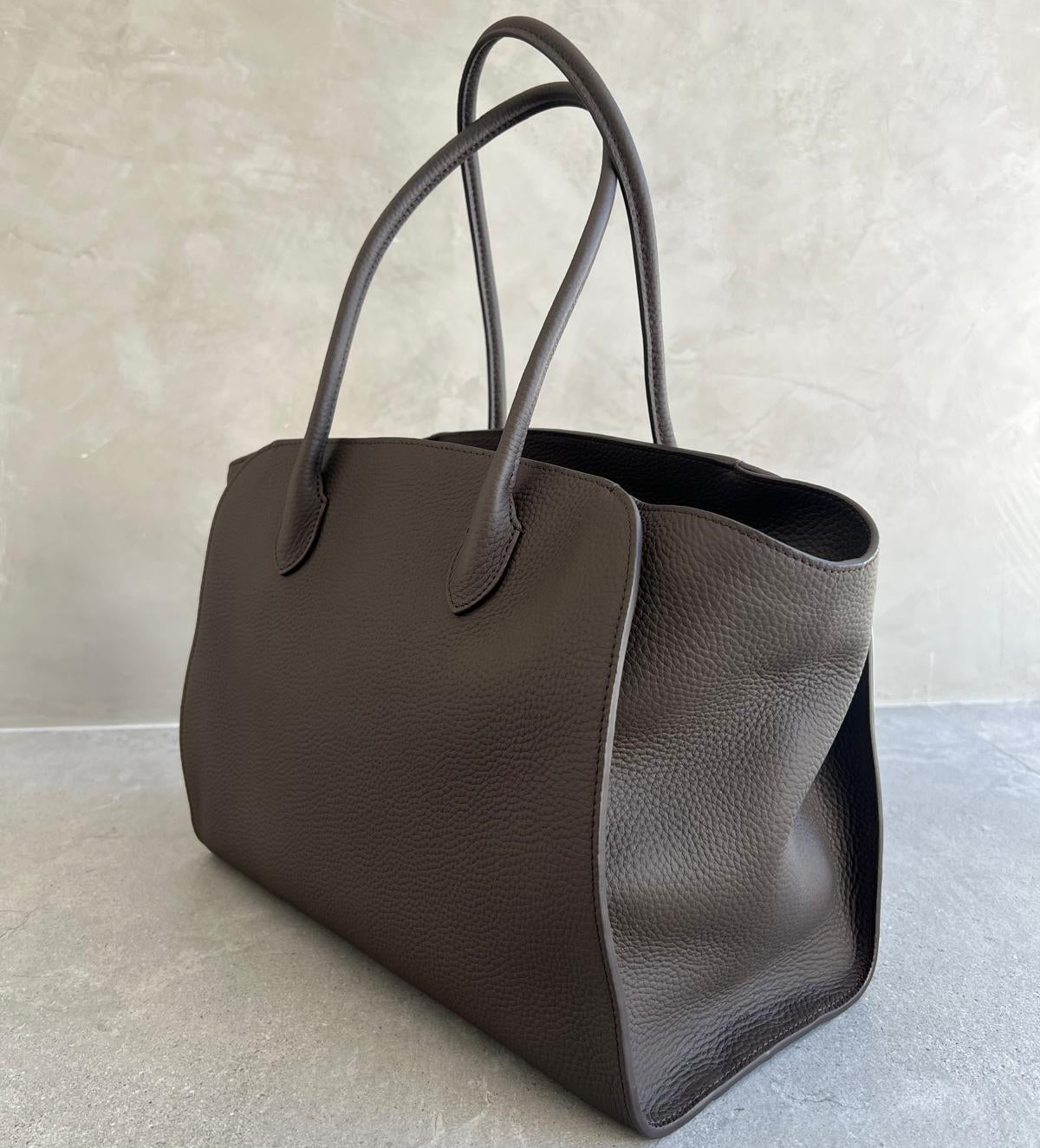 Softly structured tote bag in grained leather with tubular handles, gusseted side panels, and top zipper closure.