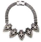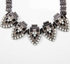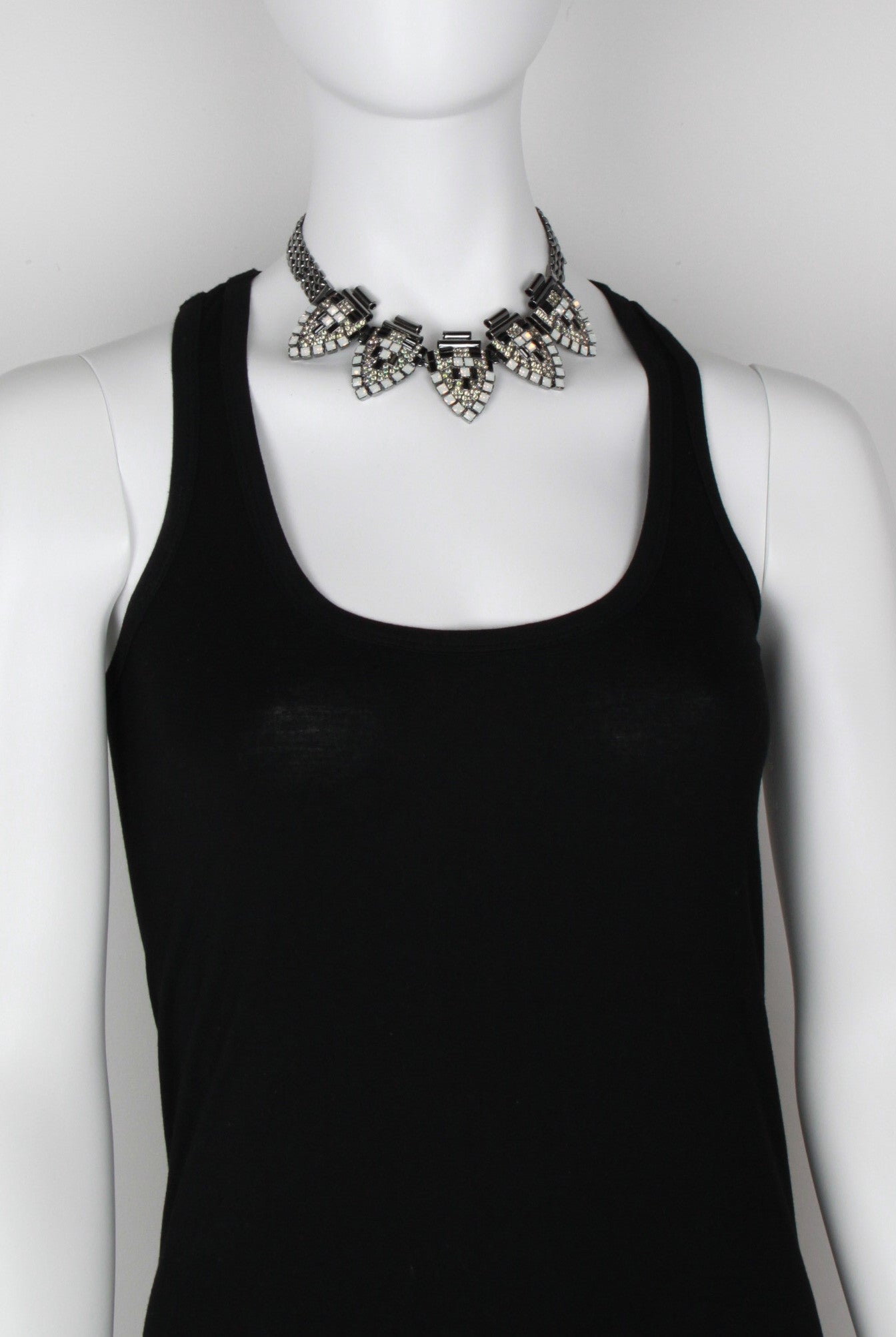 Hematite plated chain weave necklace with linked deco arrowhead motifs with tubing featuring geometric jet Swarovski and mixed crystals.