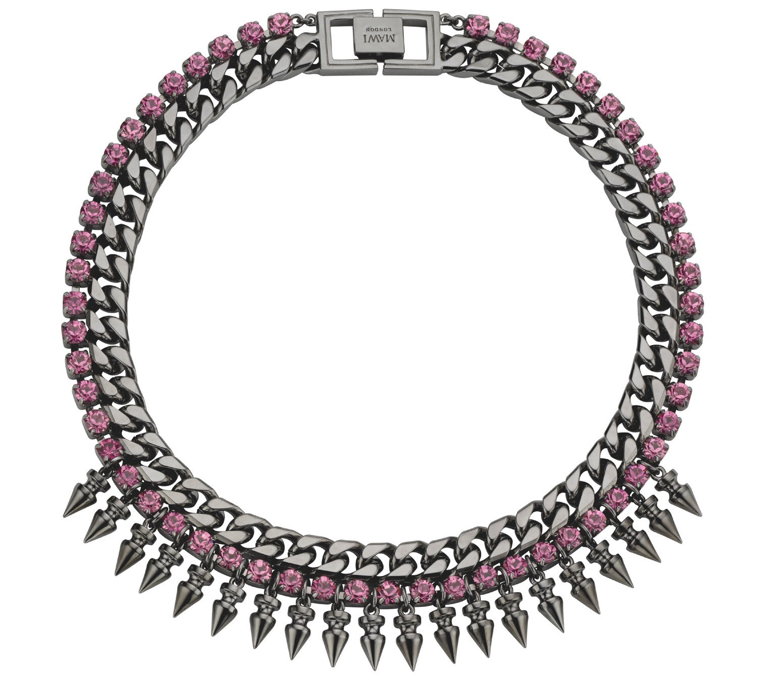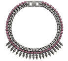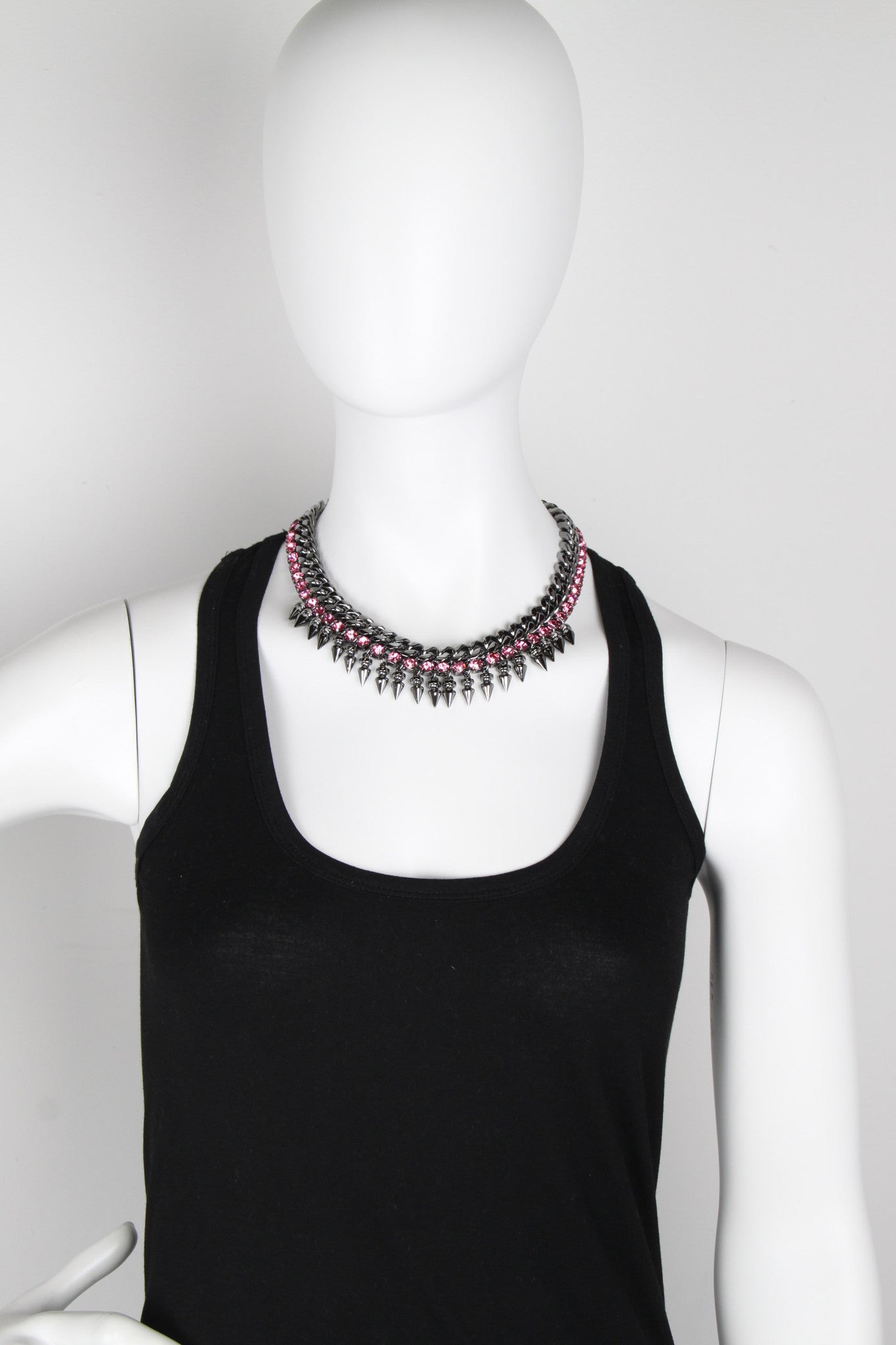 Crystal and Spike Necklace In Hematite by Mawi. Chunky chain necklace edged with square pink crystals and dangling metal spike detailing. Designer inscribed clasp fastening at rear. Total length: 45cm approx.