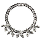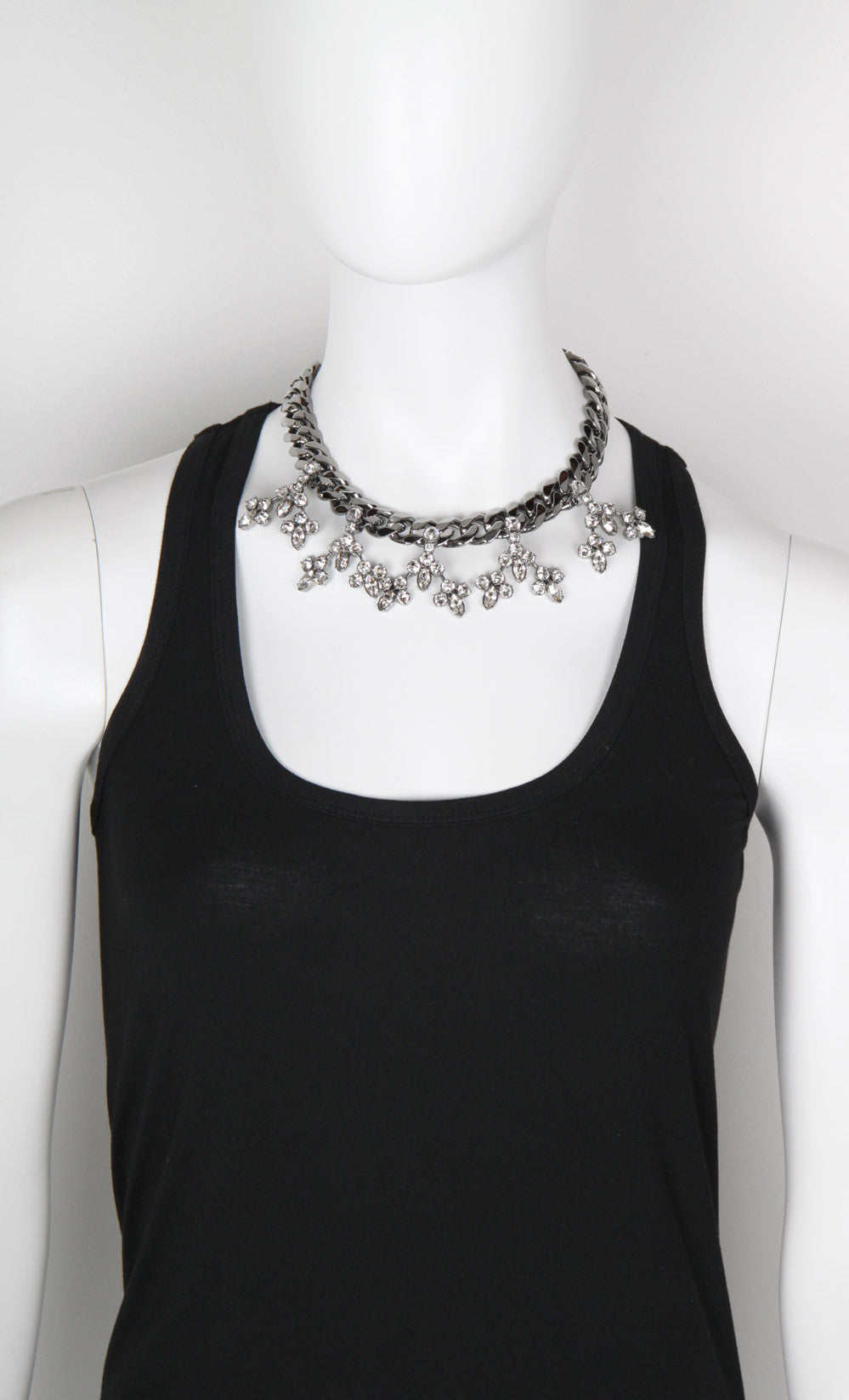Hematite plated necklace with clear crystal blossoms. Designer inscribed clasp fastening at rear.