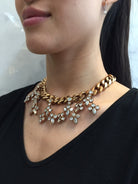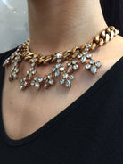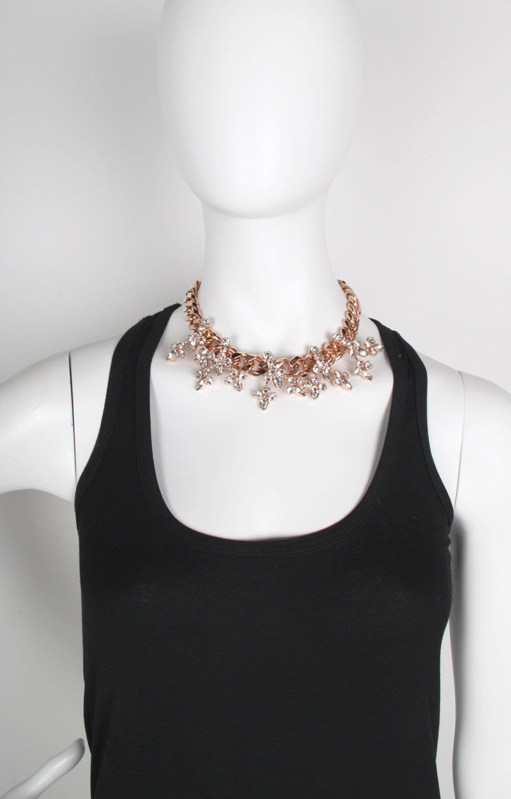 Rose gold plated necklace with clear crystal blossoms. Designer inscribed clasp fastening at rear.