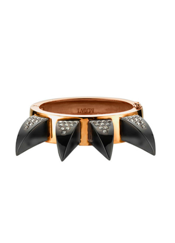 This Rose gold plated claw cuff has four contrasting gunmetal deco fangs which are encrusted with clear crystals. It will work with a host of looks - from simple separates to statement cocktail dresses.
