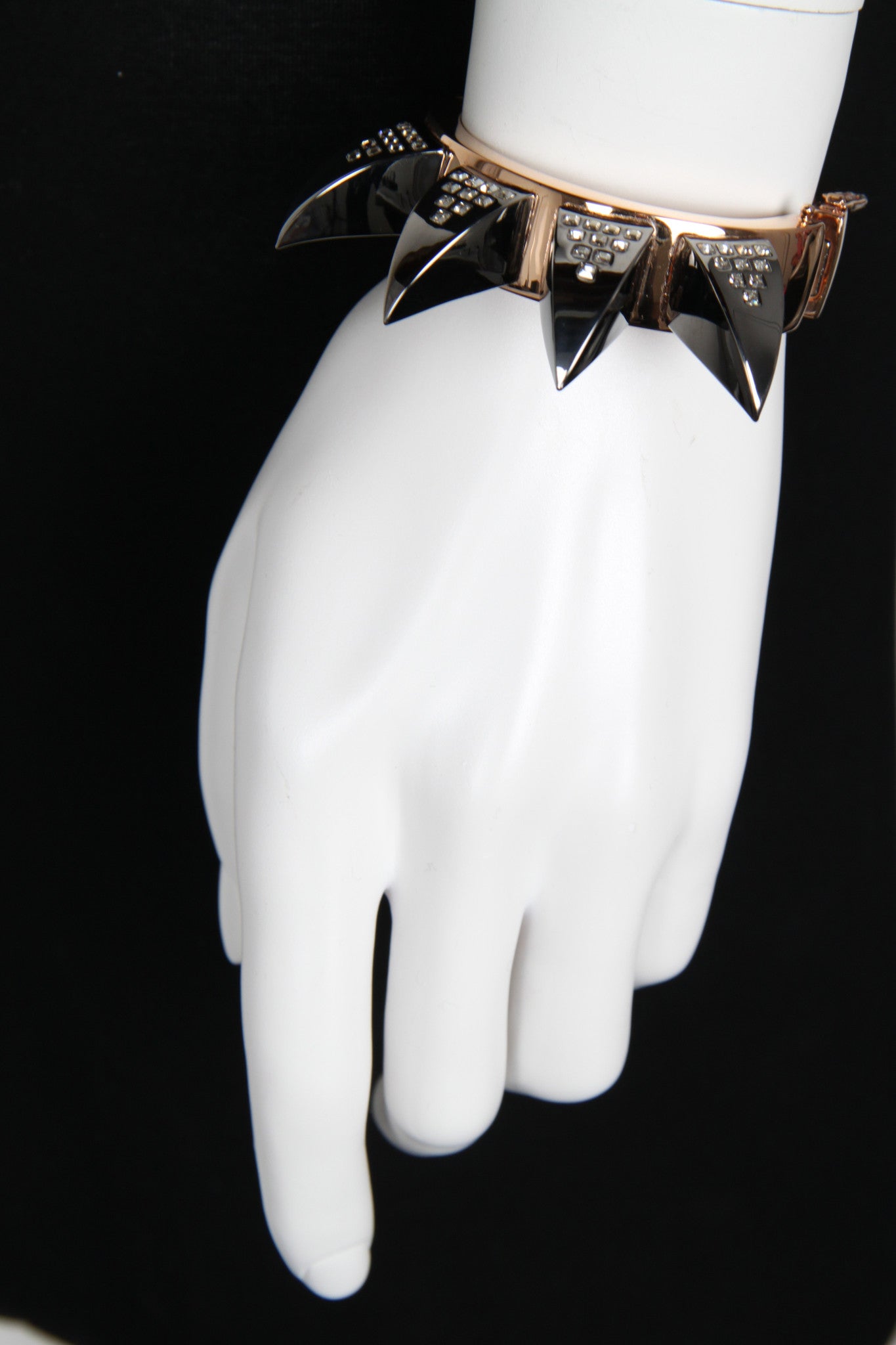 Rose gold plated, multi fang design, clear Swarovski crystals, magnetic closure and safety clip.Details