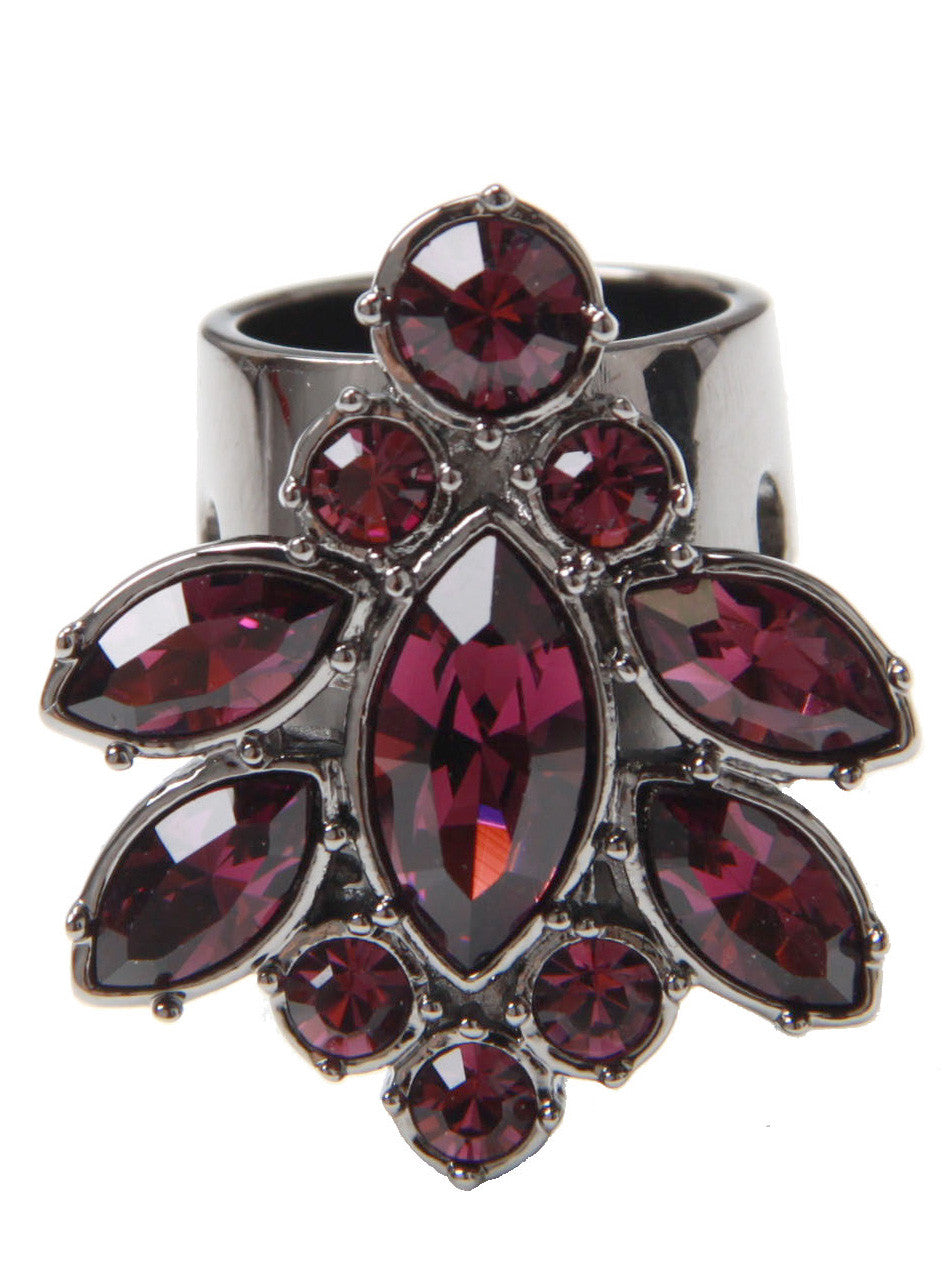 Hematite plated ring featuring Purple nymph crystal motif and razor blade band detail.