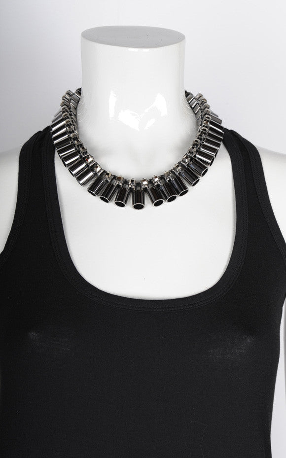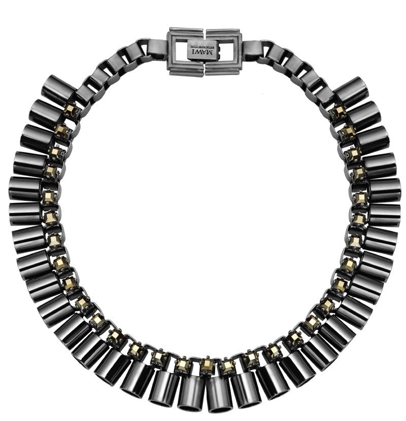 MAWI's signature Sun Ray Tube necklace has been updated bigger and bolder. Hematite-plated tube necklace. Swarovski crystal embellishment. Fold-over clasp fastening. Designer-stamped box clasp closure in hematite-plated brass and crystals.